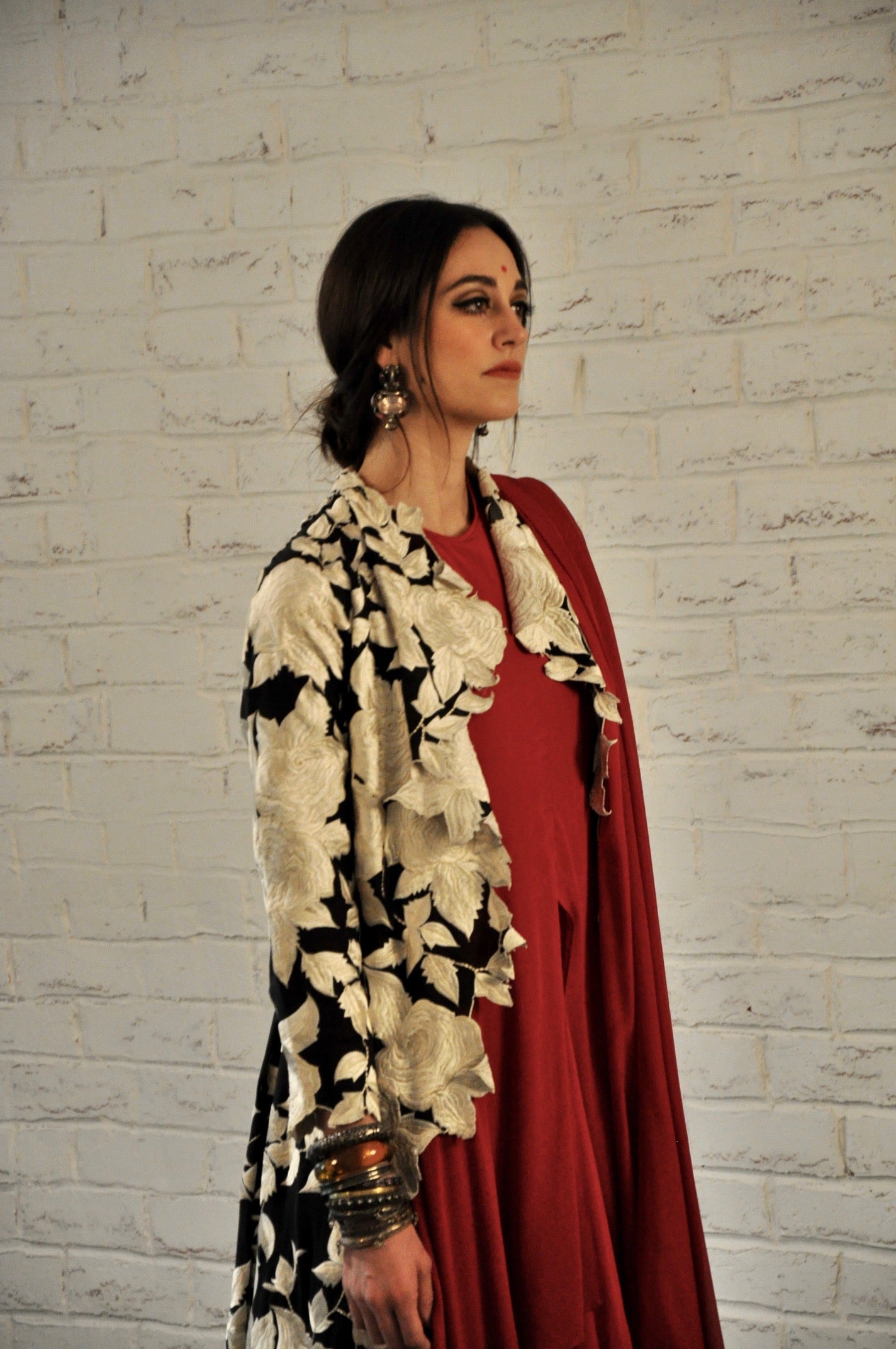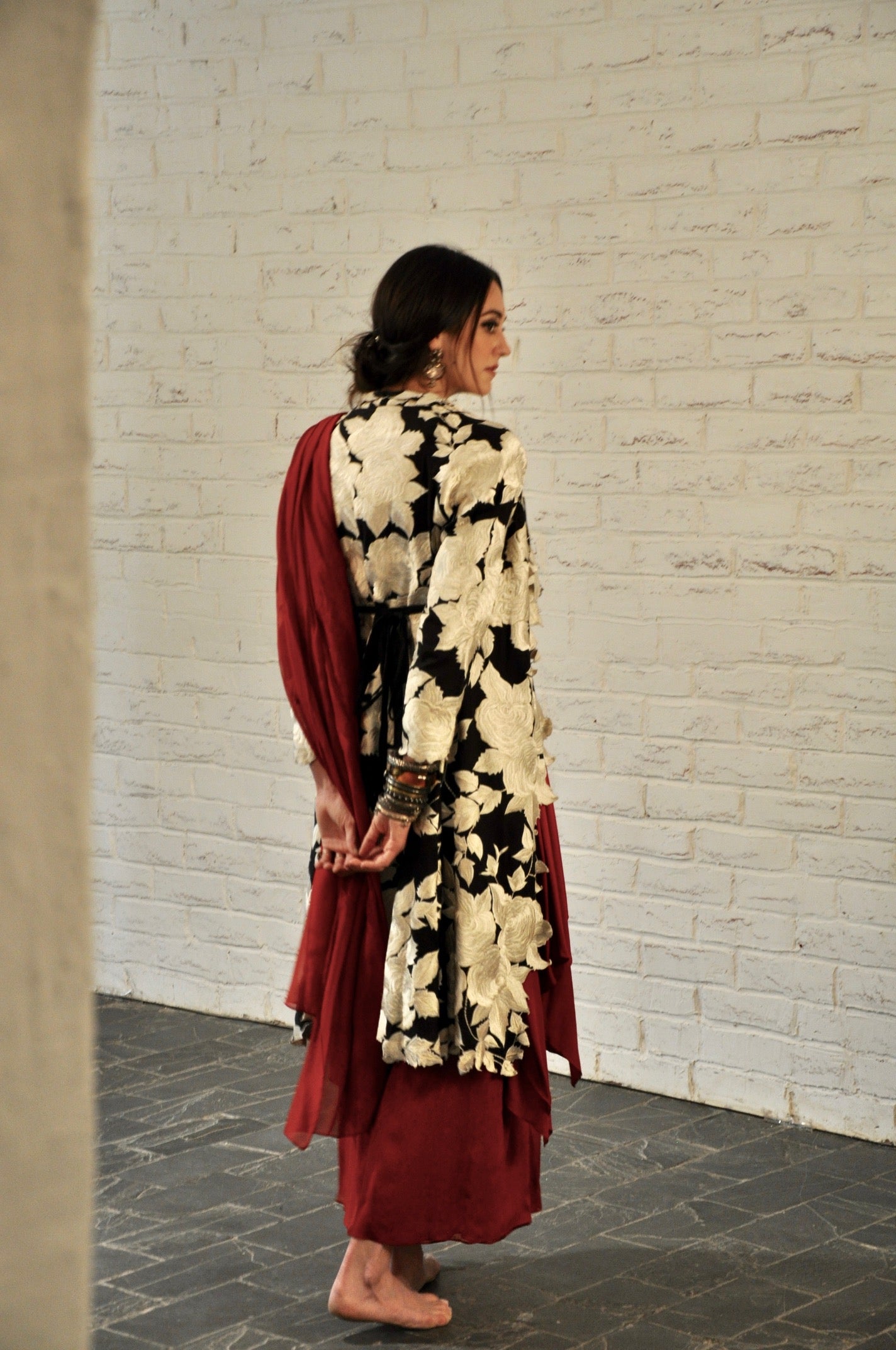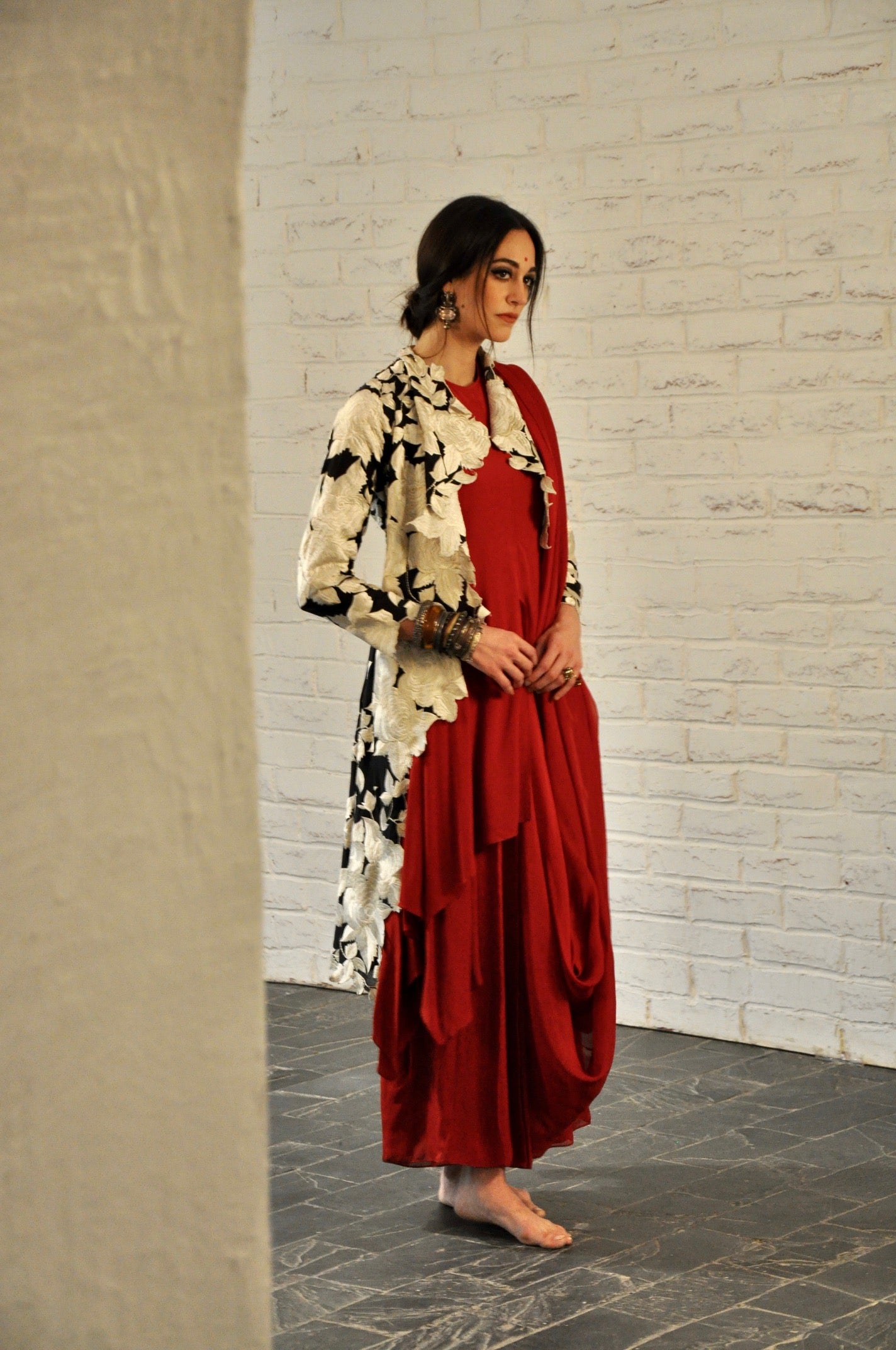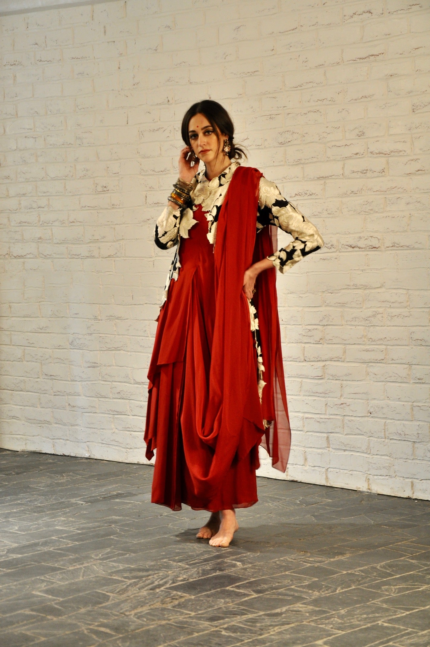 A Crepe and chiffon pre-draped sari inspired dress in shades of red is worn with a black modal floral embroidered layover tied at the back.
