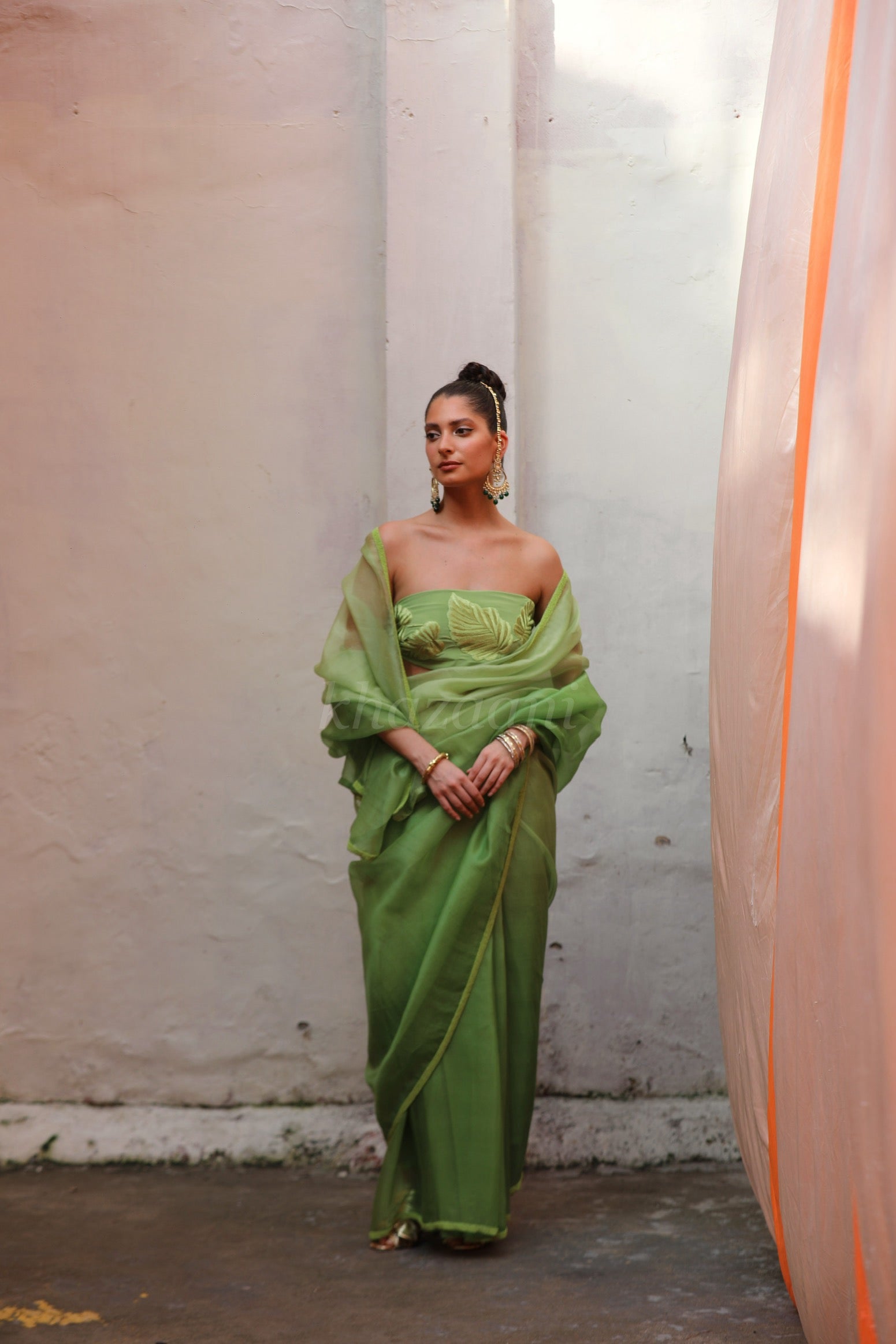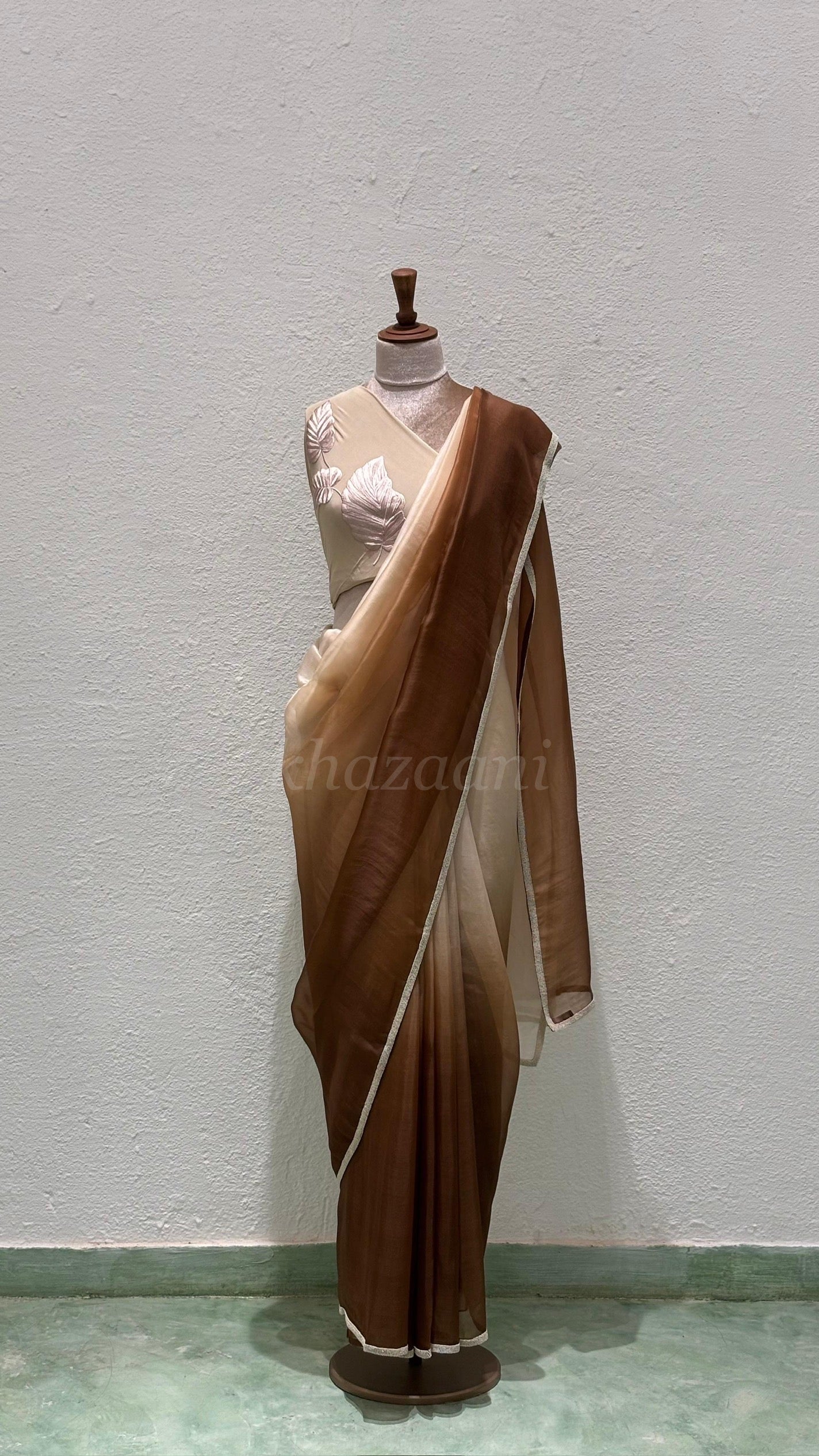 The sari comes with an embroidered unstitched blouse and fabric for petticoat.