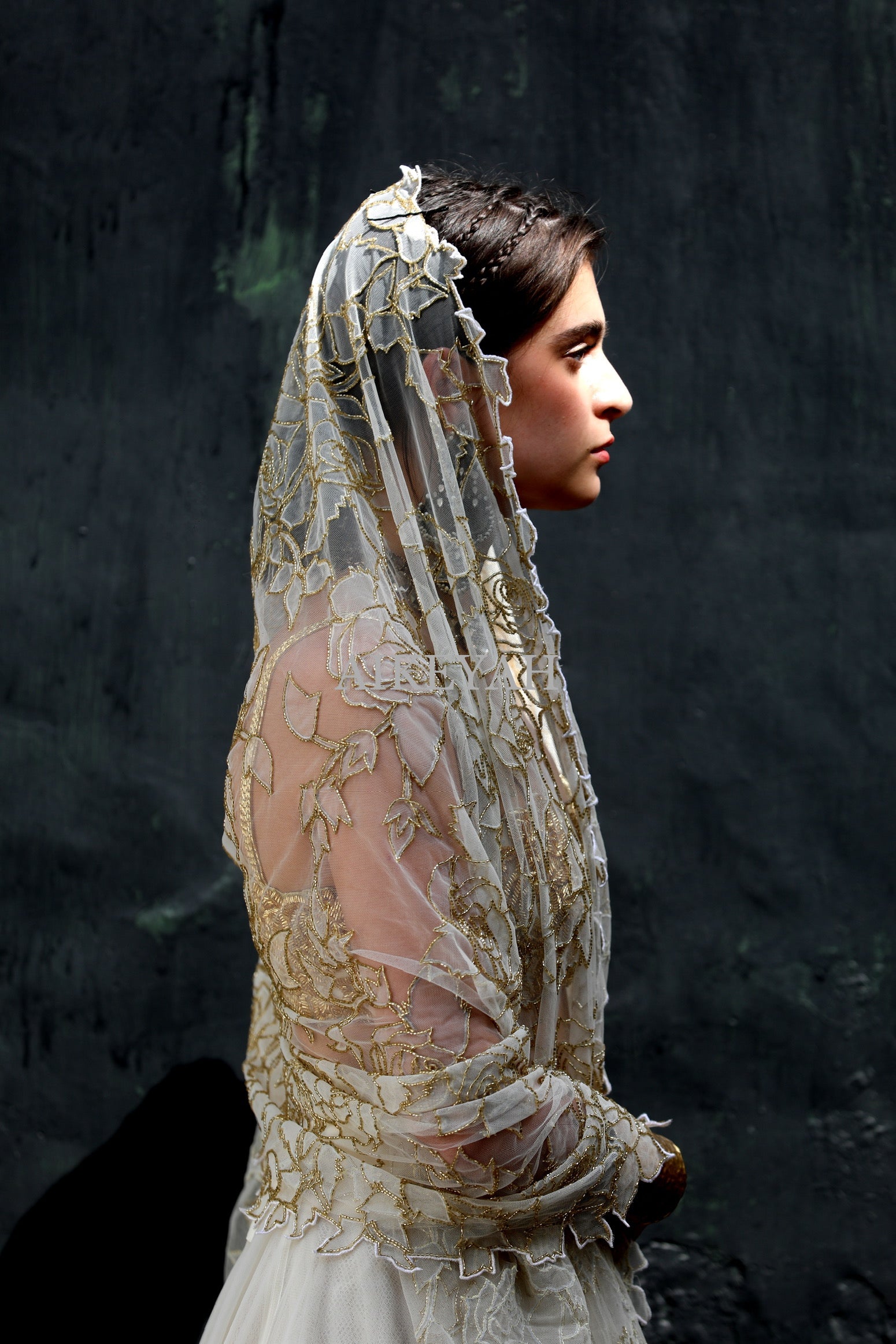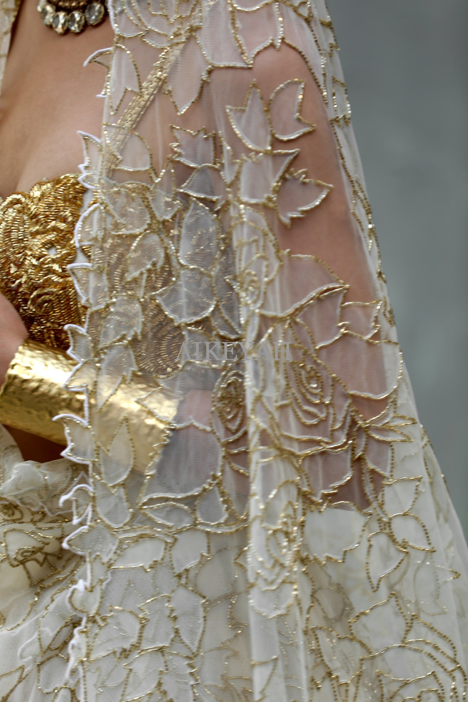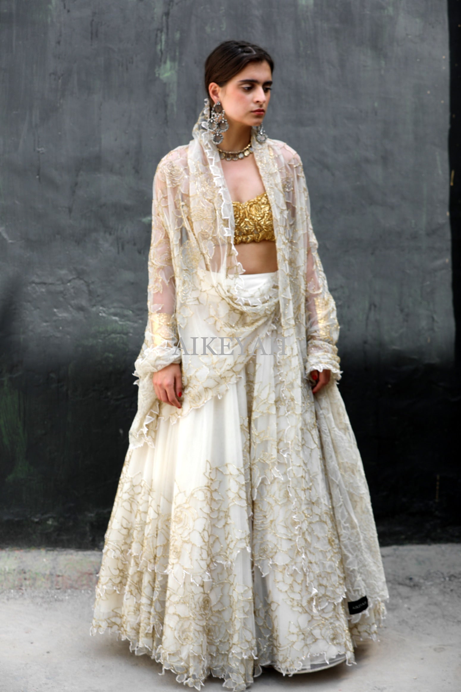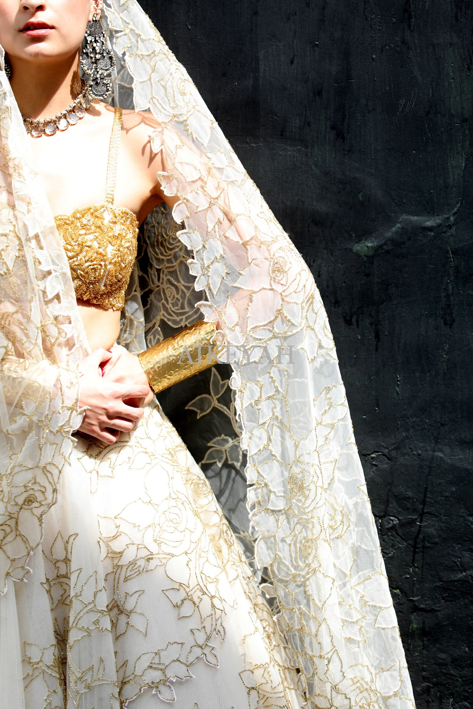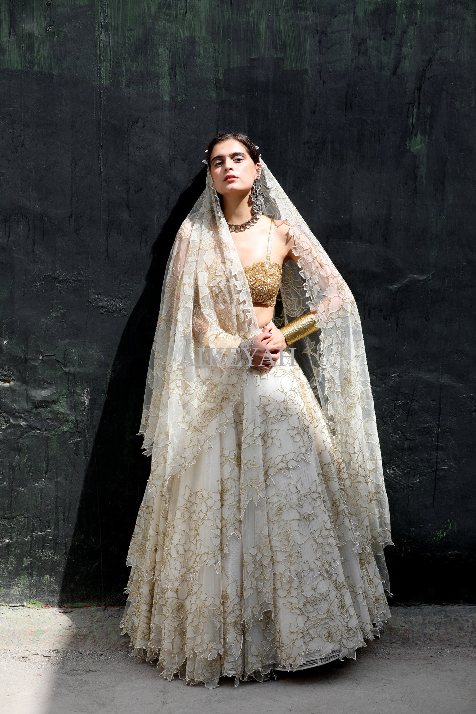A tulle tiered applique lehenga highlighted with gold bugle beads worn with a gold signature floral bralette and an applique highlighted dupatta.