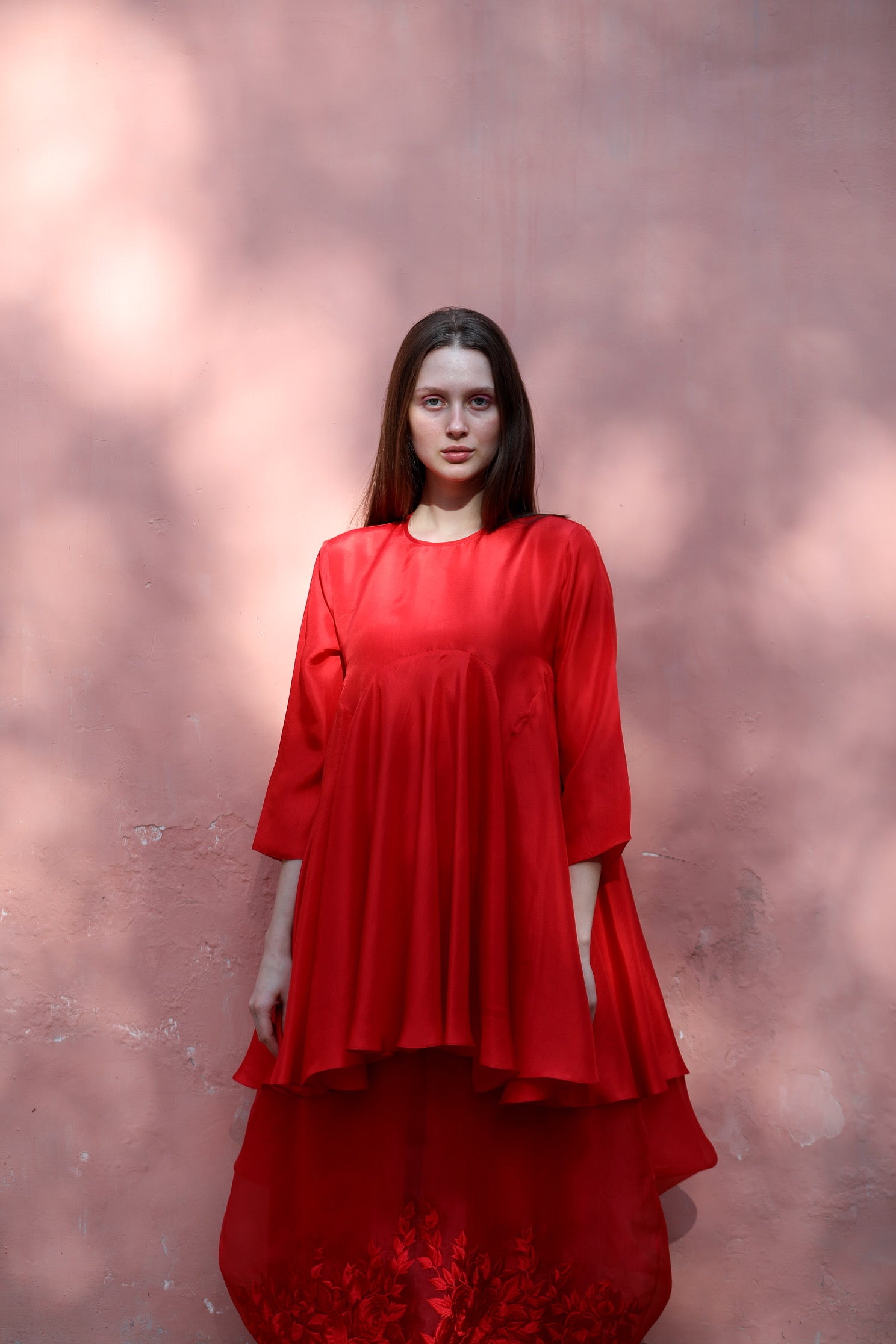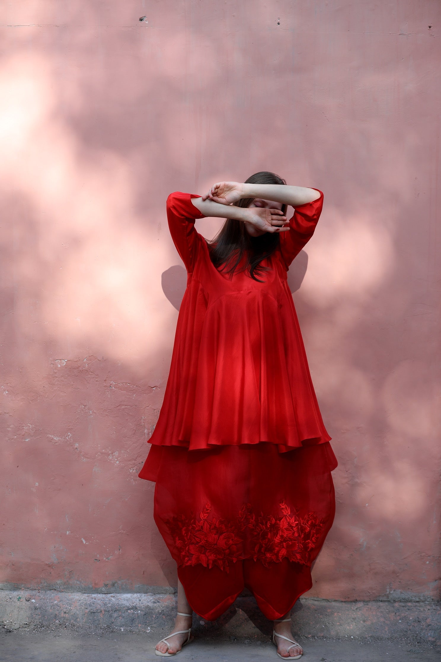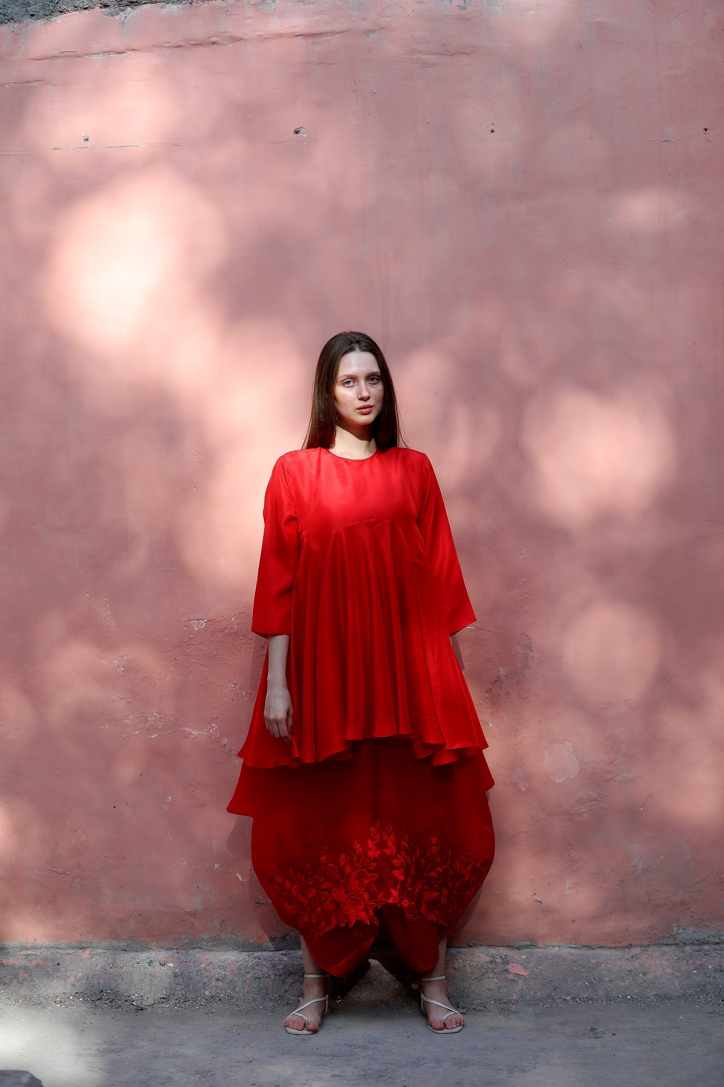 Silk/ organza double layered tunic embroidered at the hemline with floral thread embroidery worn with signature low crotch mashru silk pants.