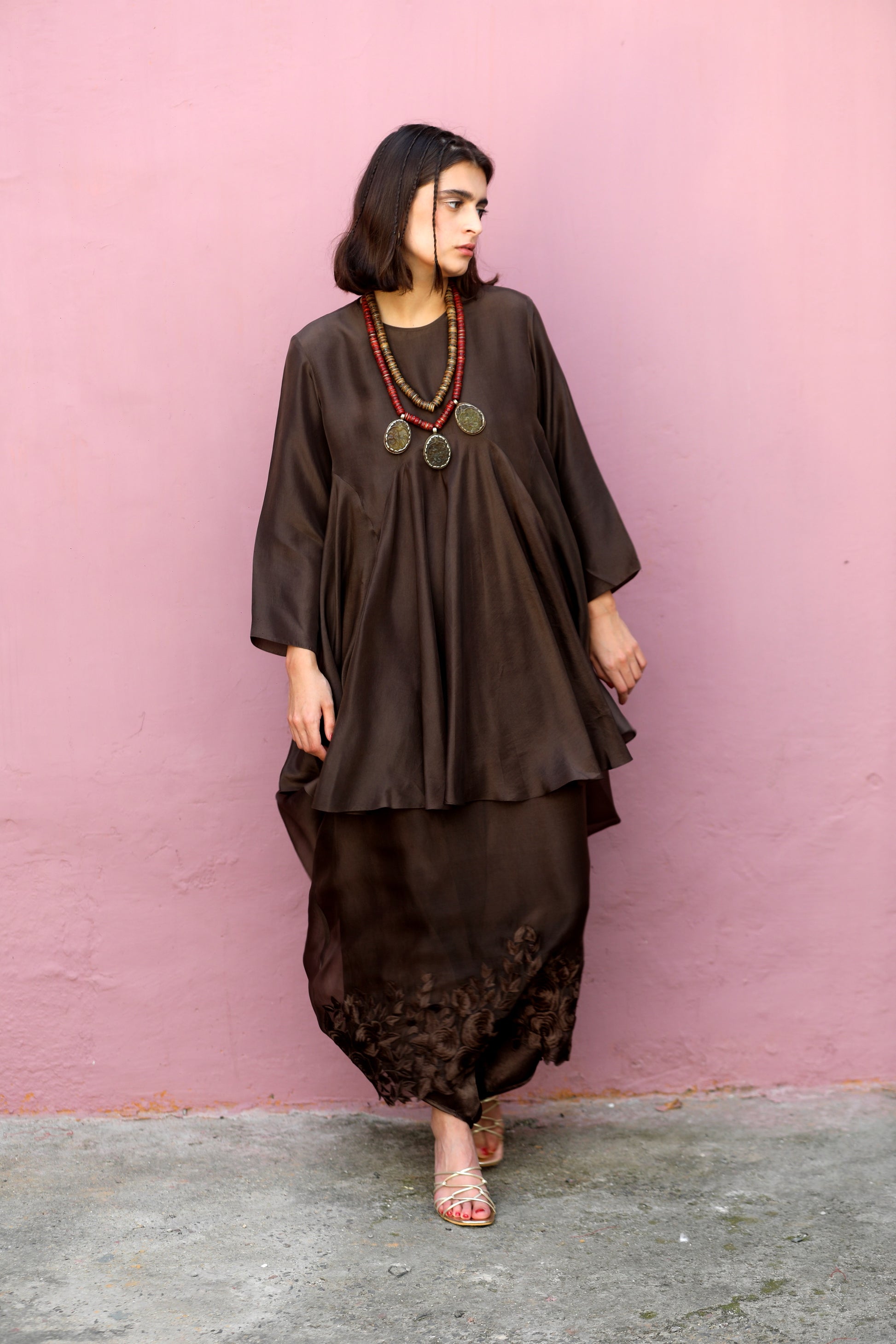Silk/ organza double layered tunic embroidered at the hemline with floral thread embroidery worn with signature low crotch mashru silk pants.