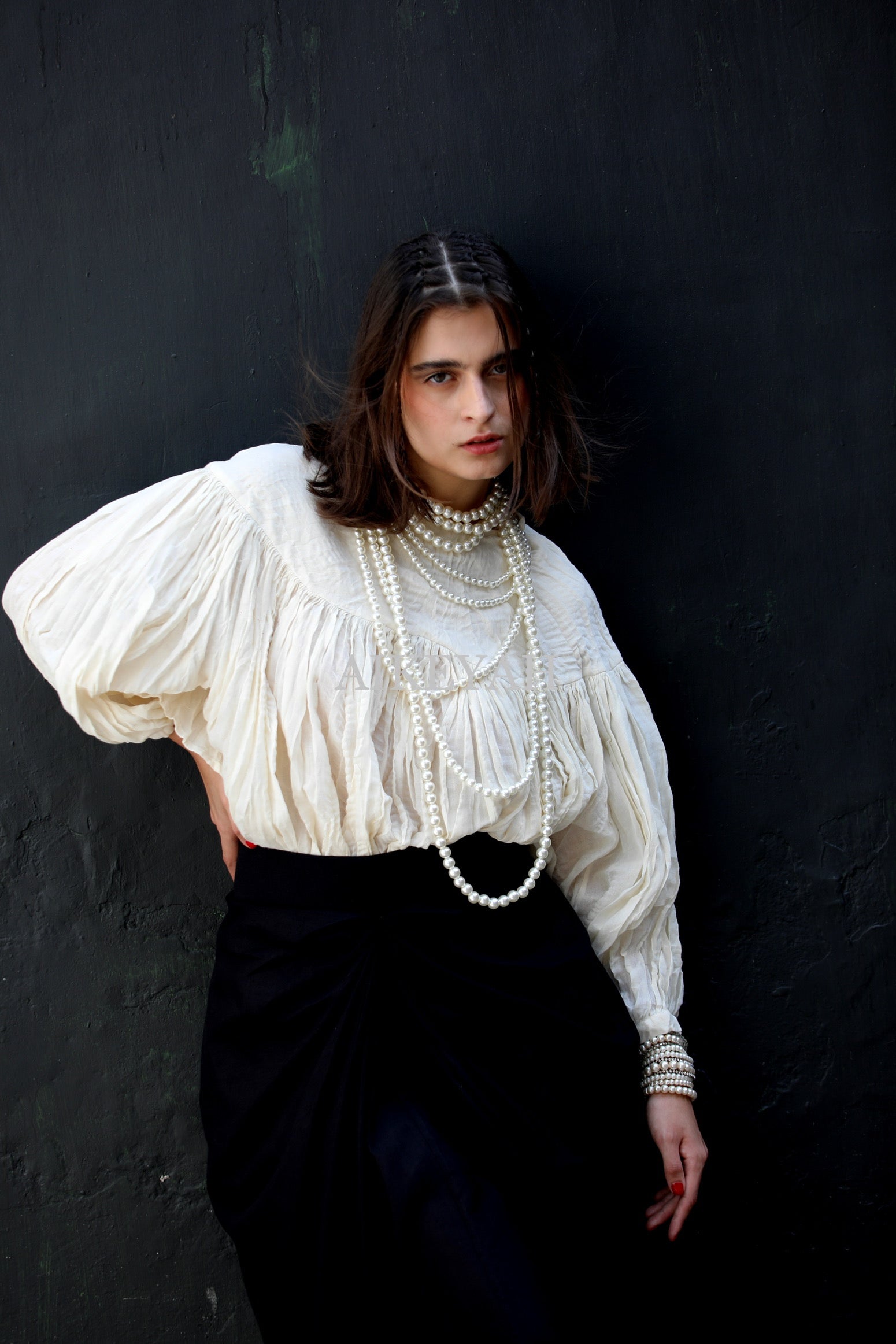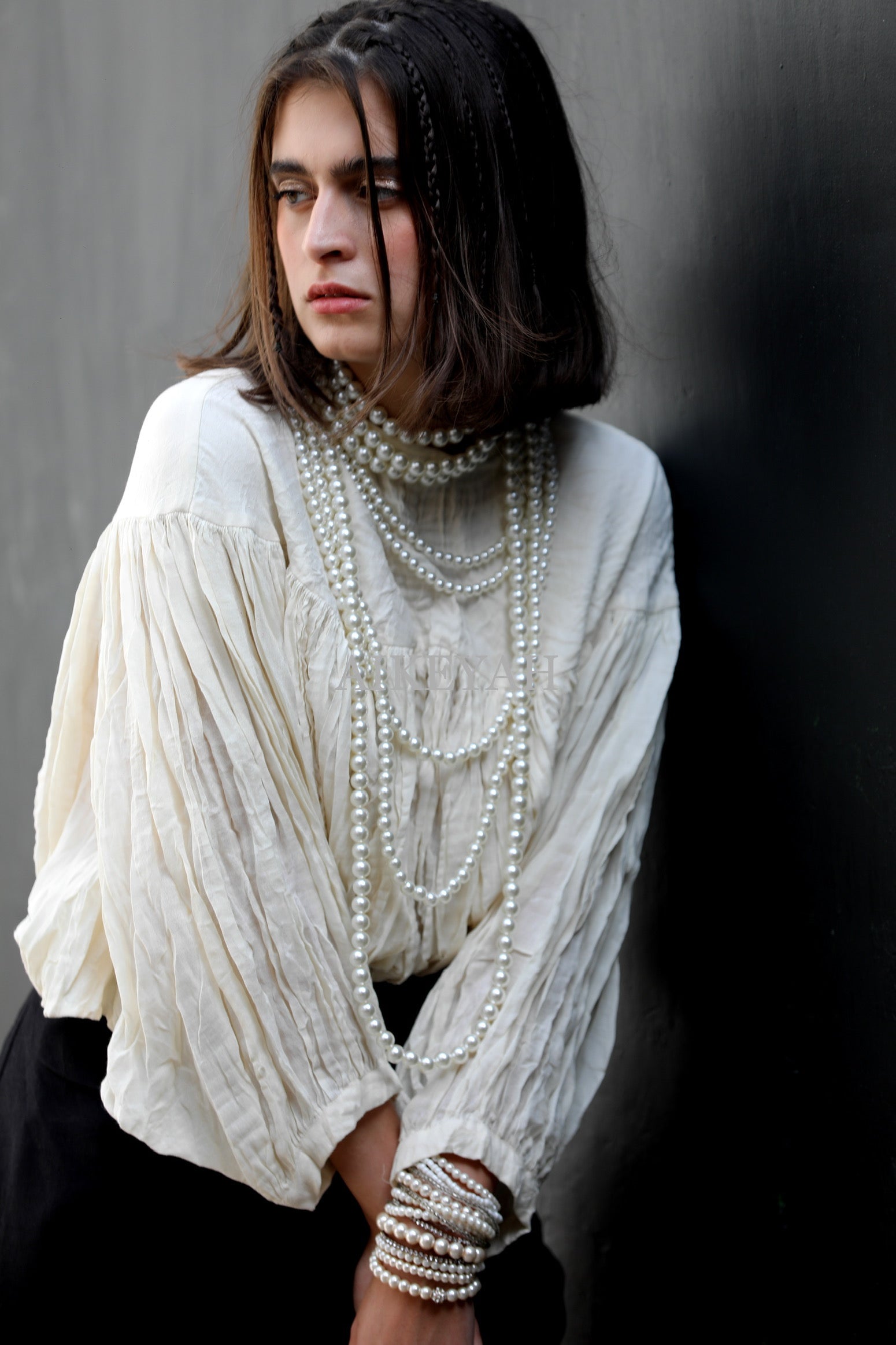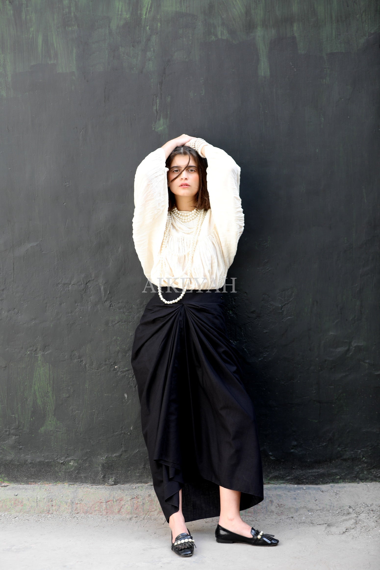 An offwhite cotton gathered crushed top worn with a linen black gathered skirt.