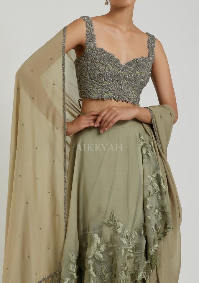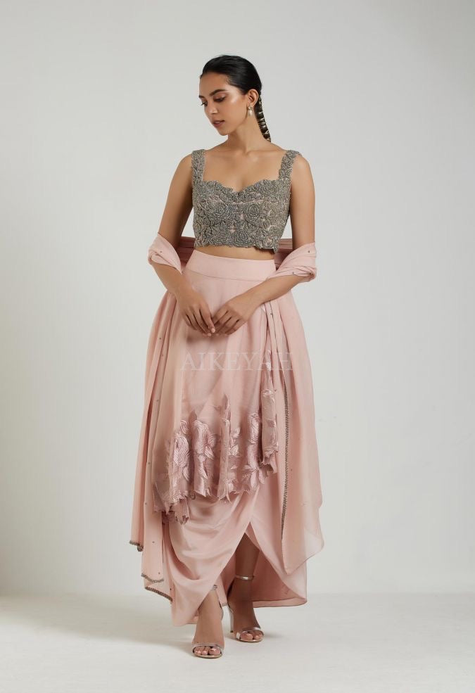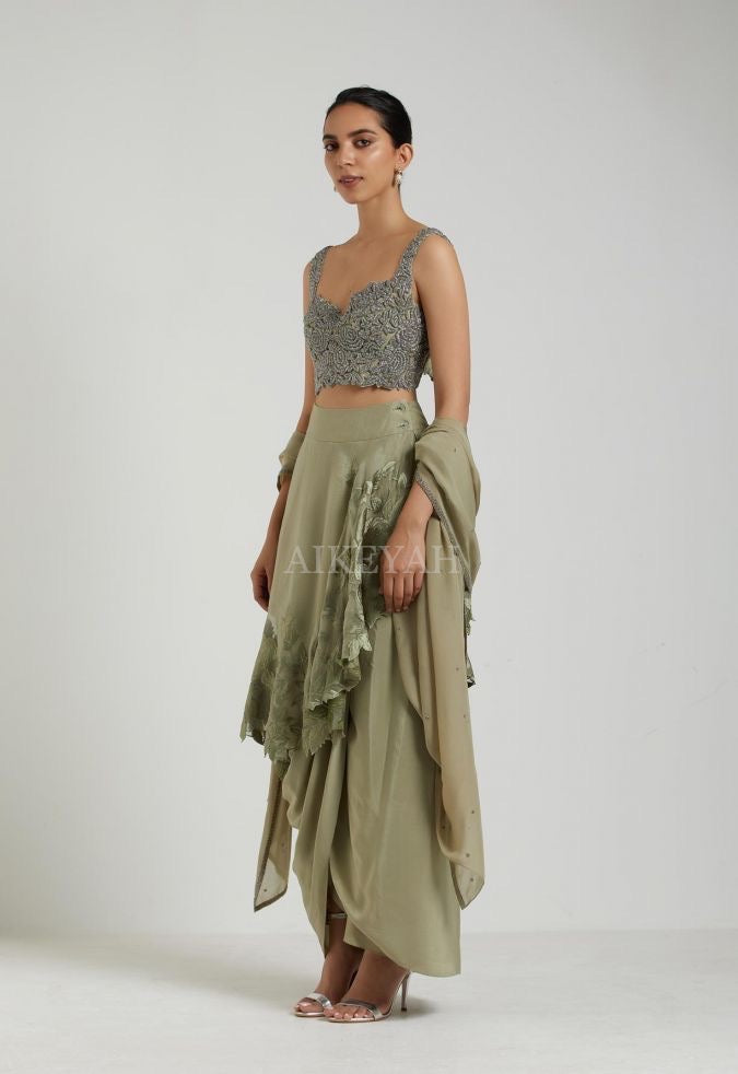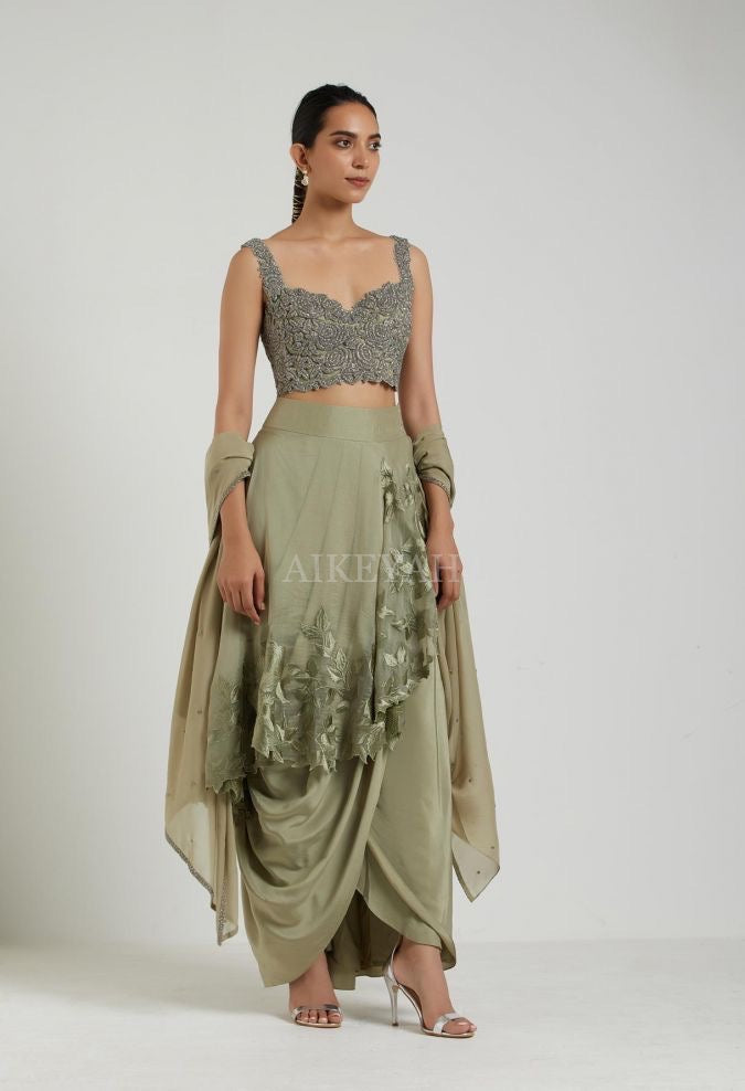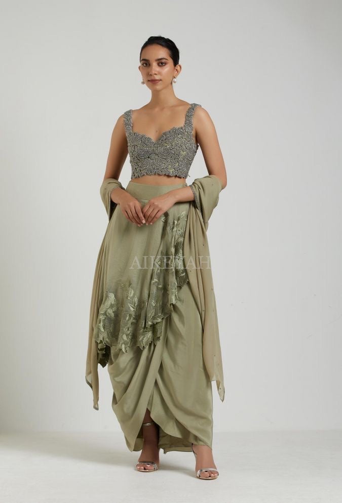 A glass beads hand embroidered bralette worn with a layered embroidered organza and crepe pre-draped sari.