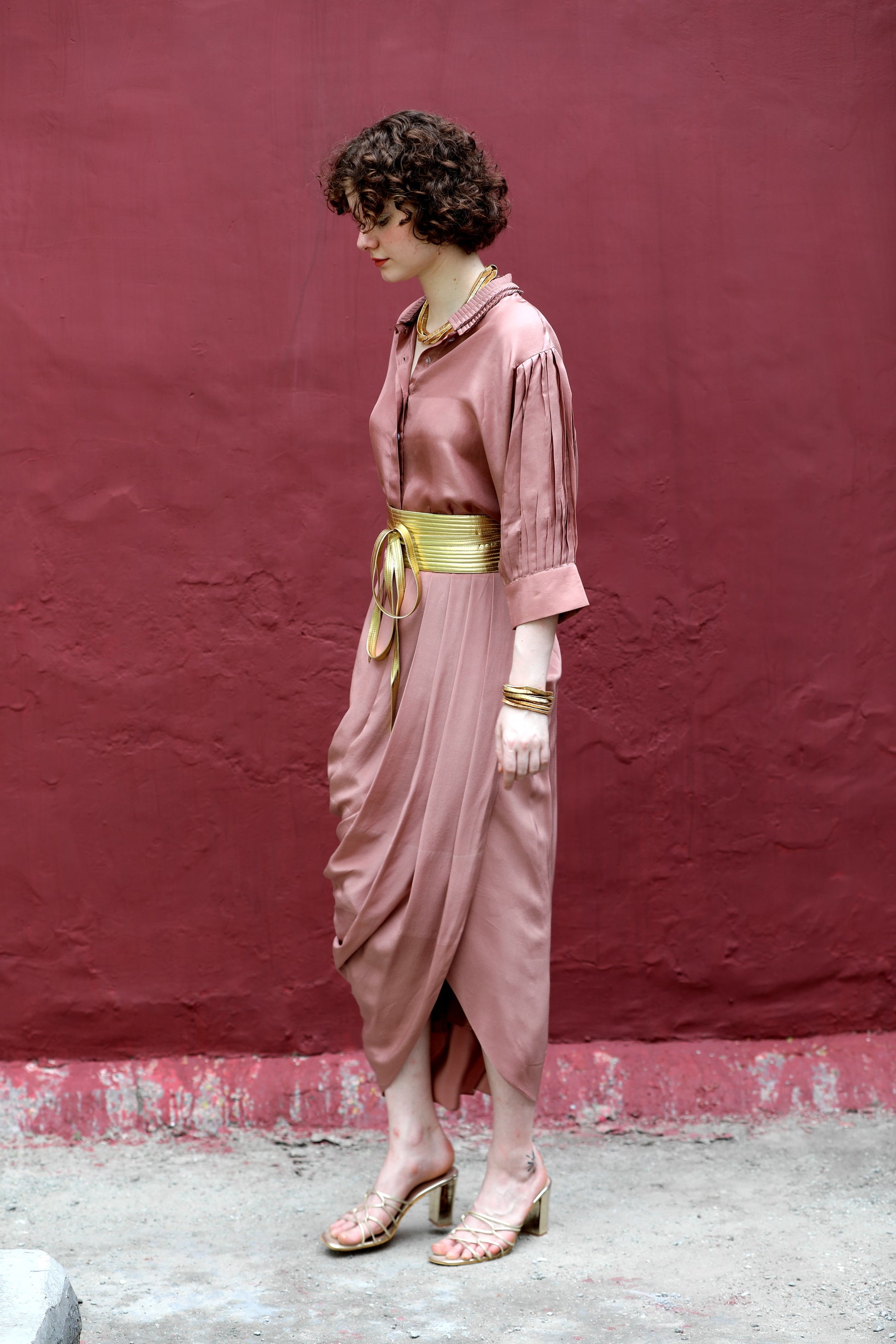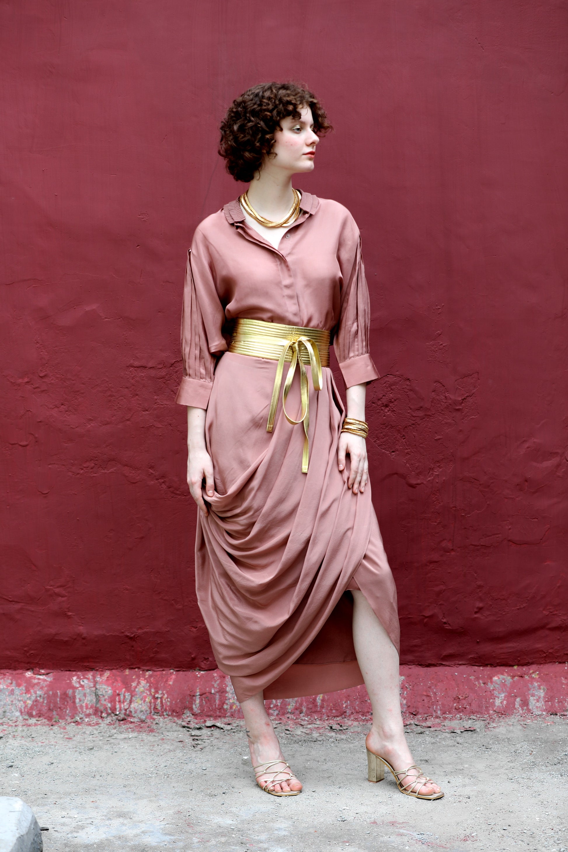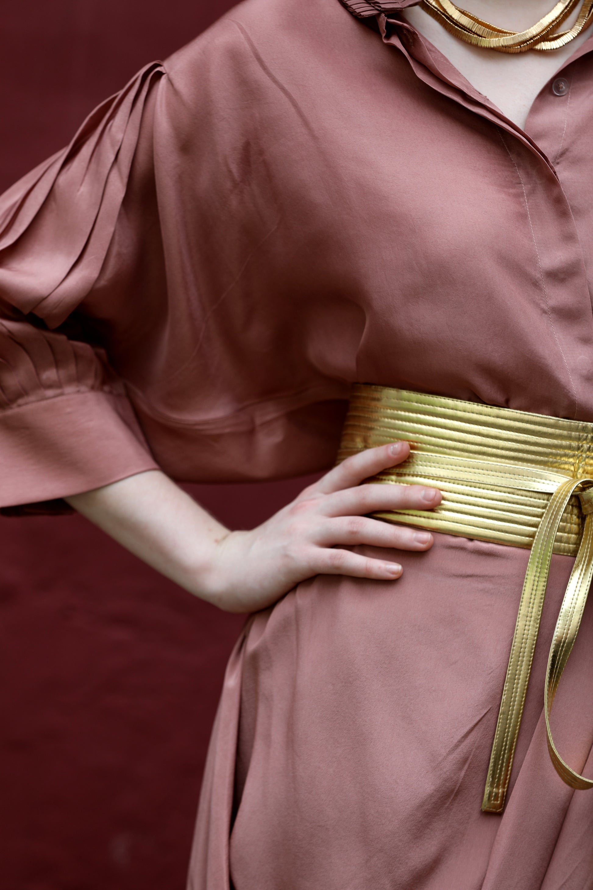 A silk shirt worn with a cowl crepe skirt, both in turkish rose color, cinched at the waist with a gold tie up belt.