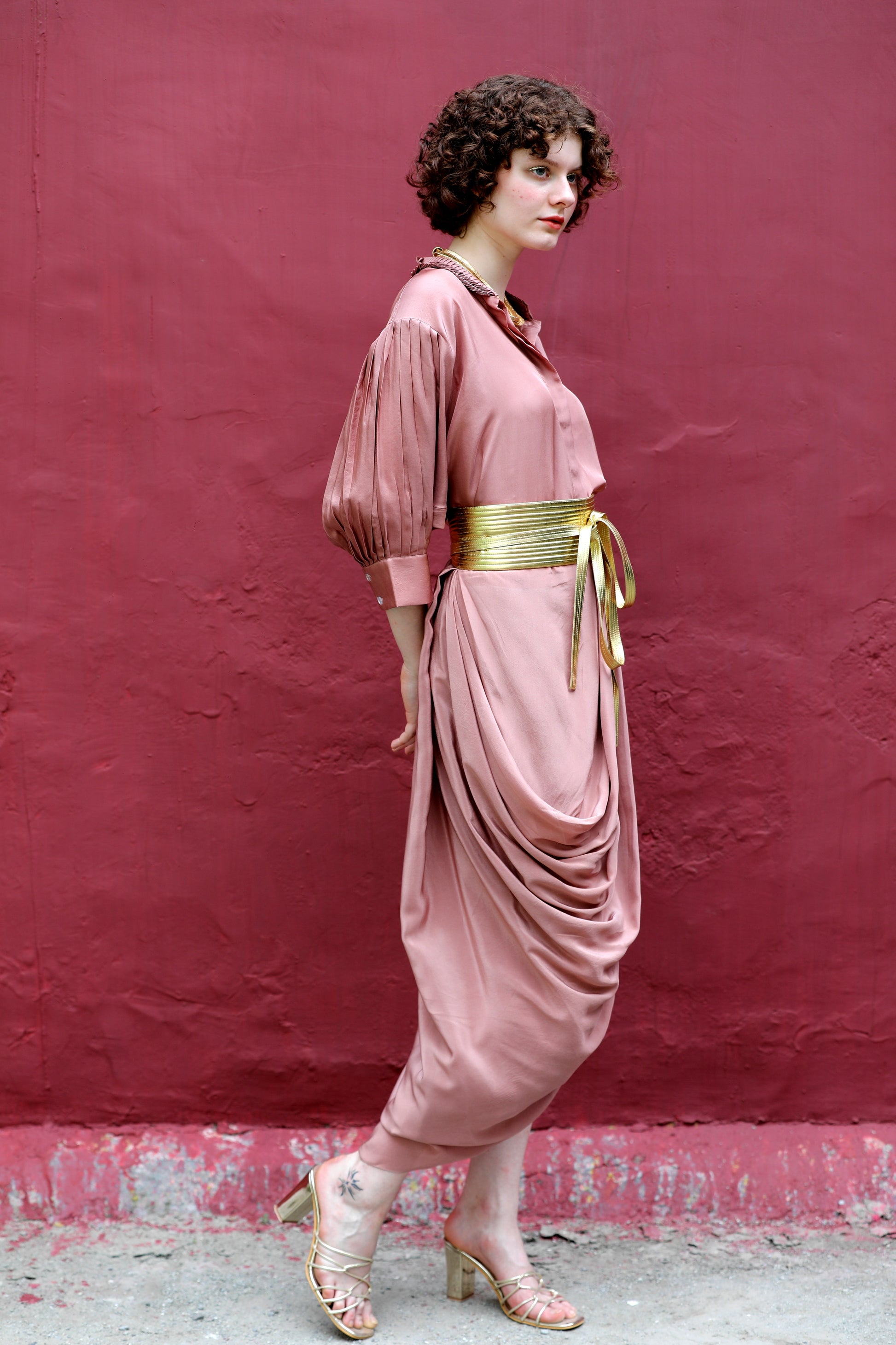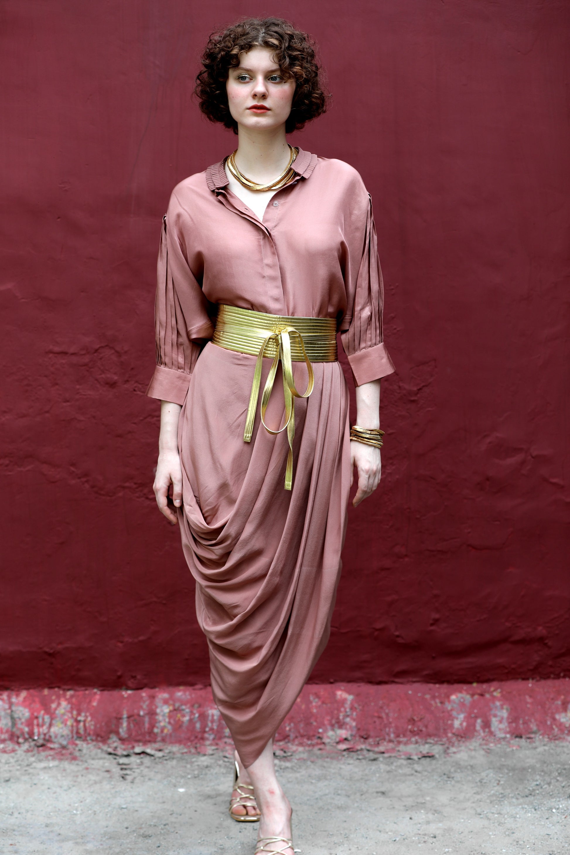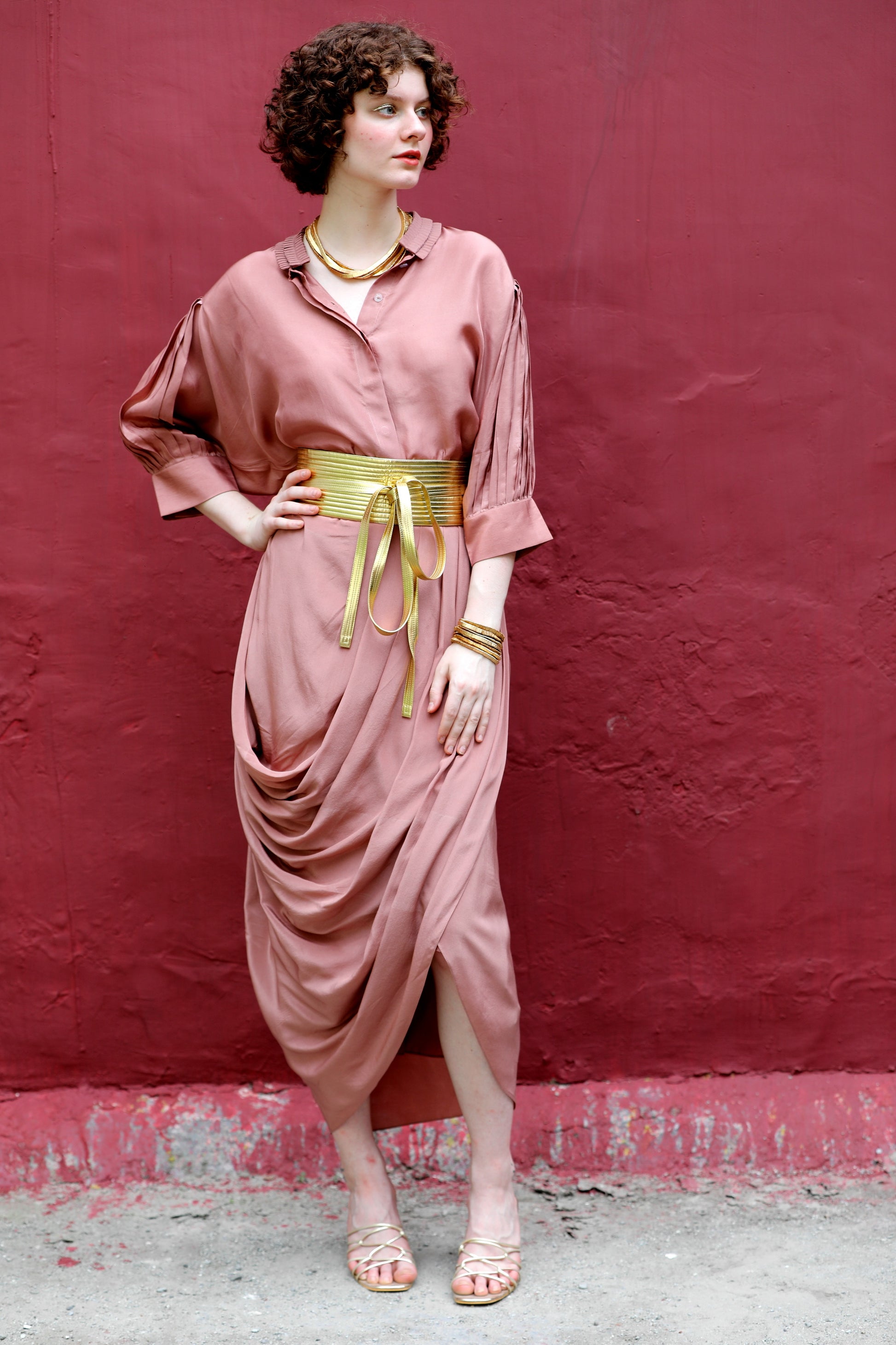 A silk shirt worn with a cowl crepe skirt, both in turkish rose color, cinched at the waist with a gold tie up belt.