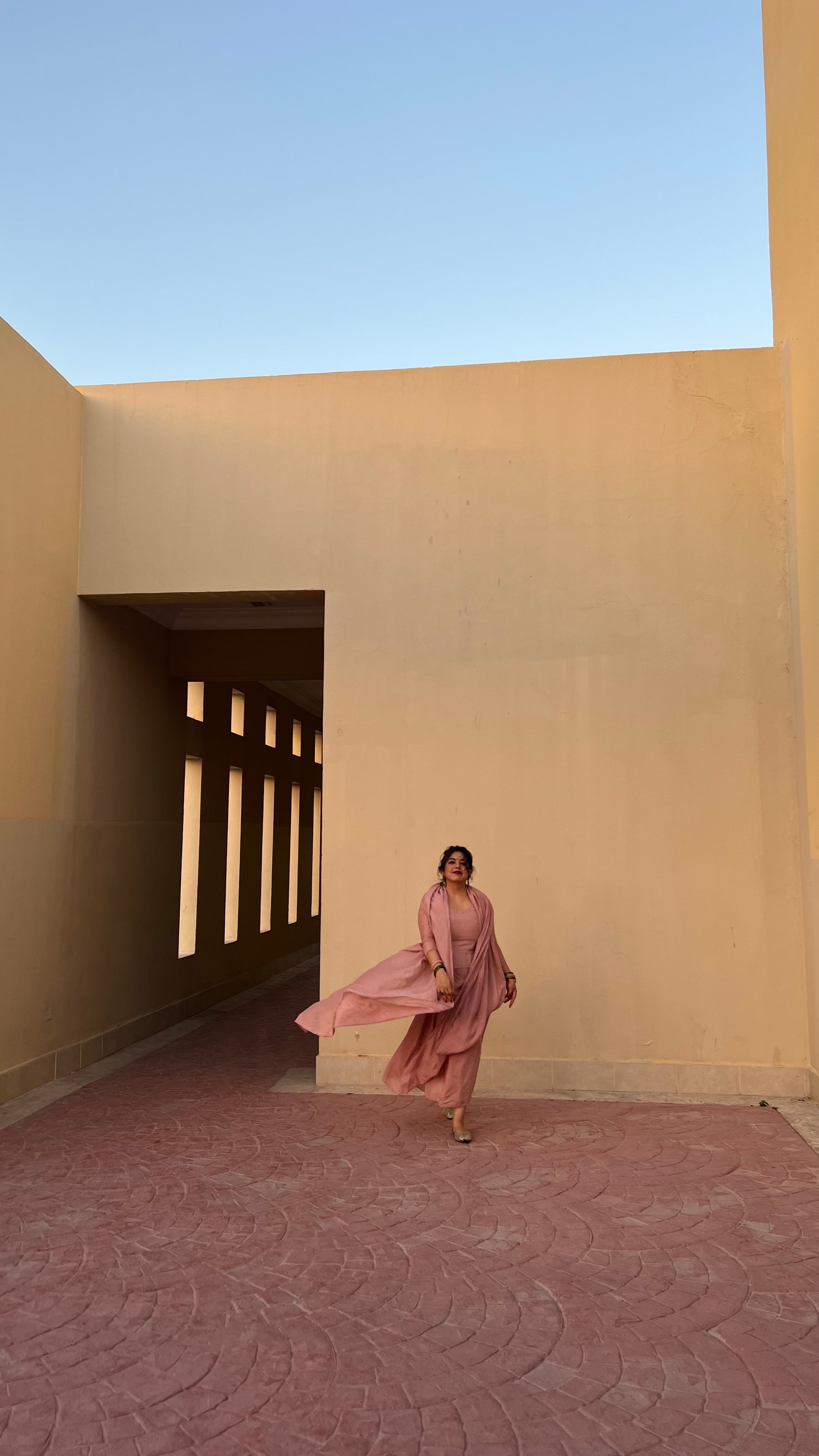 A Pastel Pink cotton silk pre-draped ankle length sari dress.