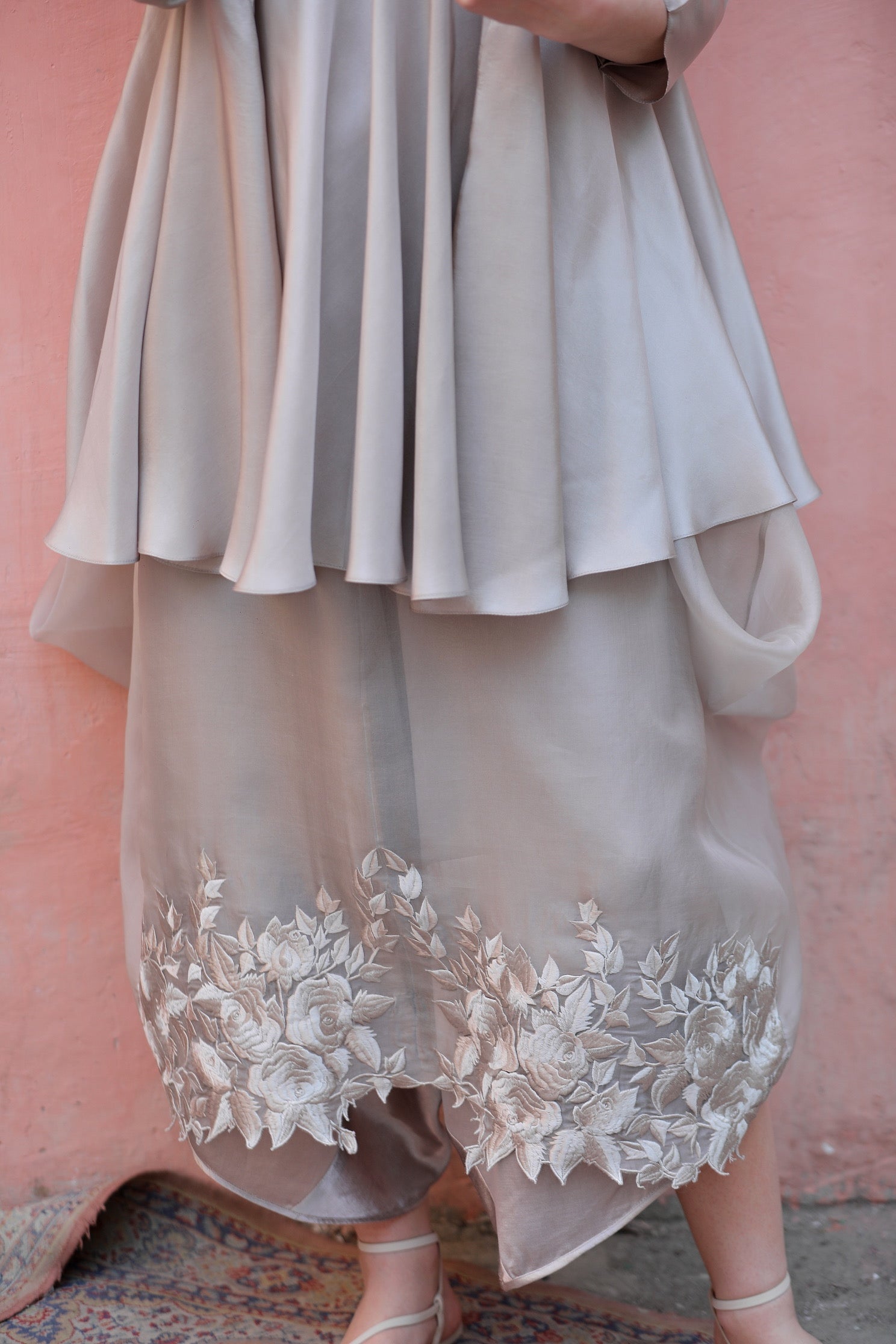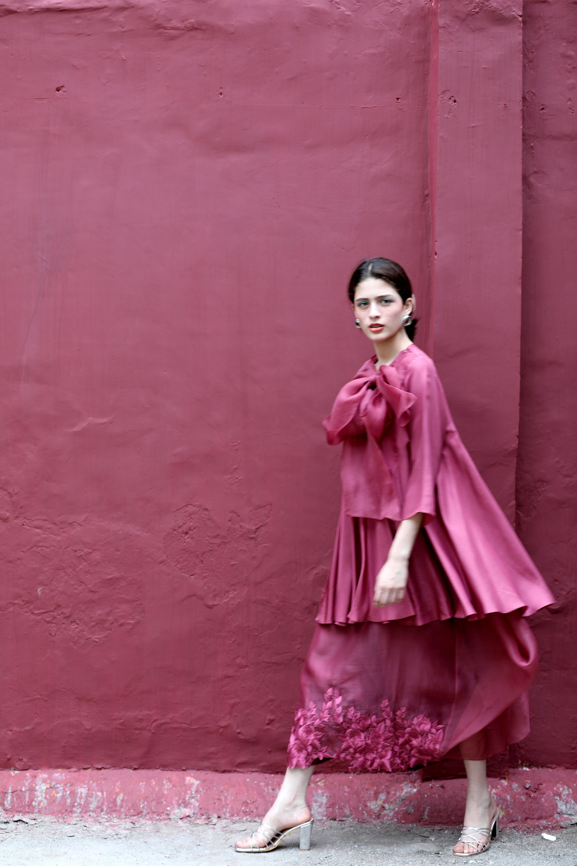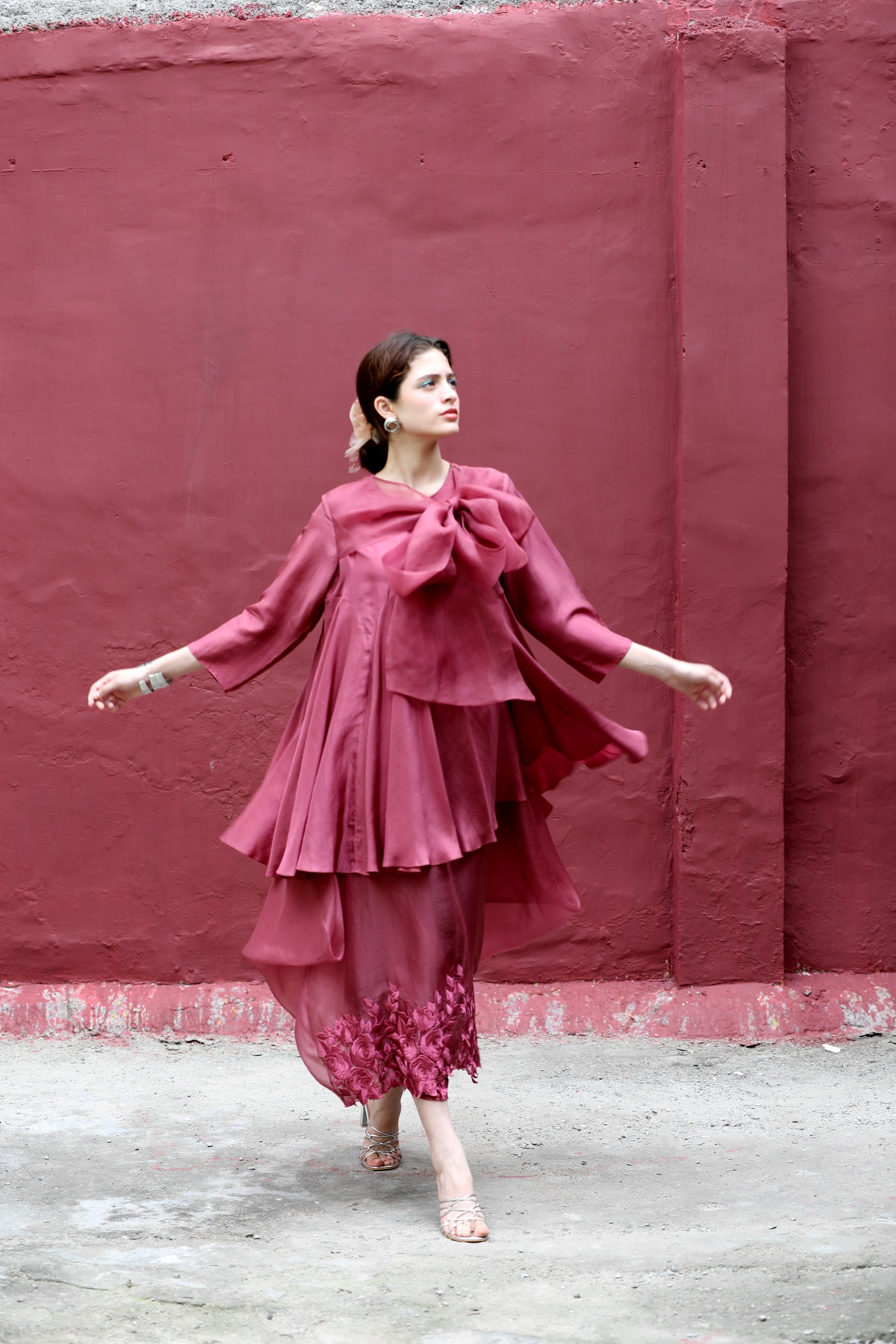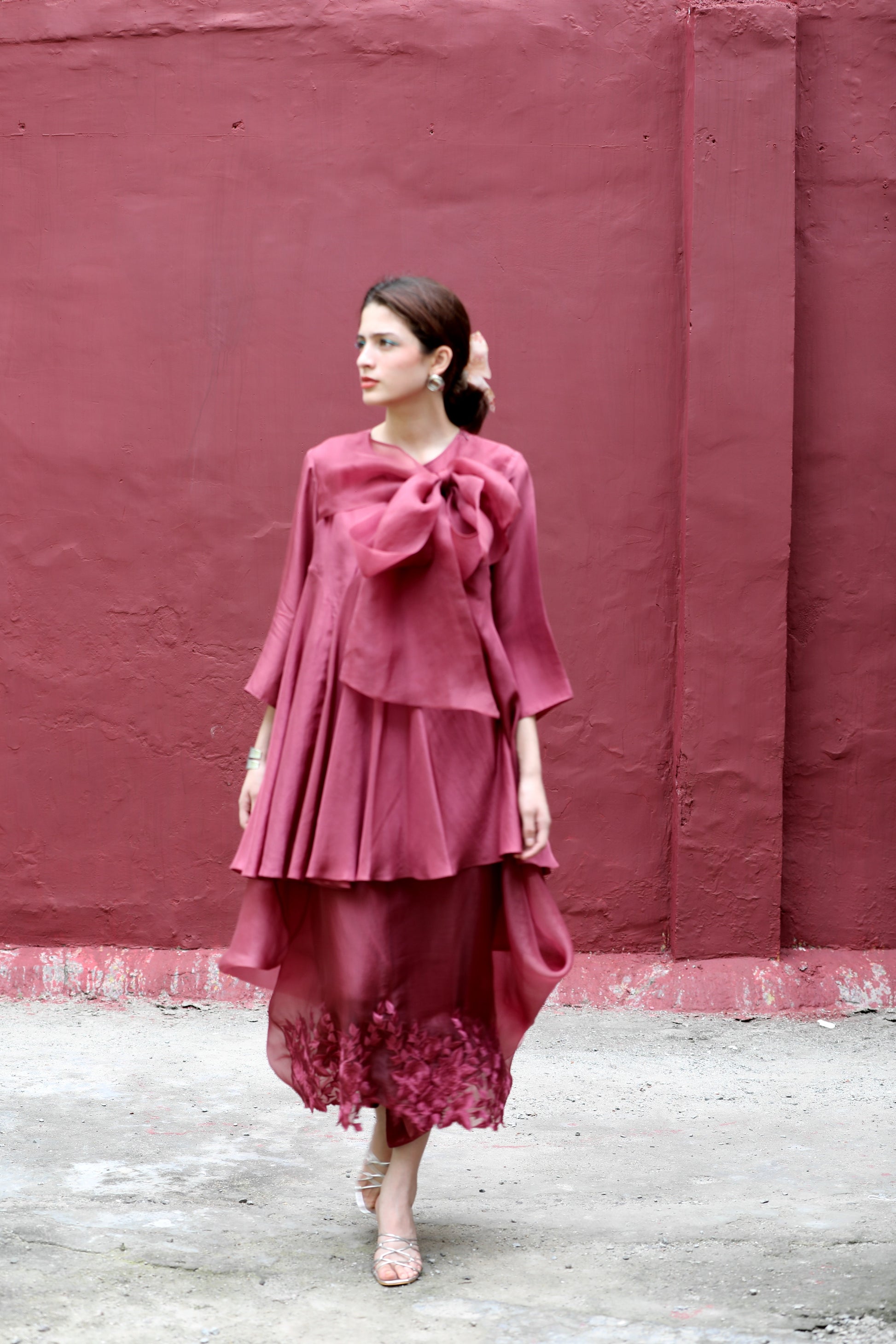 Silk/ organza double layered dress with a huge organza bow on one shoulder, embroidered at the hemline with floral thread embroidery worn with signature low crotch mashru silk pants all in Bermuda Onion Colour.