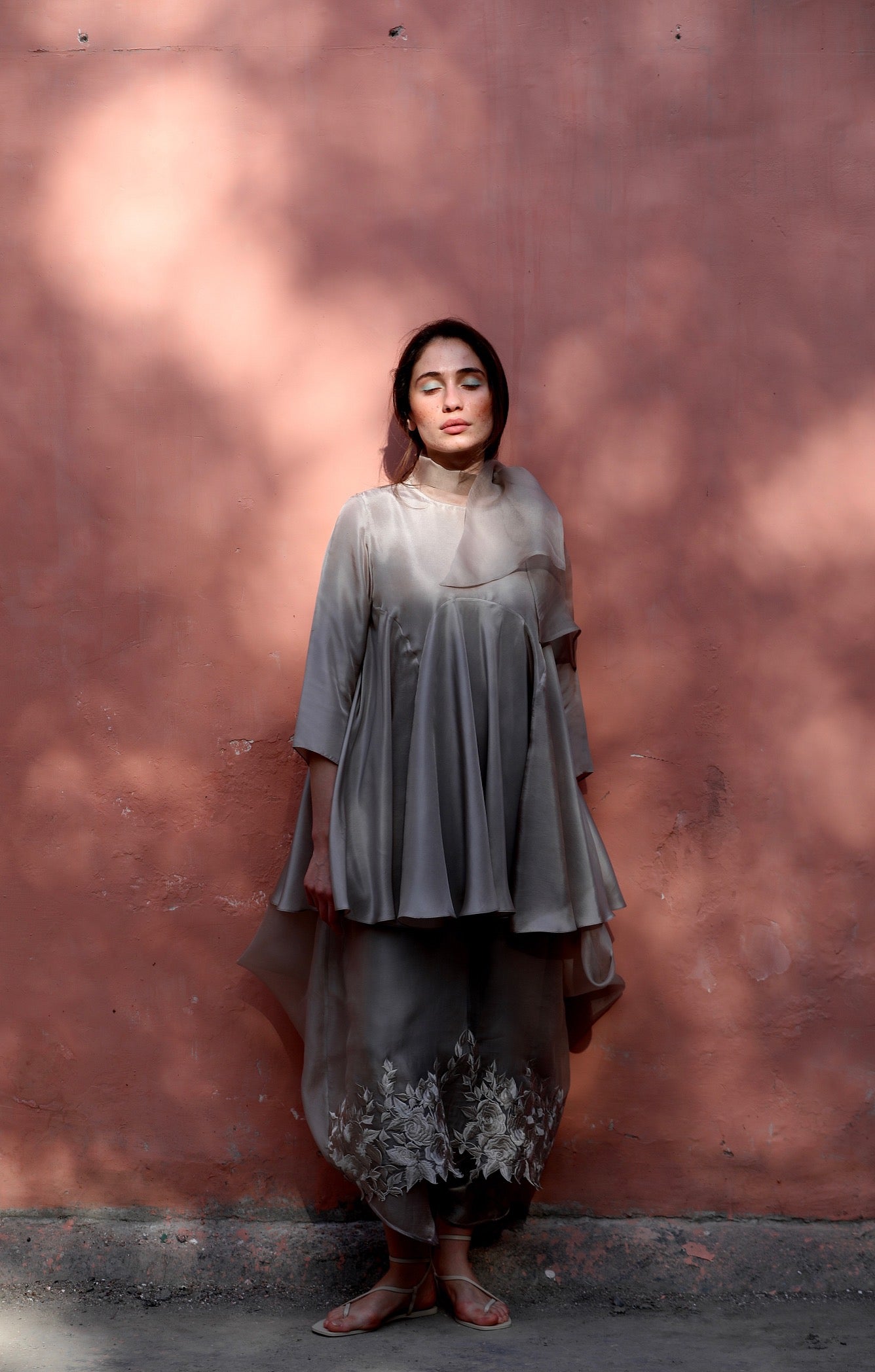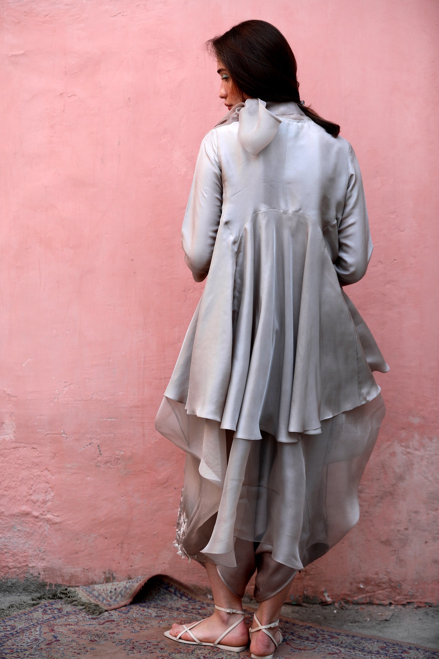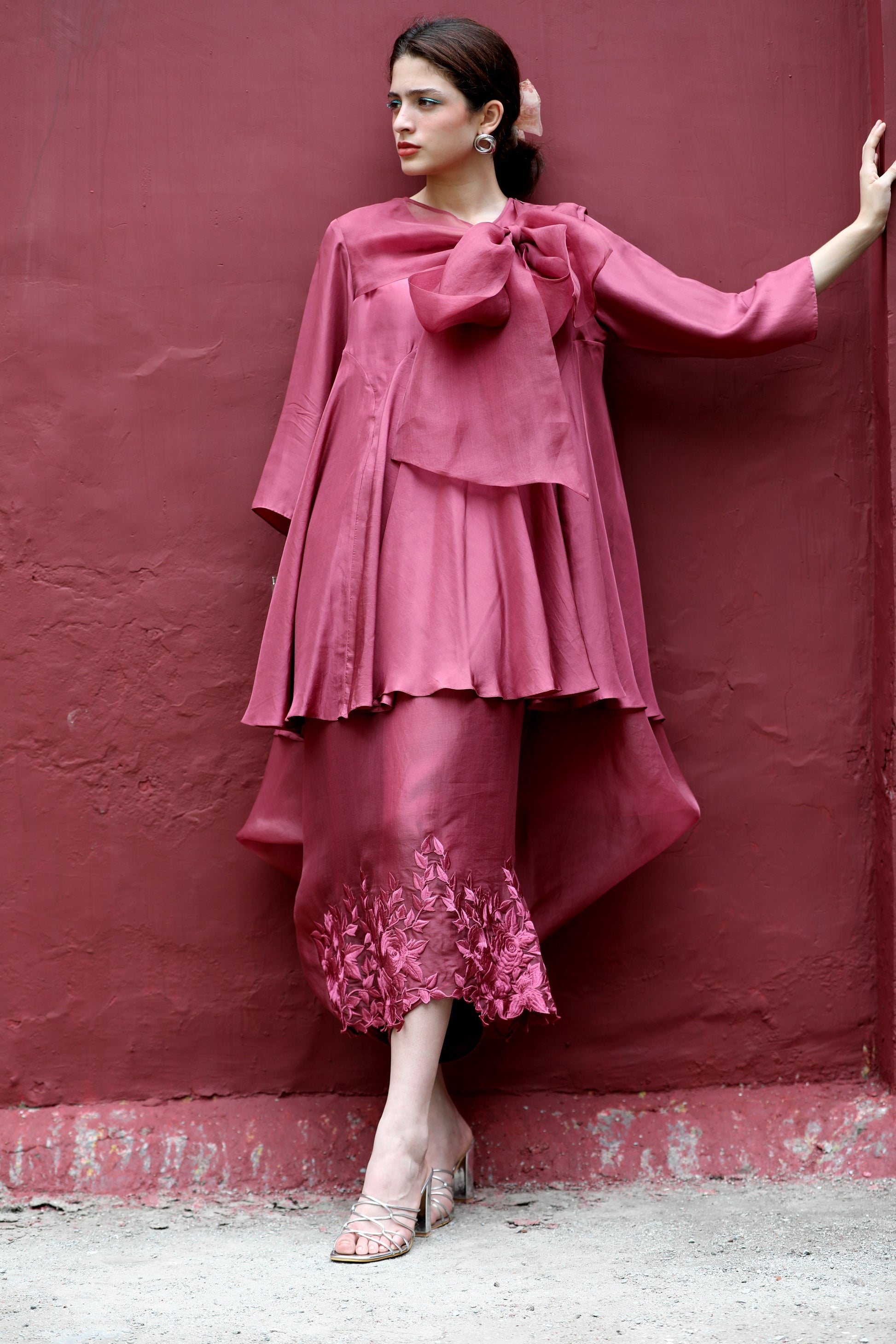 Silk/ organza double layered dress with a huge organza bow on one shoulder, embroidered at the hemline with floral thread embroidery worn with signature low crotch mashru silk pants.