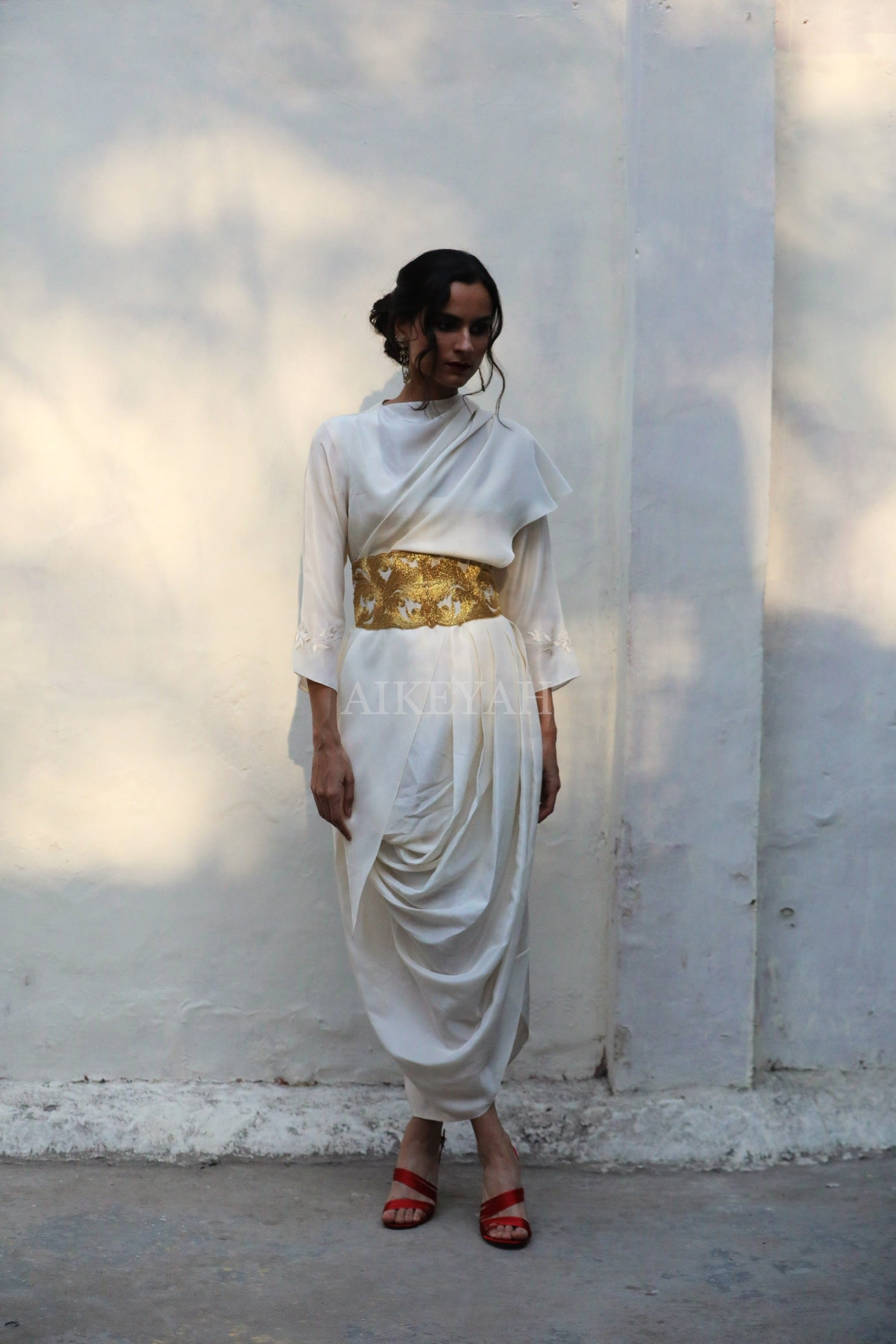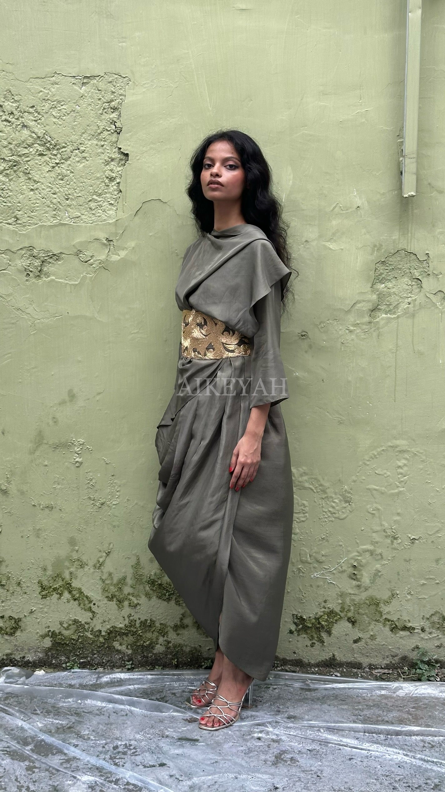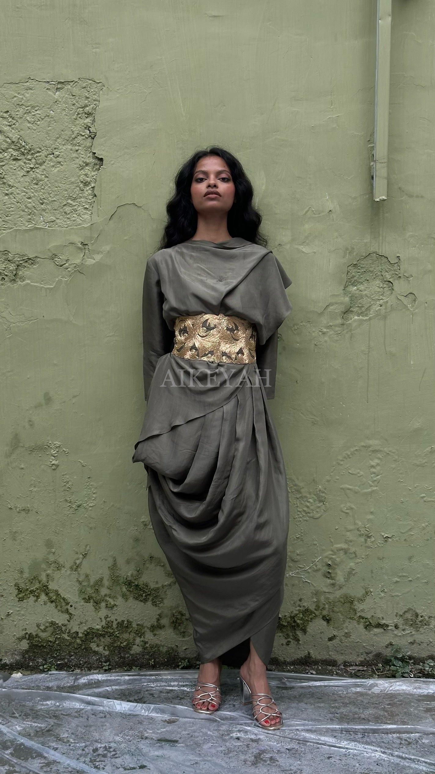 A silk drape cowl dress worn cinched at waist with an embroidered gold belt.