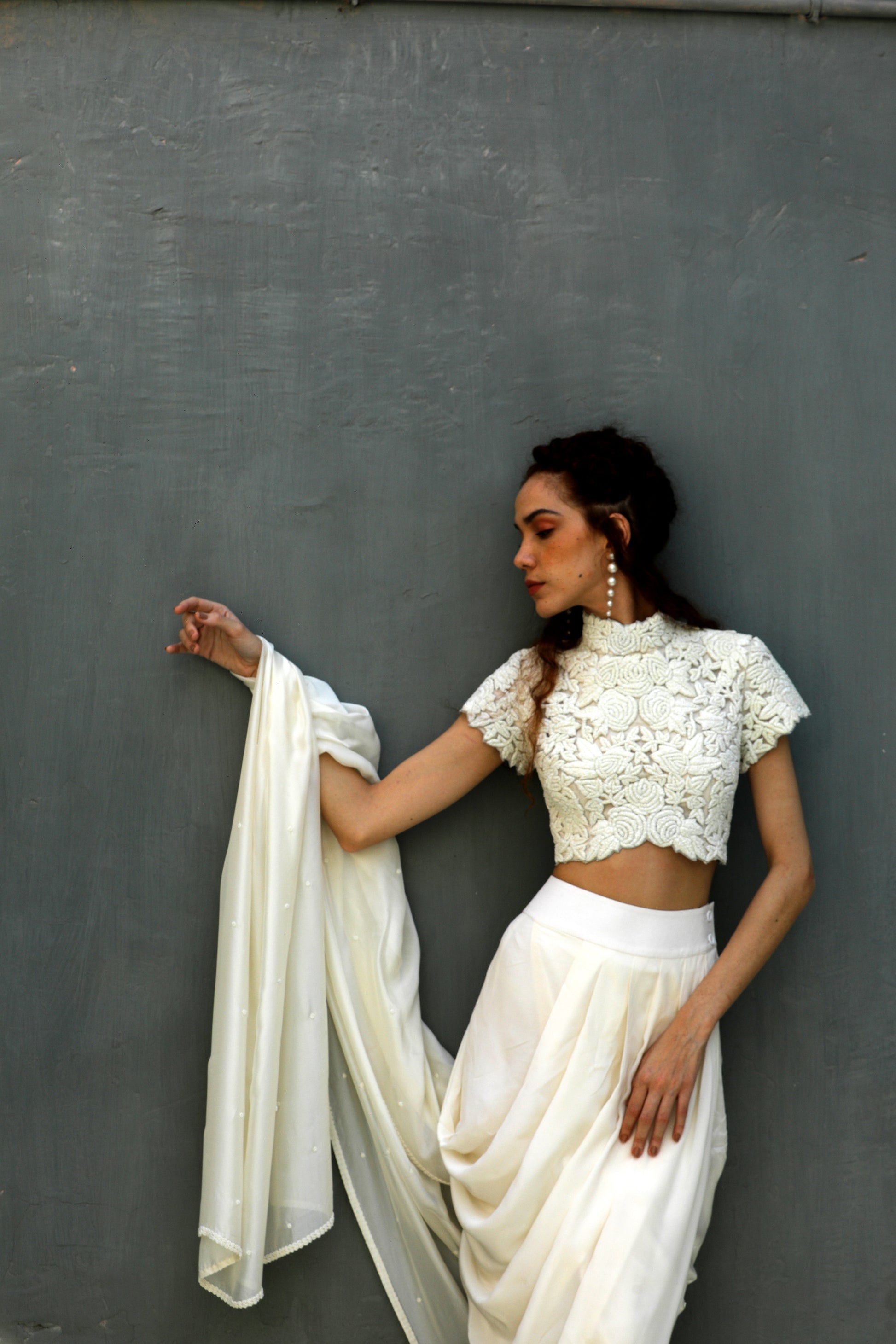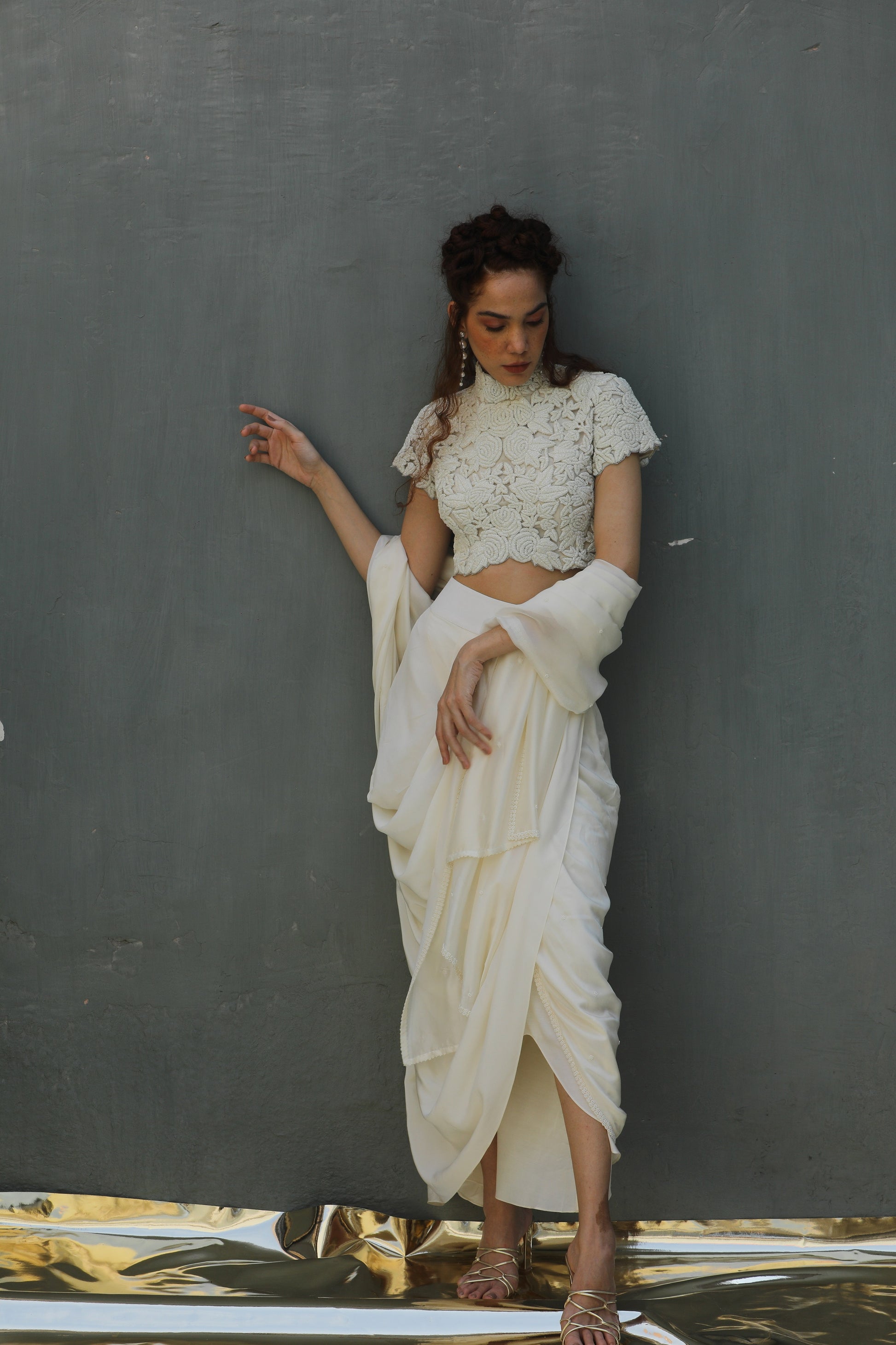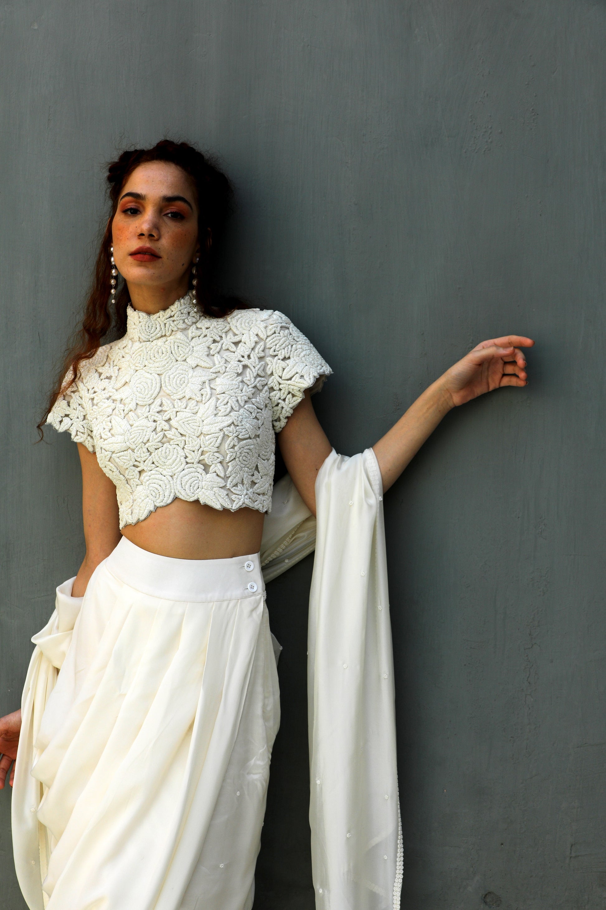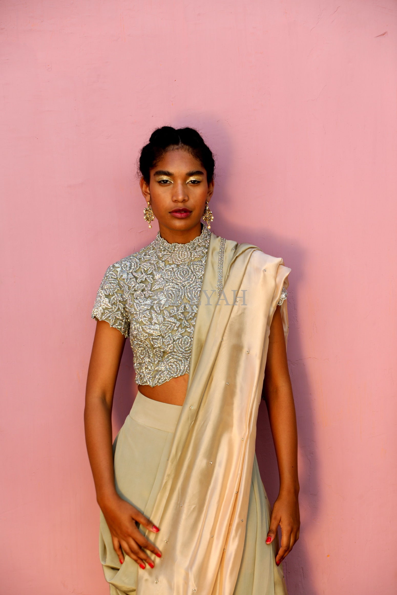 A classic glass bead hand embroidered blouse worn with a pre-draped cowl sari.