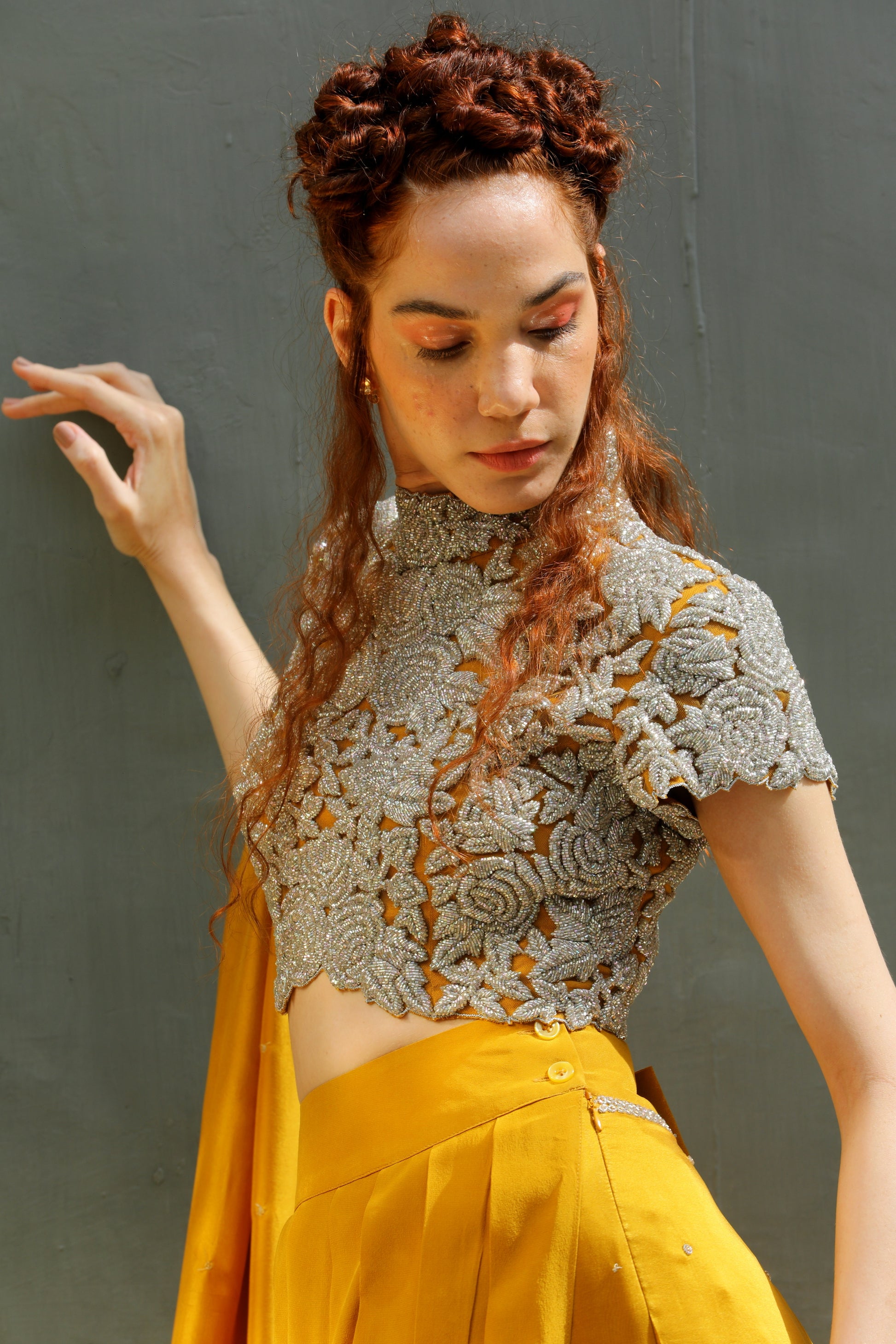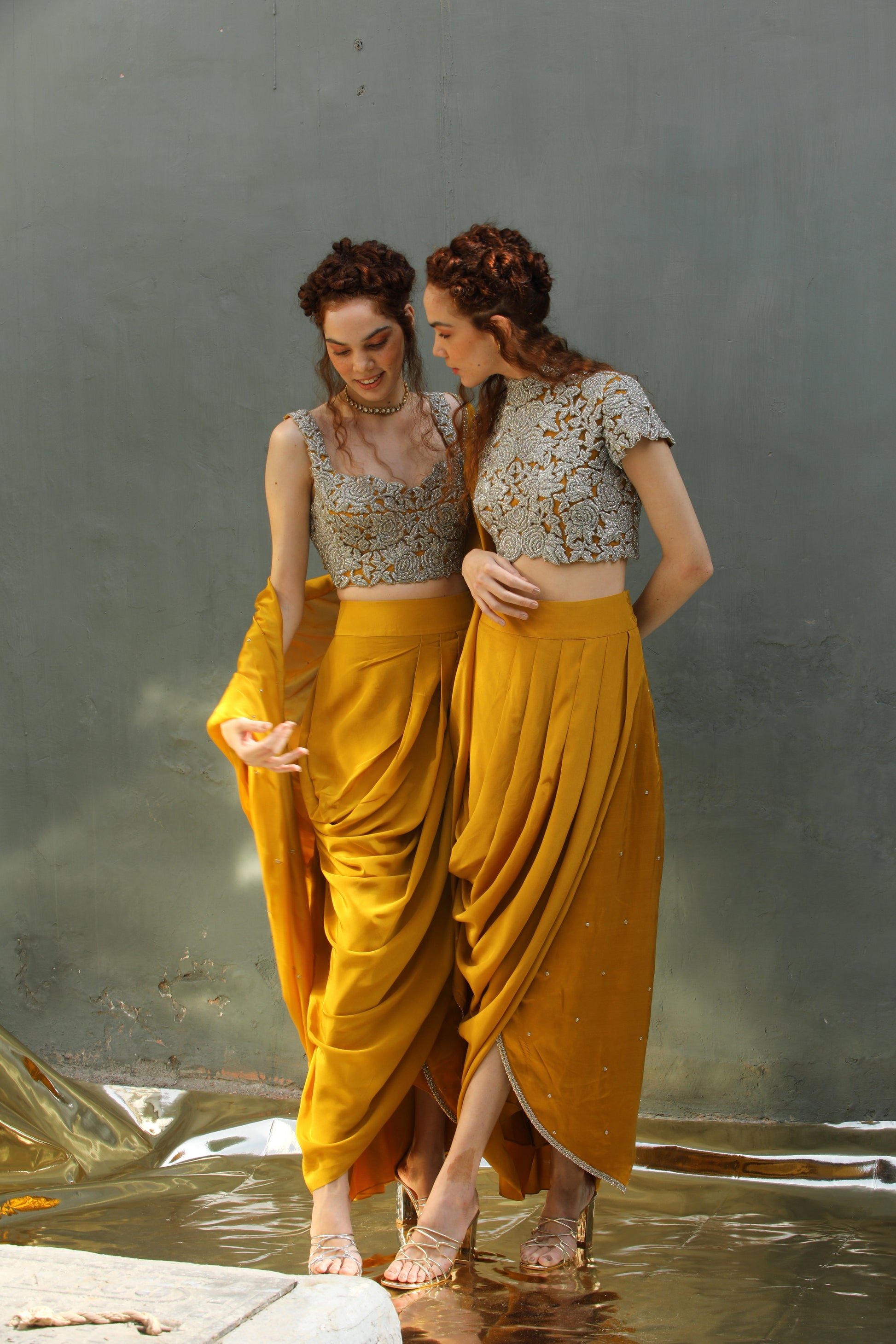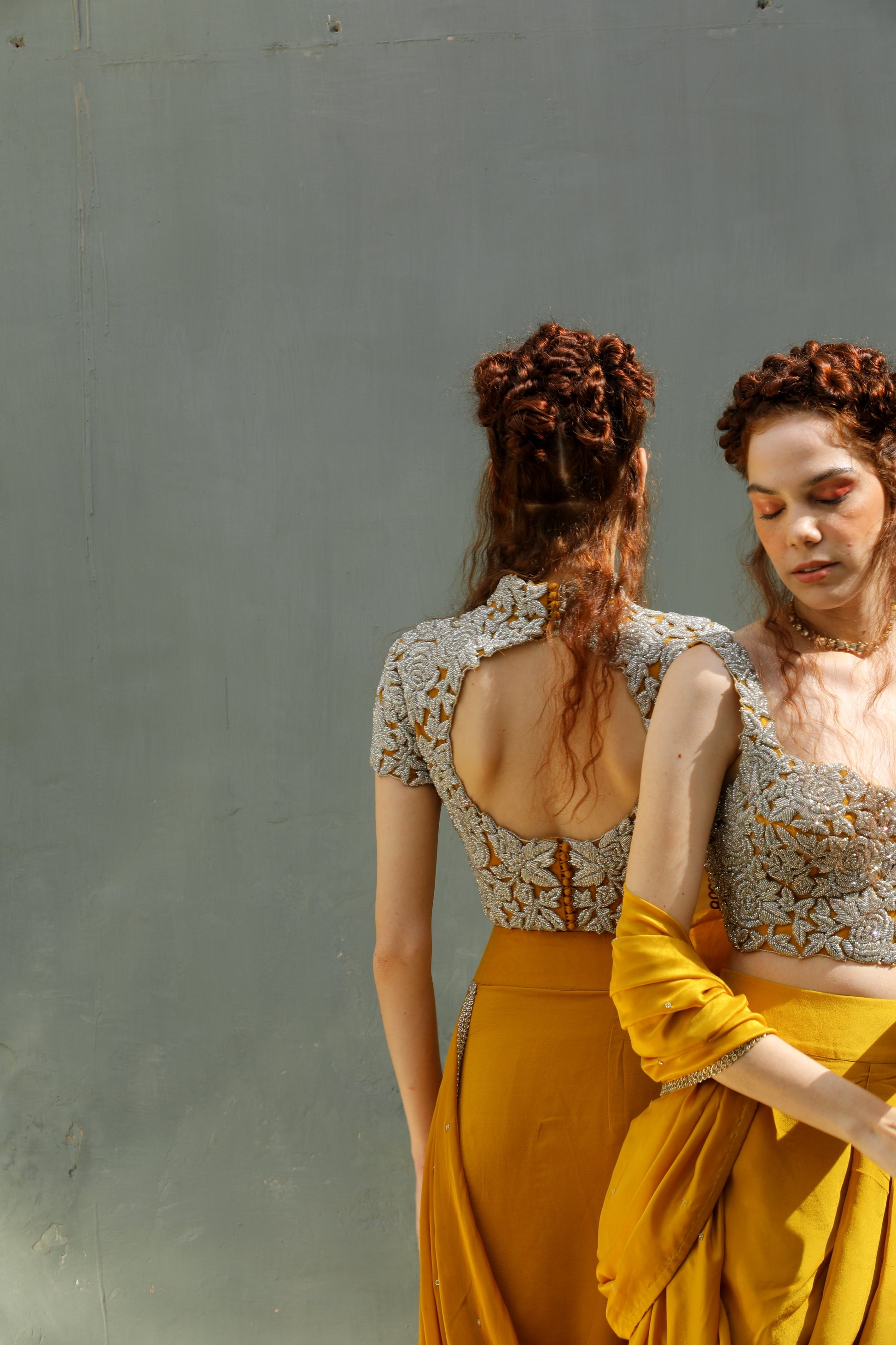 A classic glass bead hand embroidered blouse worn with a pre-draped cowl sari in Ochre.