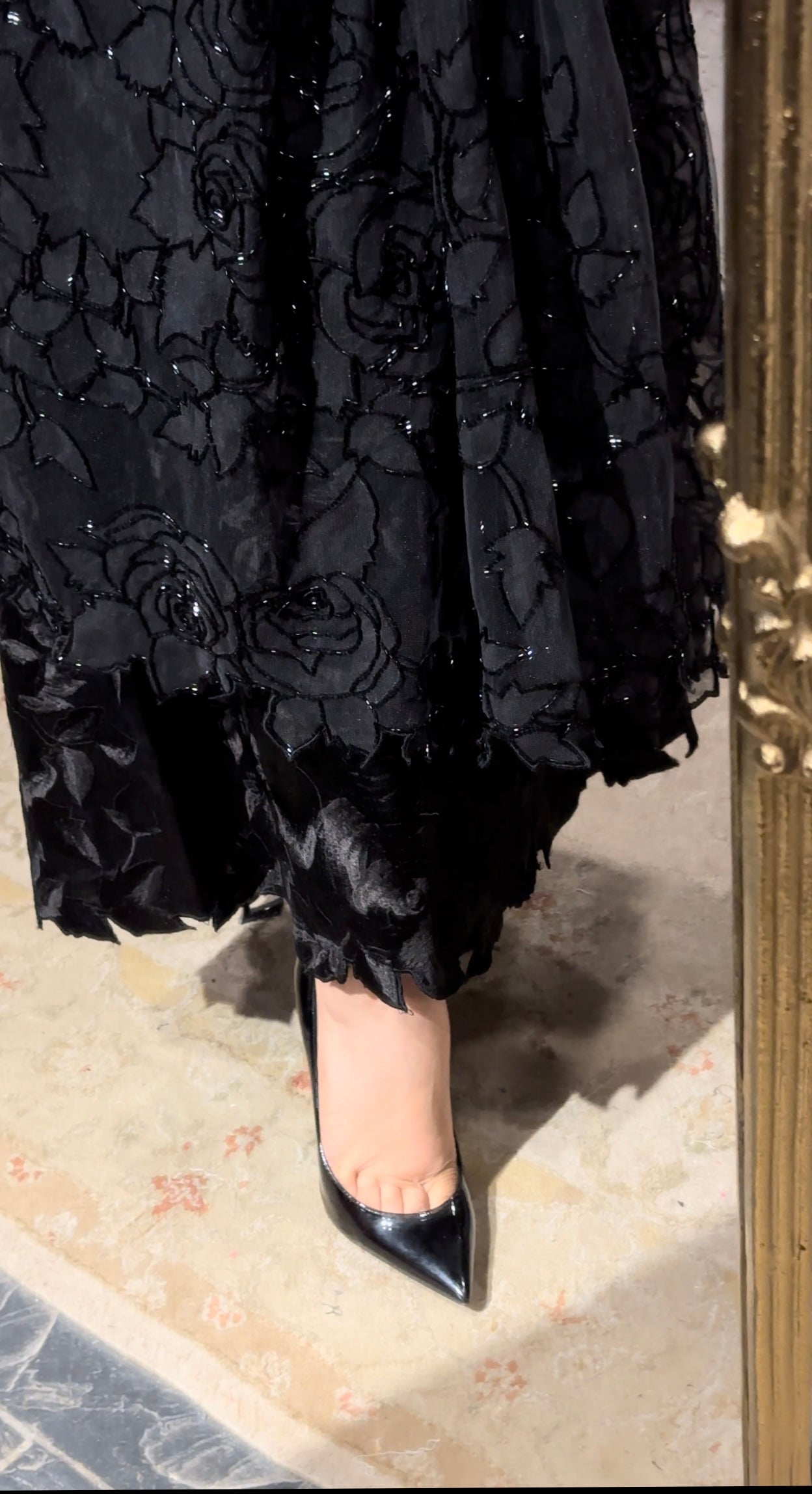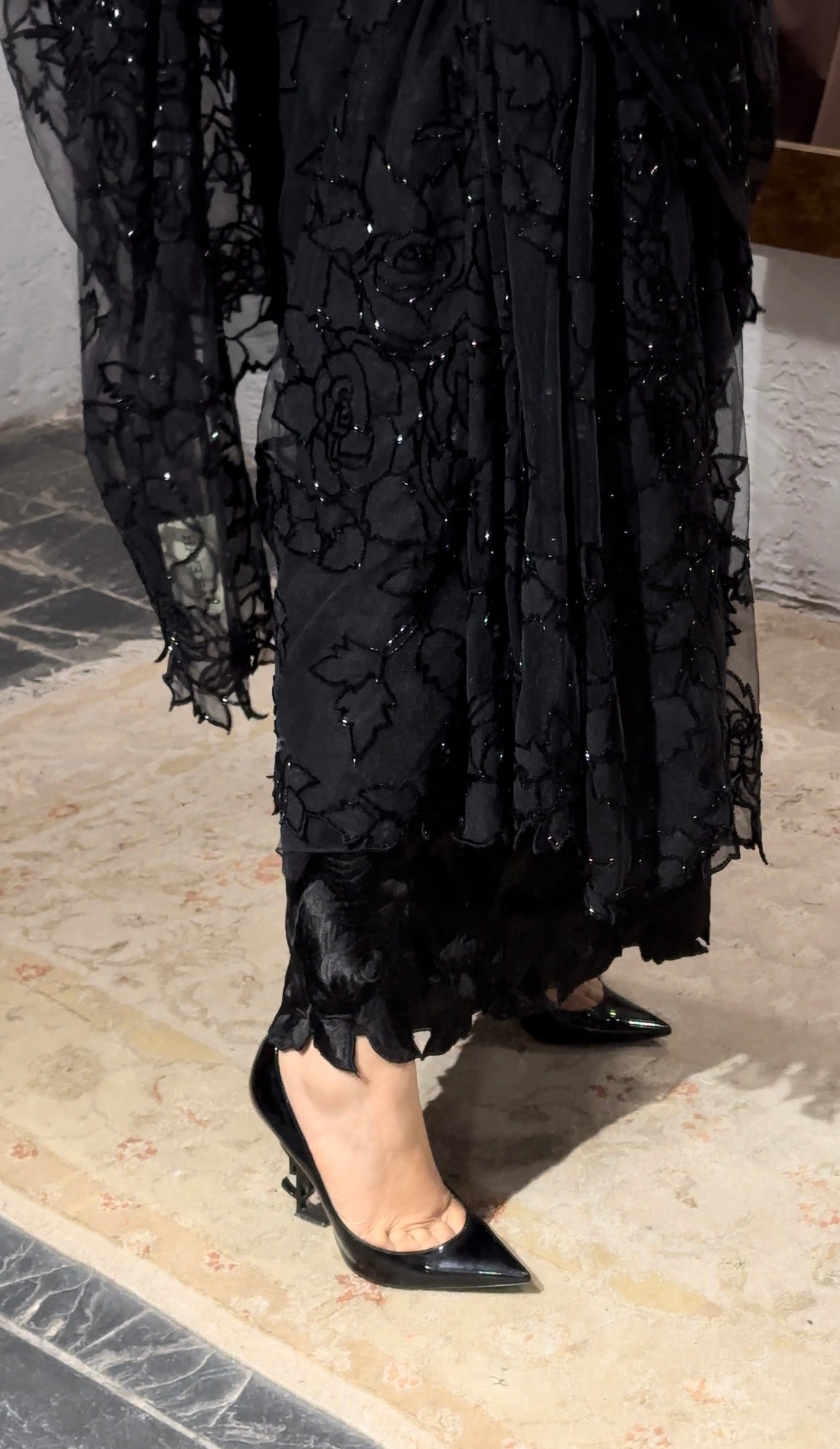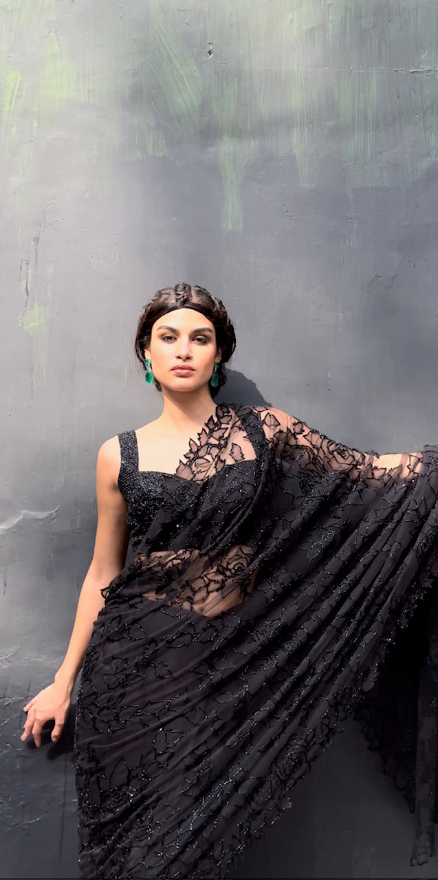A hand embroidered bugle beads bralette blouse in Black worn with a tulle applique sari highlighted with bugle beads and a mashru silk petticoat embroidered in threads all in Signature Floral.