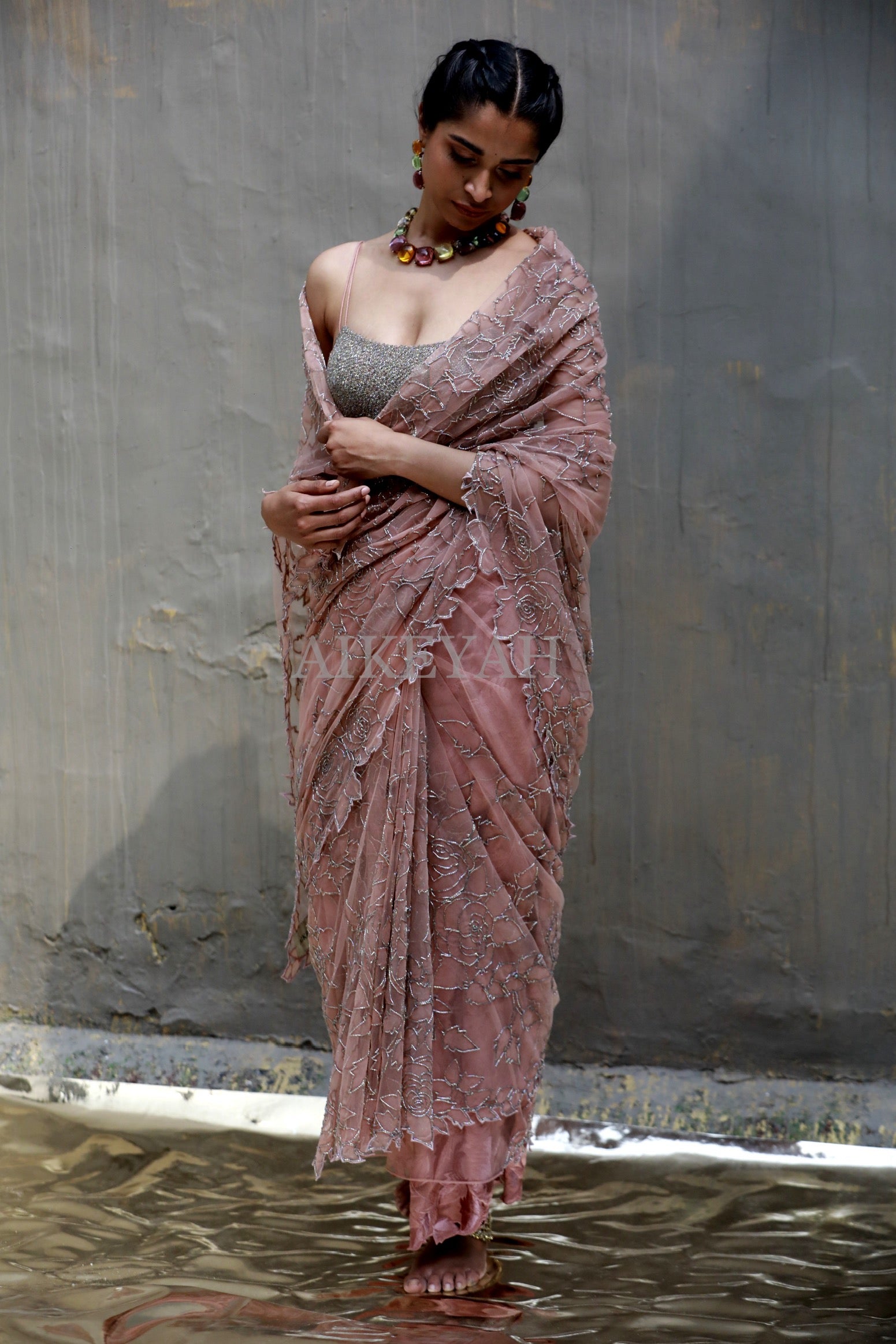 A hand embroidered glass beads bralette worn with a tulle applique sari highlighted with silver glass beads and a mashru silk petticoat embroidered in threads all in Signature Florals in Pastel pink.