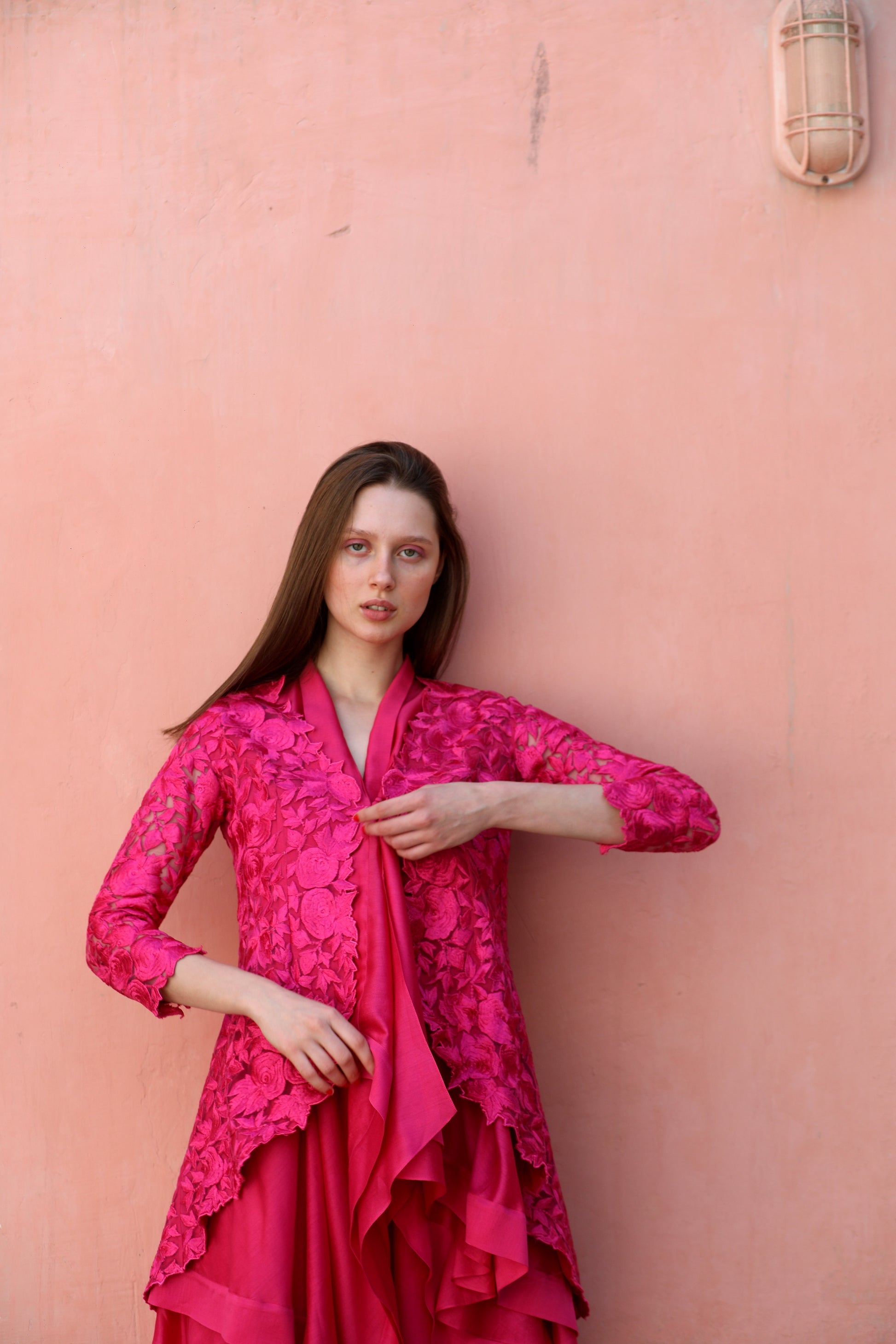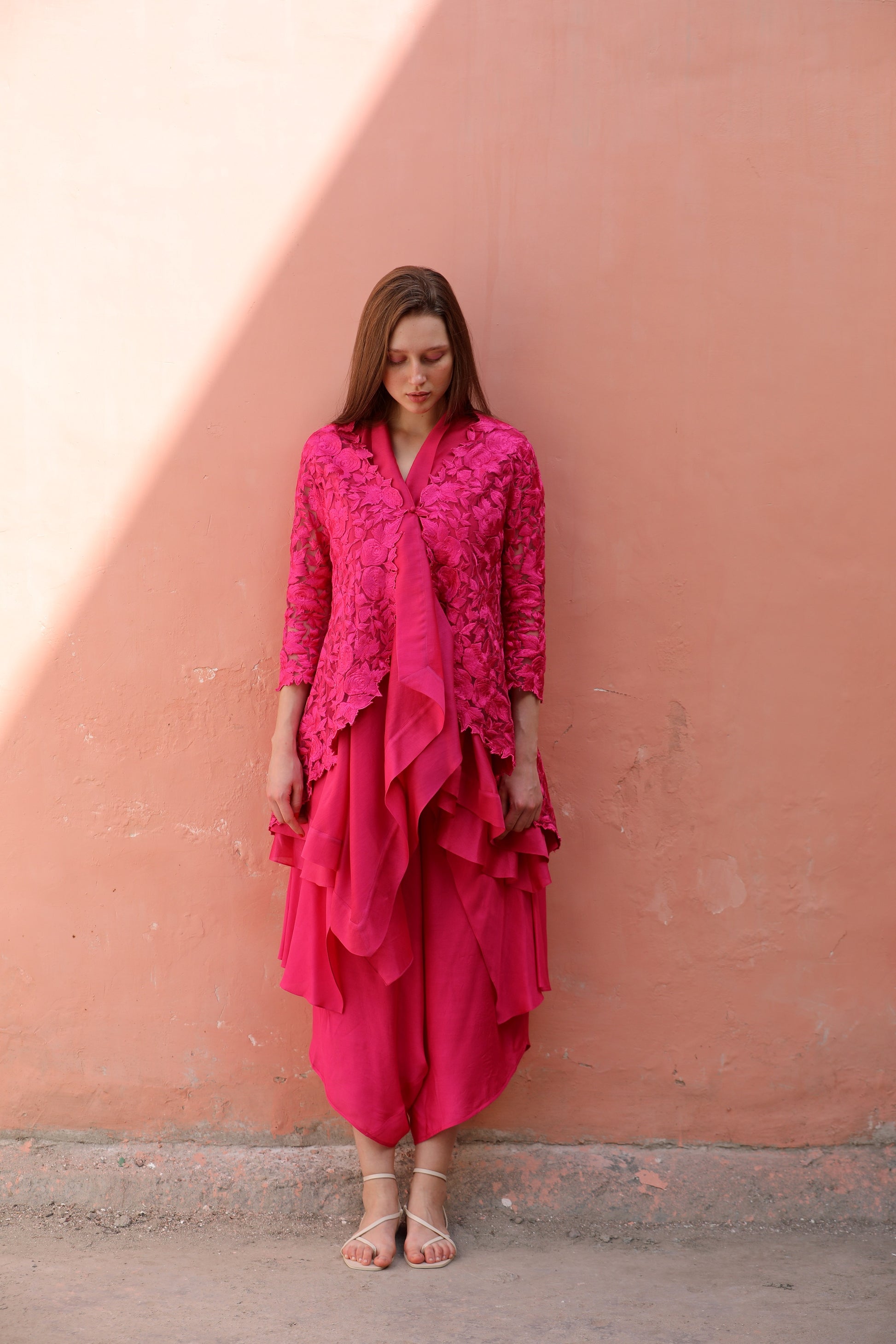 A Rani pink thread embroidered low and high jacket worn with a chanderi single button asymmetric top and signature low crotch flap pants in Shantung.