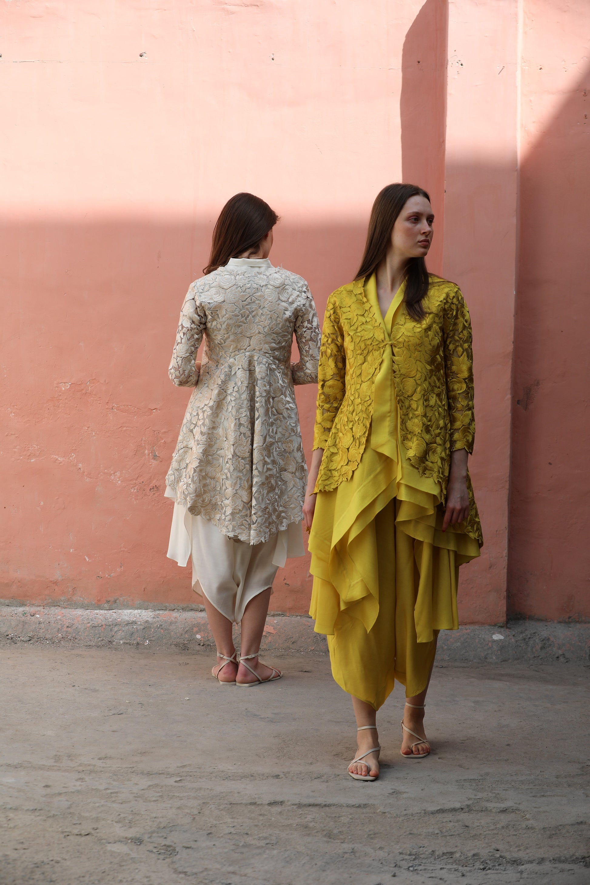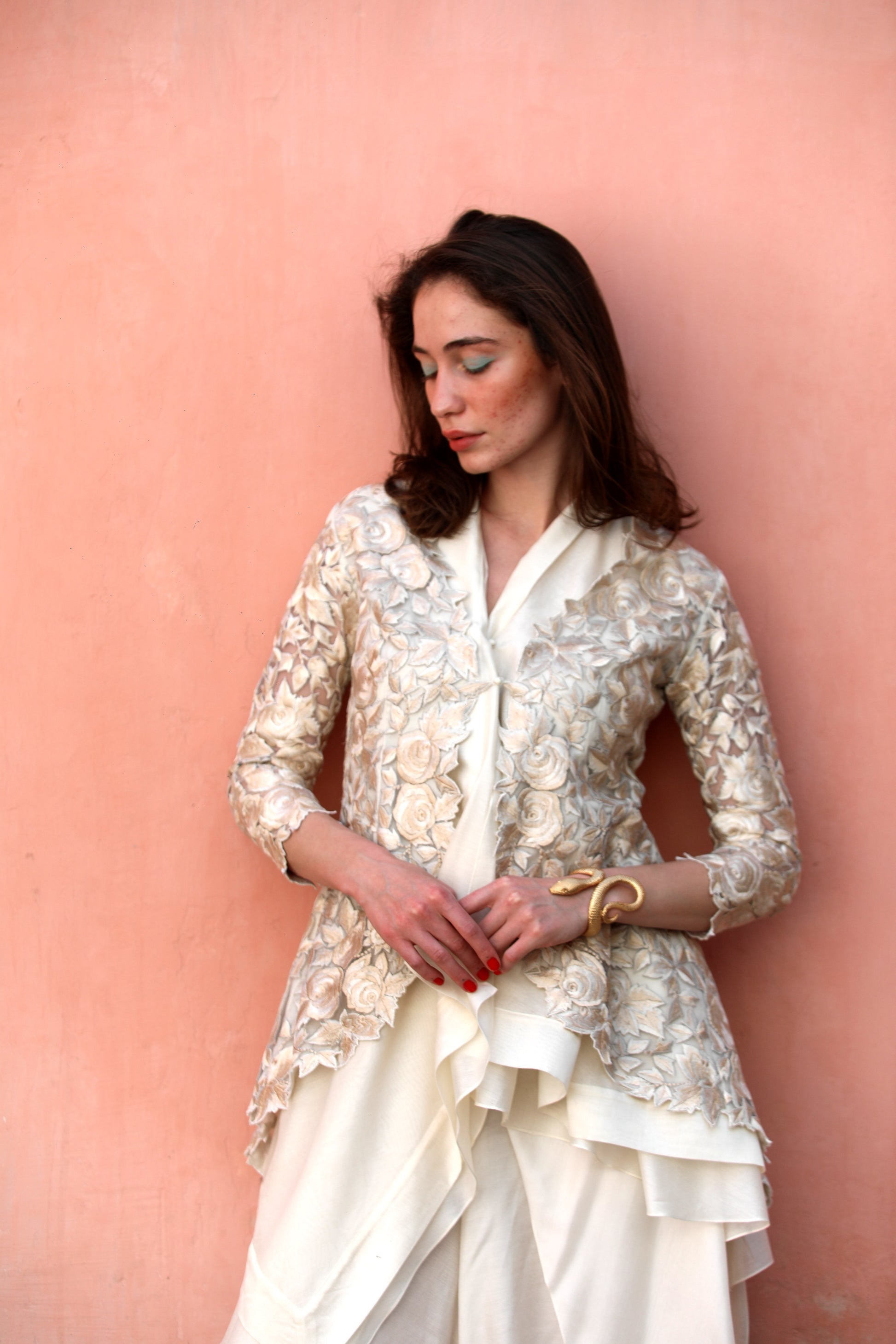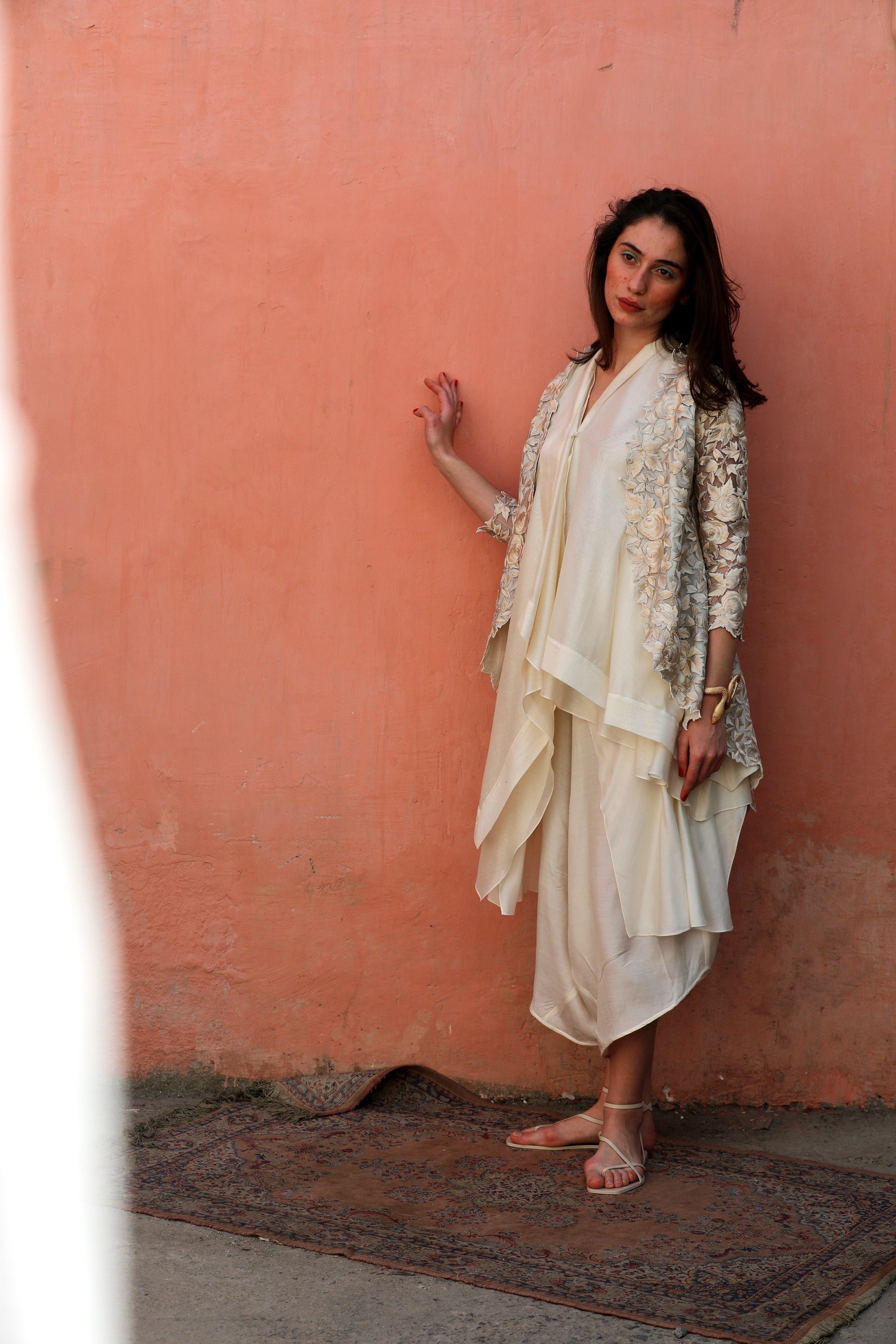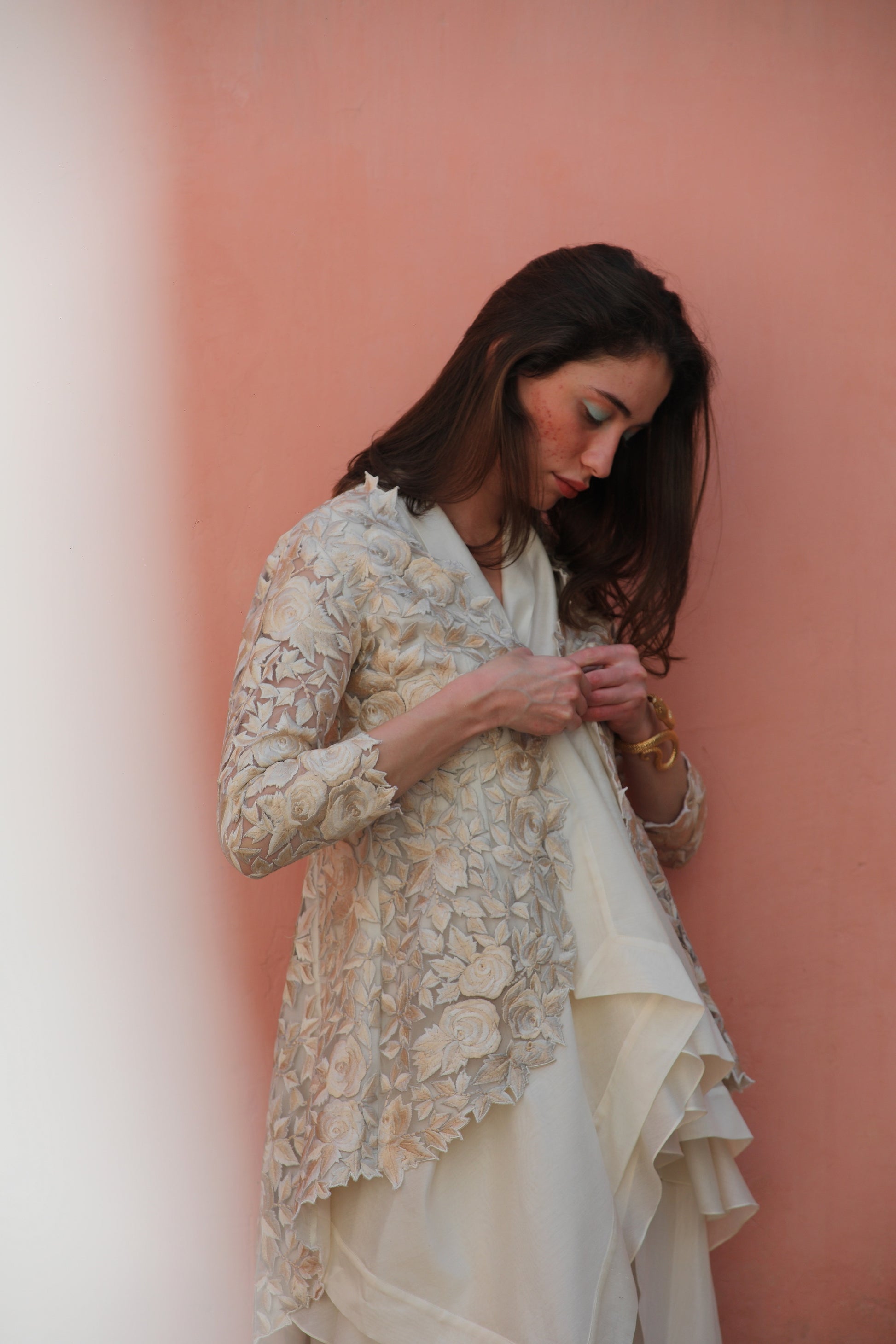 An Offwhite thread embroidered low and high jacket in tulle worn with a chanderi single button asymmetric top and signature low crotch flap pants in Shantung.