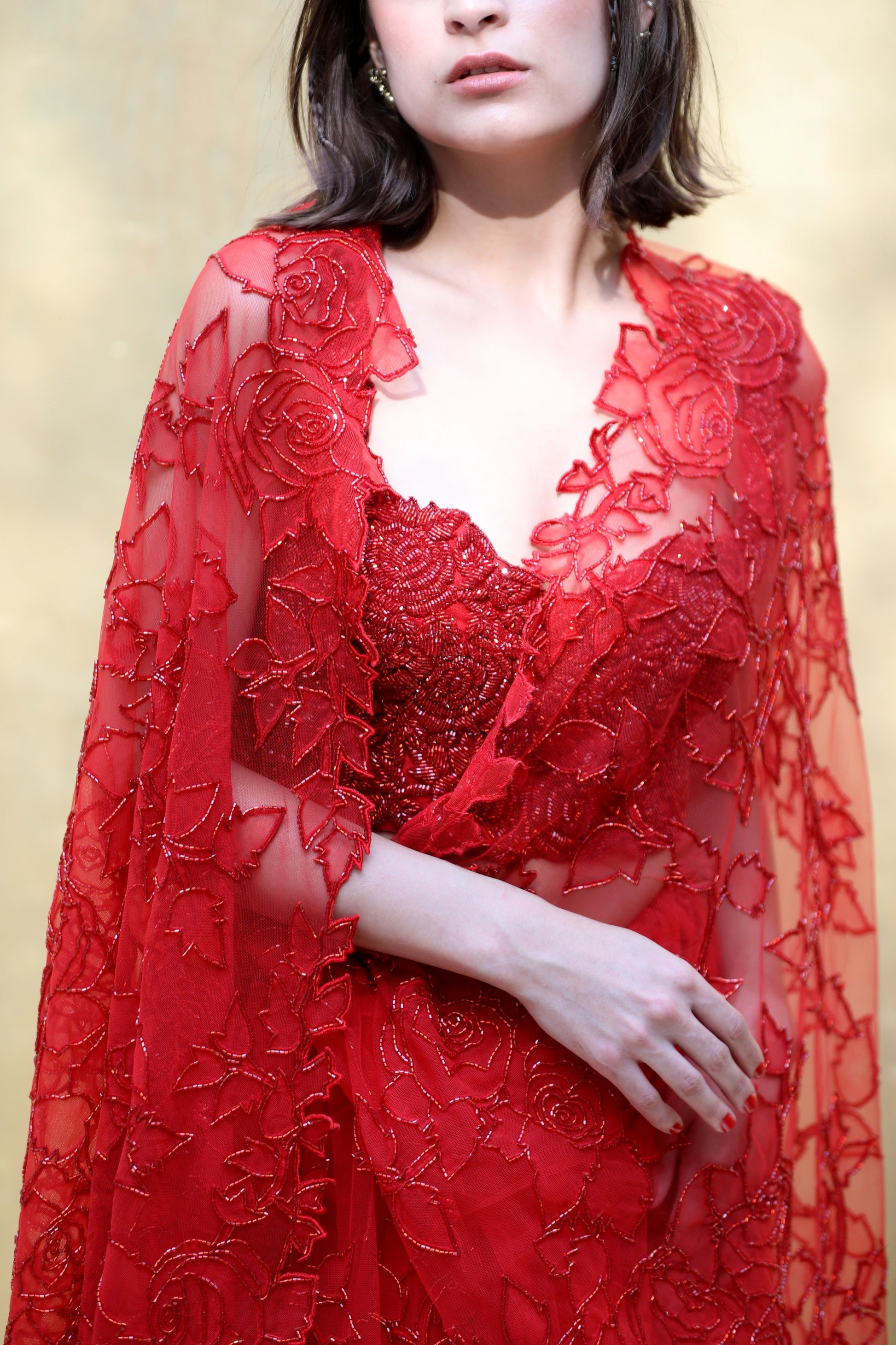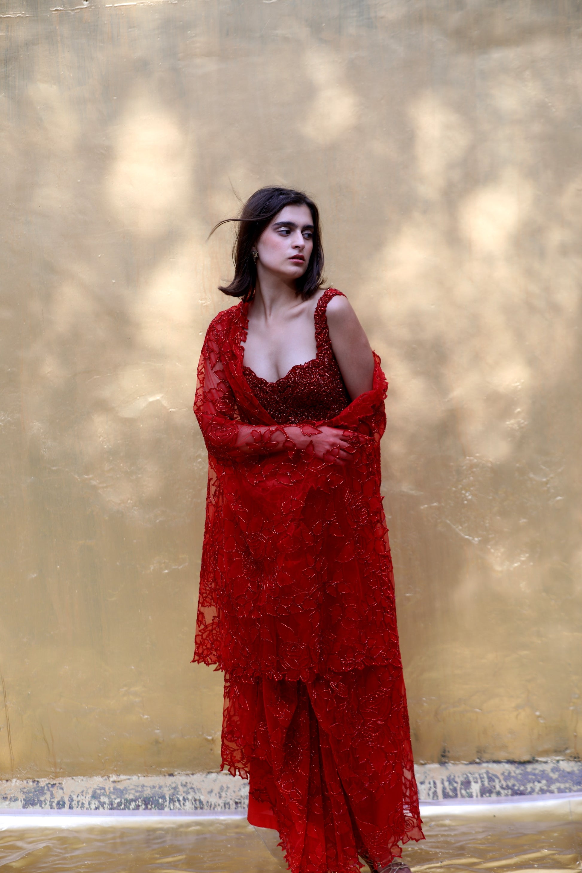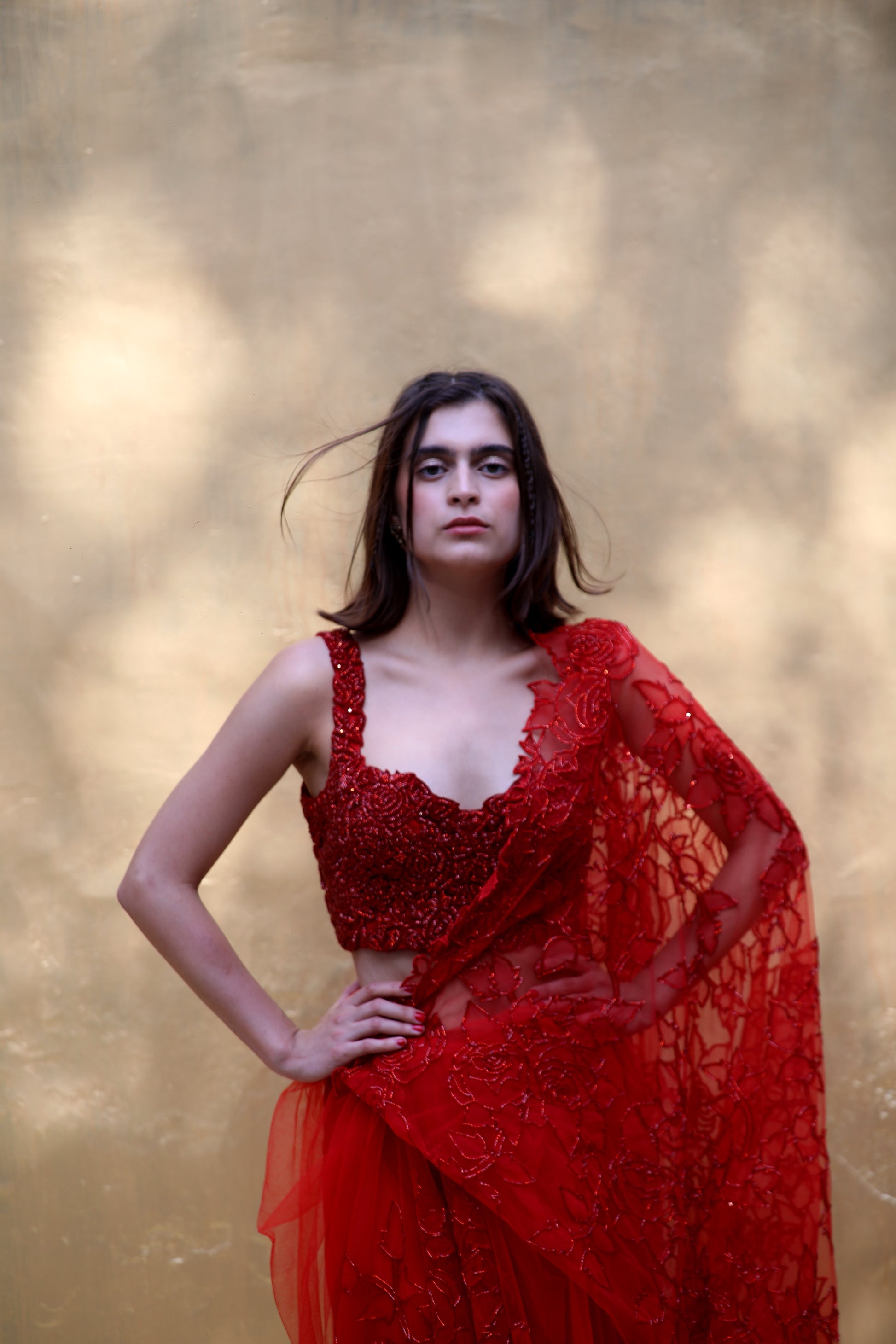 A hand embroidered bugle beads bralette blouse in red worn with a tulle applique sari highlighted with bugle beads and a mashru silk petticoat embroidered in threads all in Signature Floral.