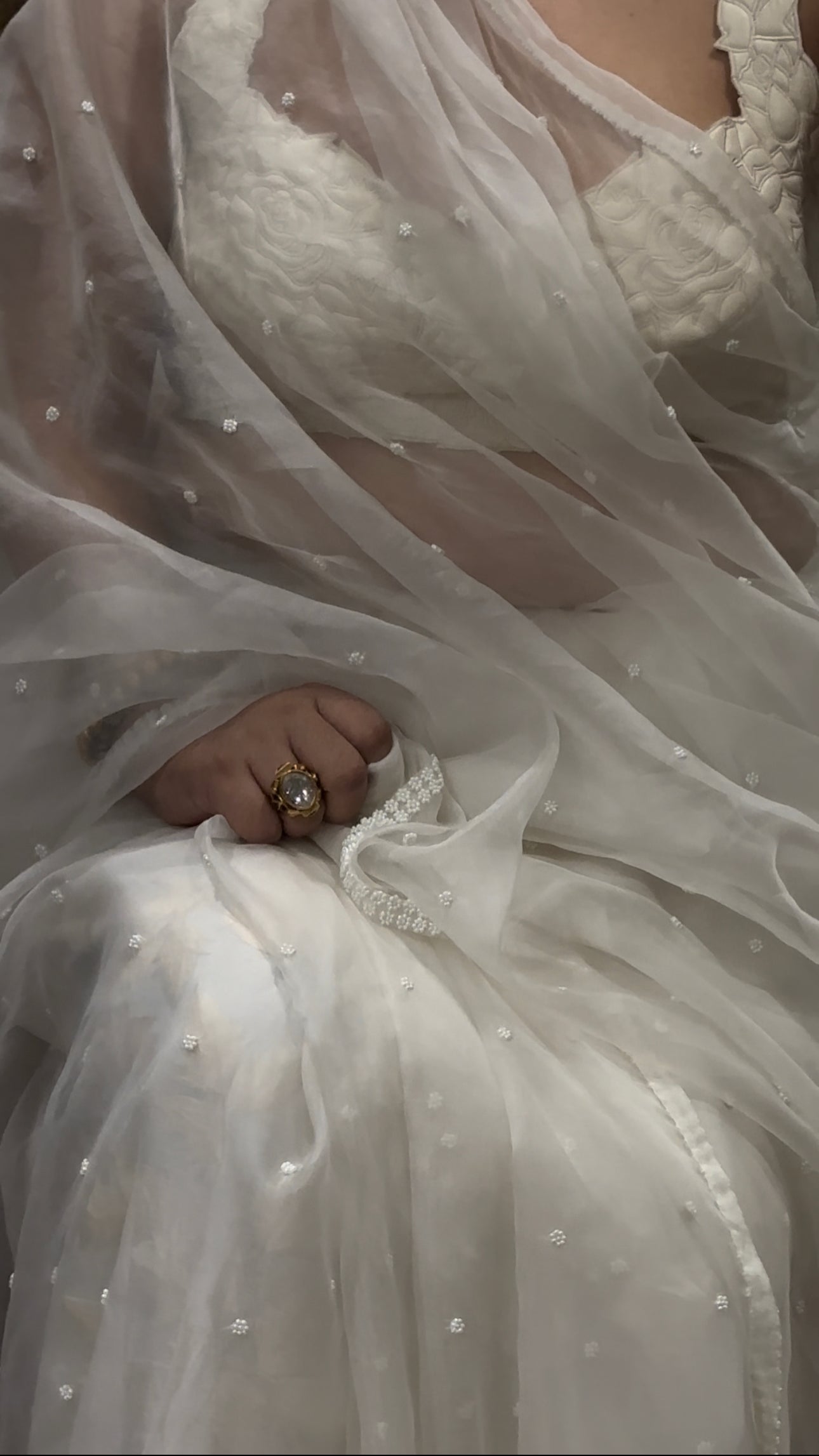 An Ivory organza sari, highlighted with ivory beads at the edges with sprinkling, worn with an embroidered mashru silk petticoat.