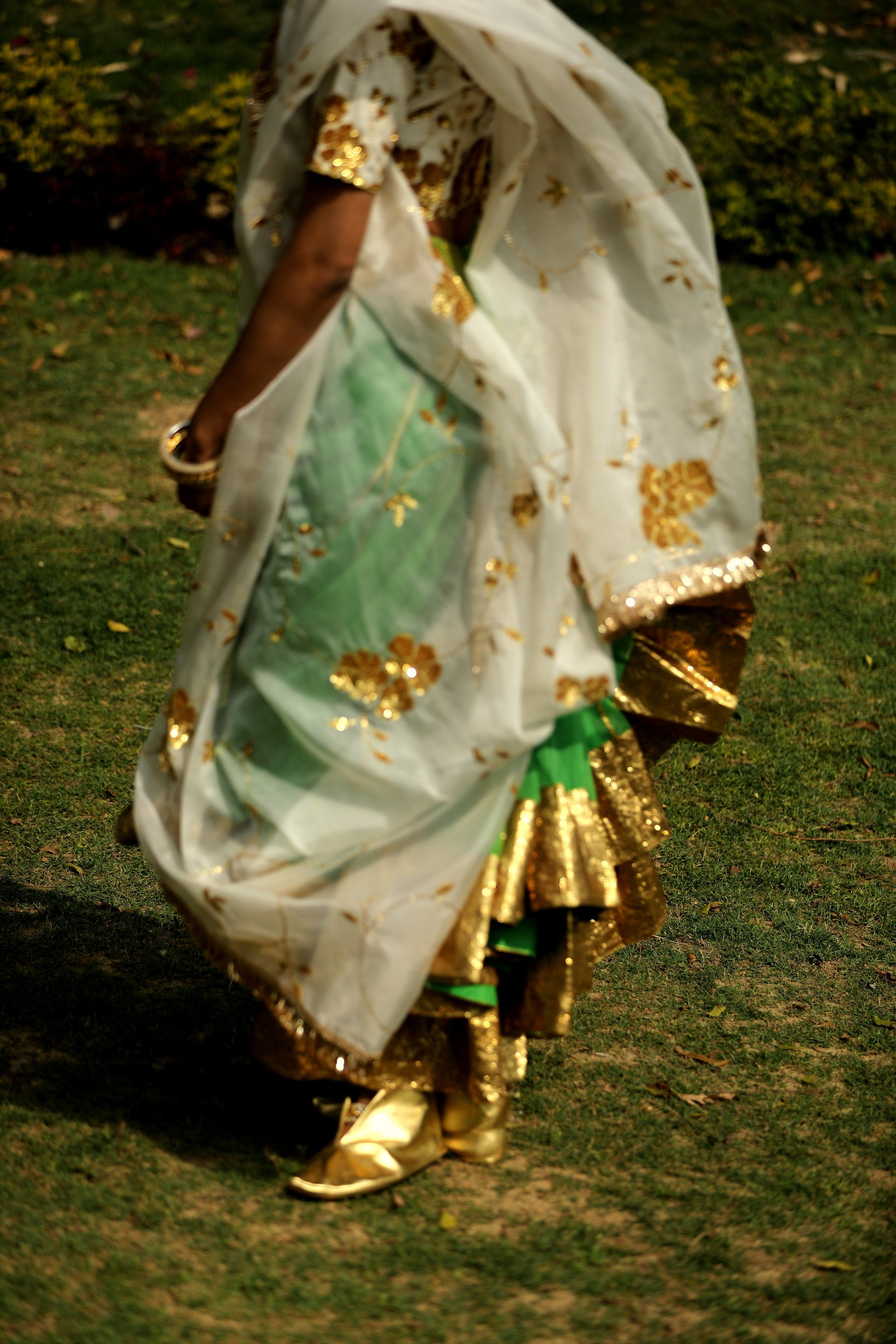 A Bright Green Organza ankle length lehenga highlighted with double gota border worn with a chanderi hand embroidered blouse in sequins with an organza embroidered dupatta highlighted with kiran in Offwhite.
