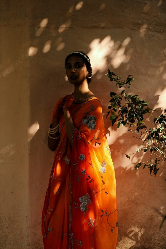 A hand embroidered Organza sari in Pewter glassbeads on ombre hues of orange is worn with a crepe blouse highlighted at edges with the same glassbeads