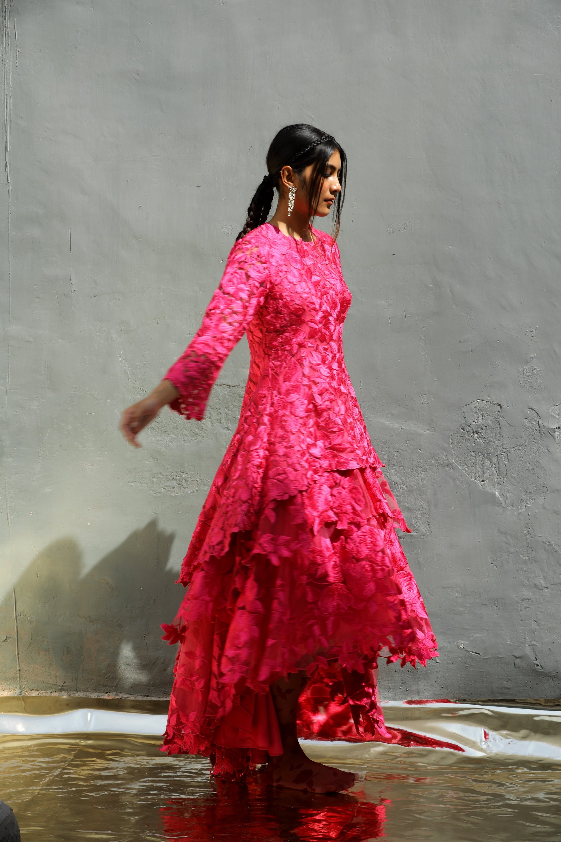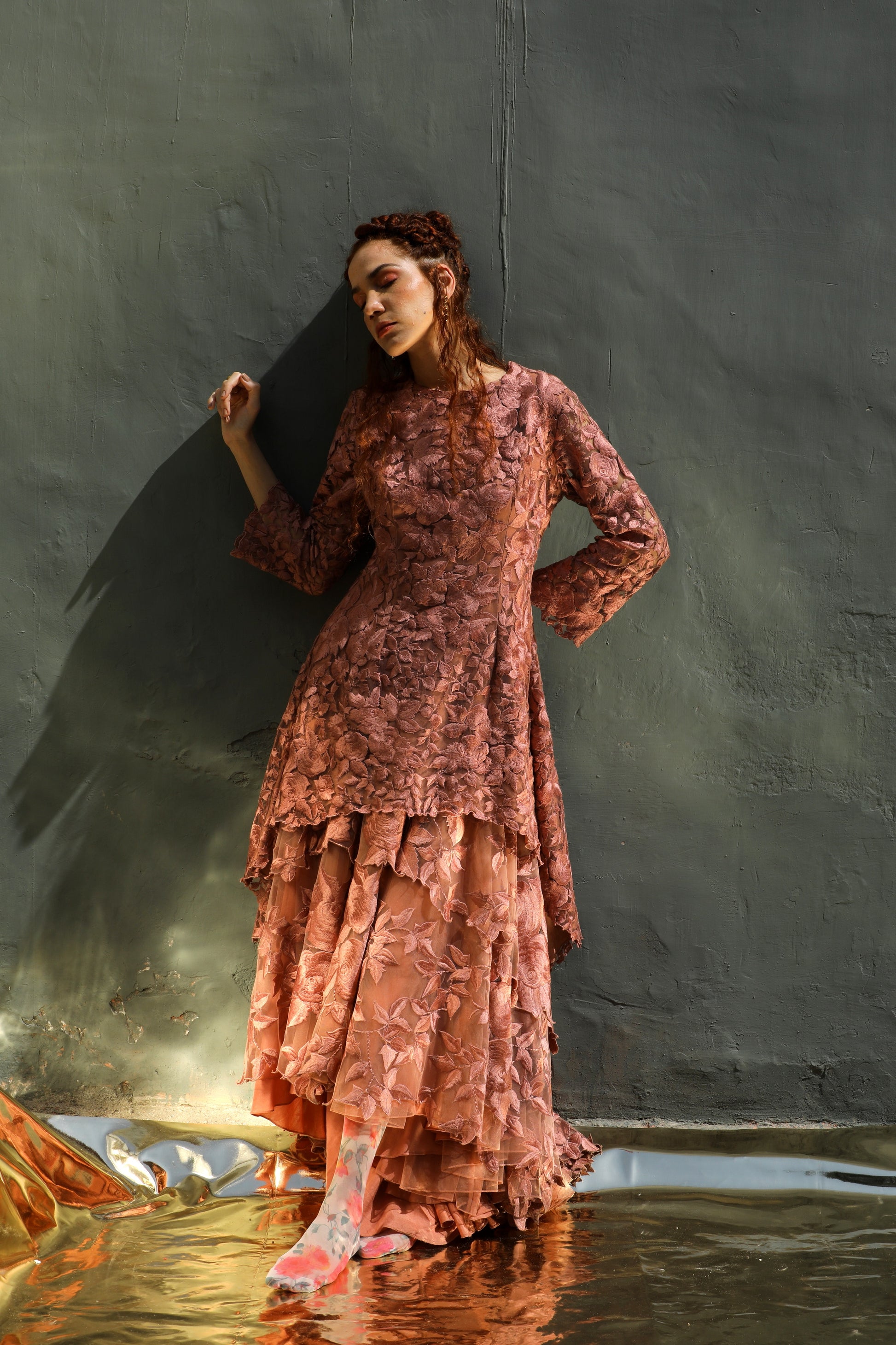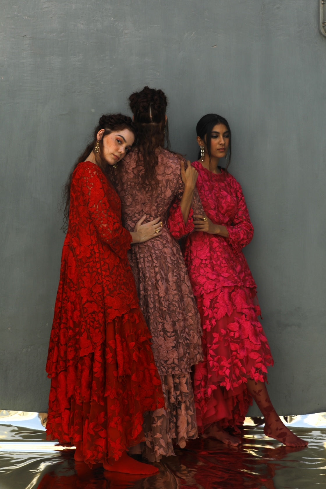 A tulle thread embroidered high and low layered dress worn with a net lycra leggings and a tulle dupatta.