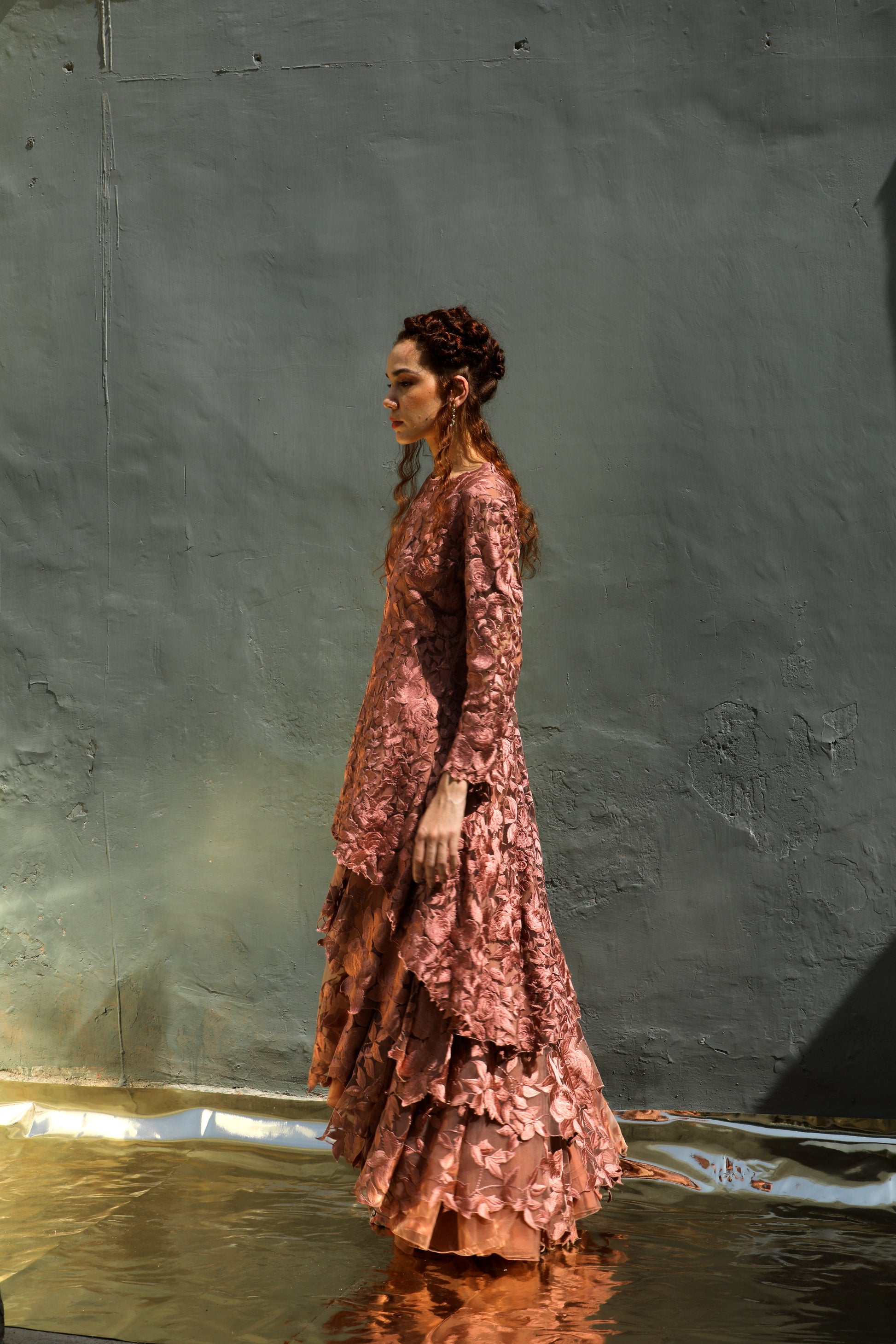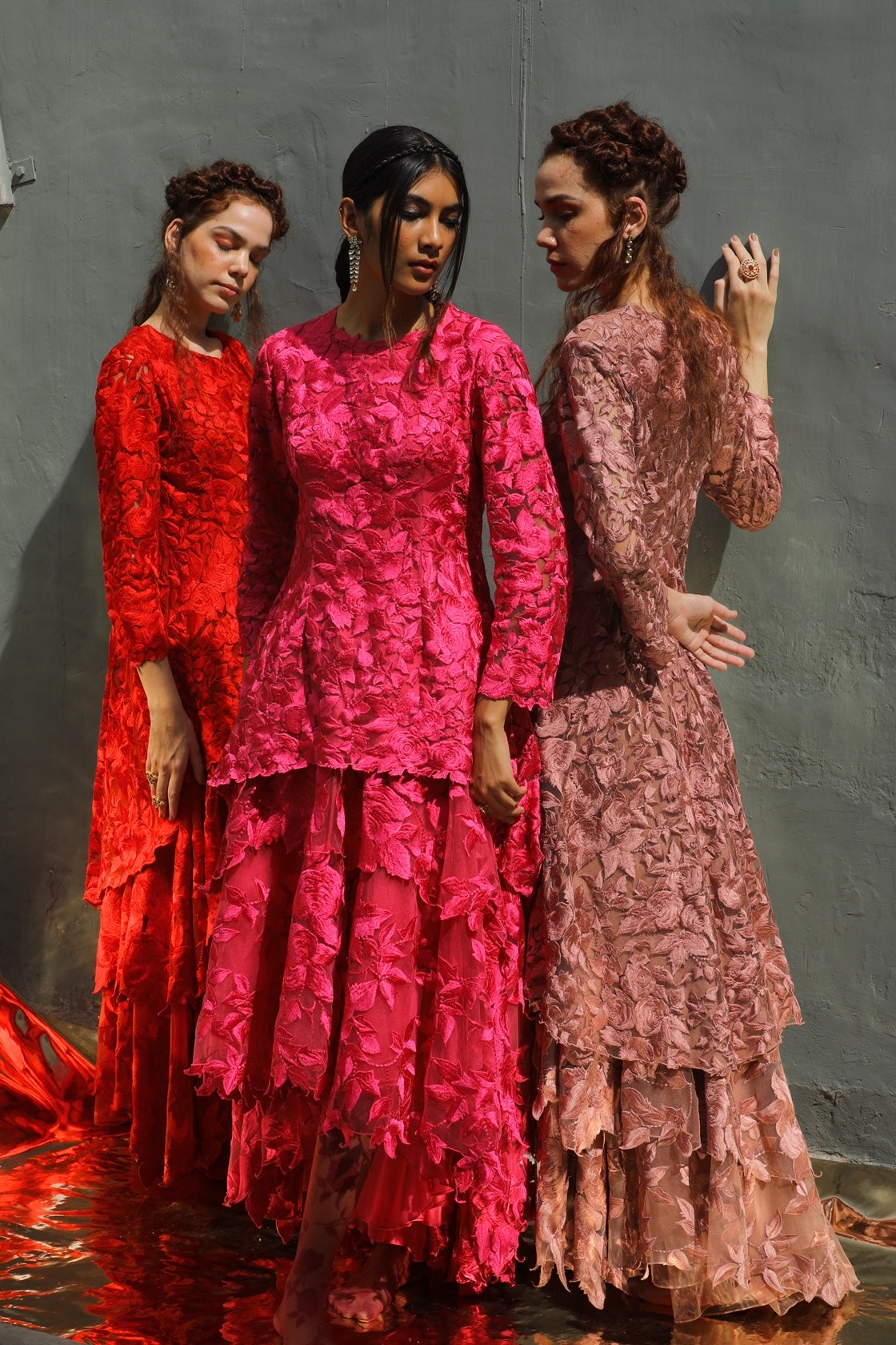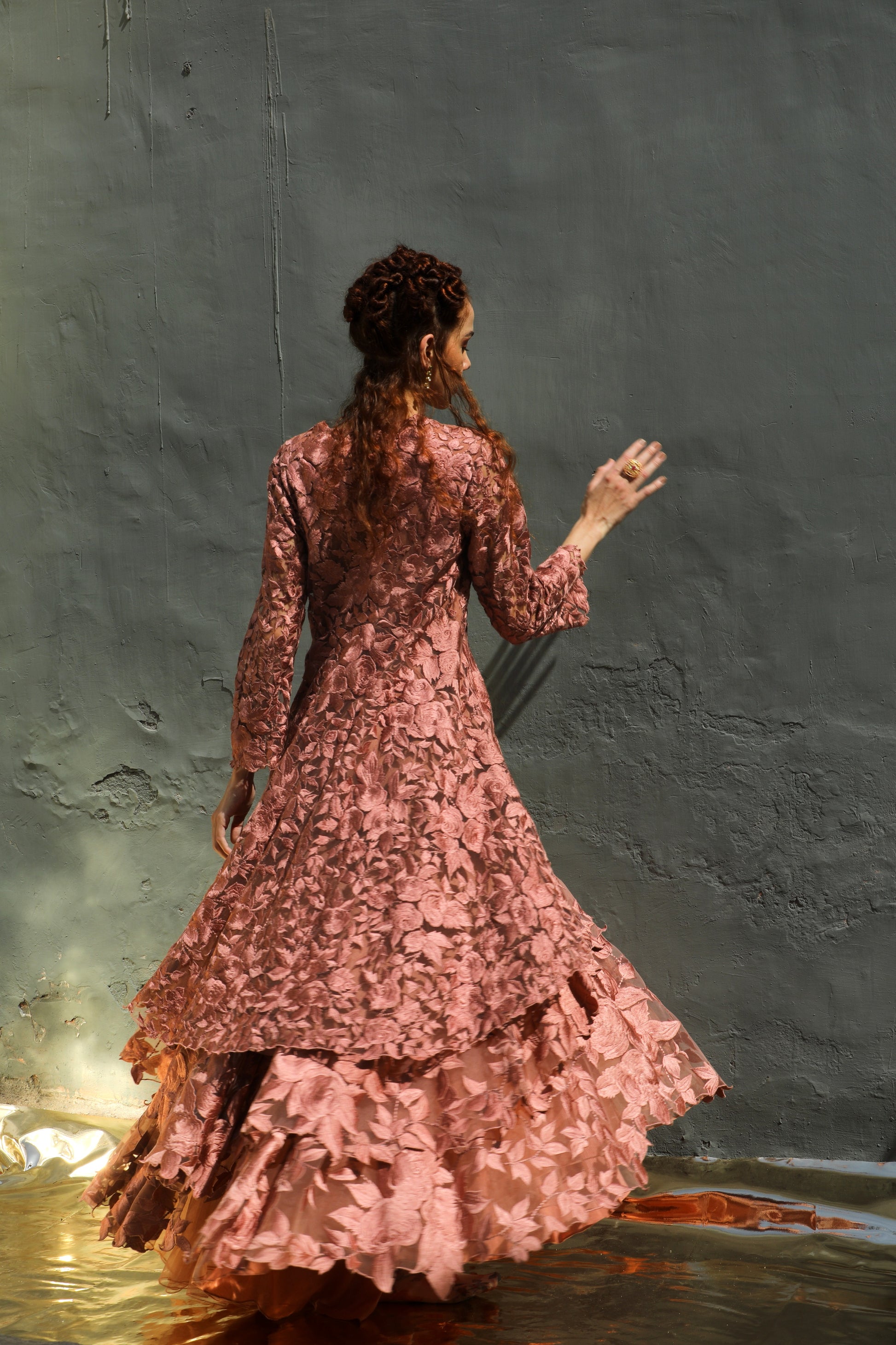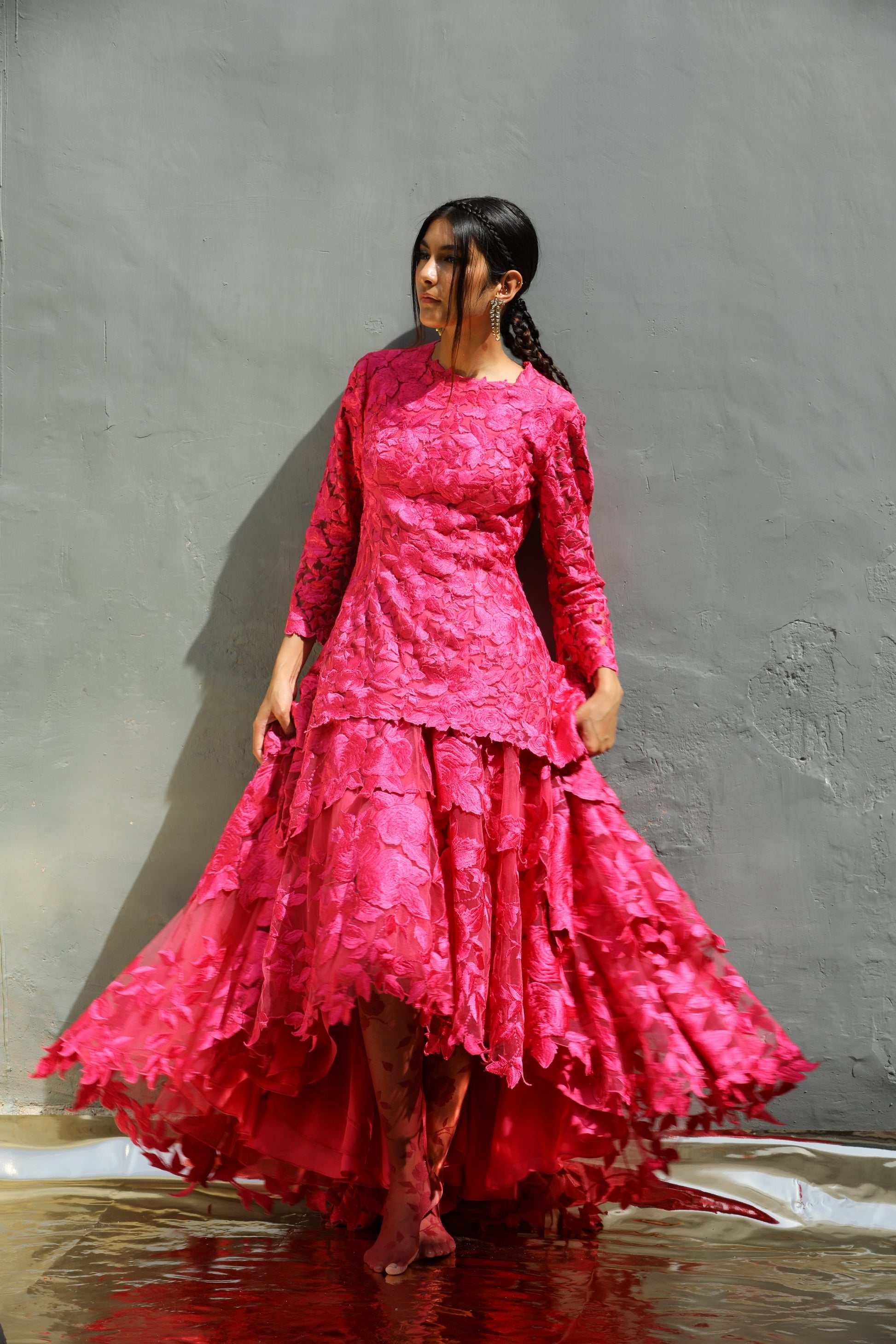A tulle thread embroidered high and low layered dress worn with a net lycra leggings and a tulle dupatta.