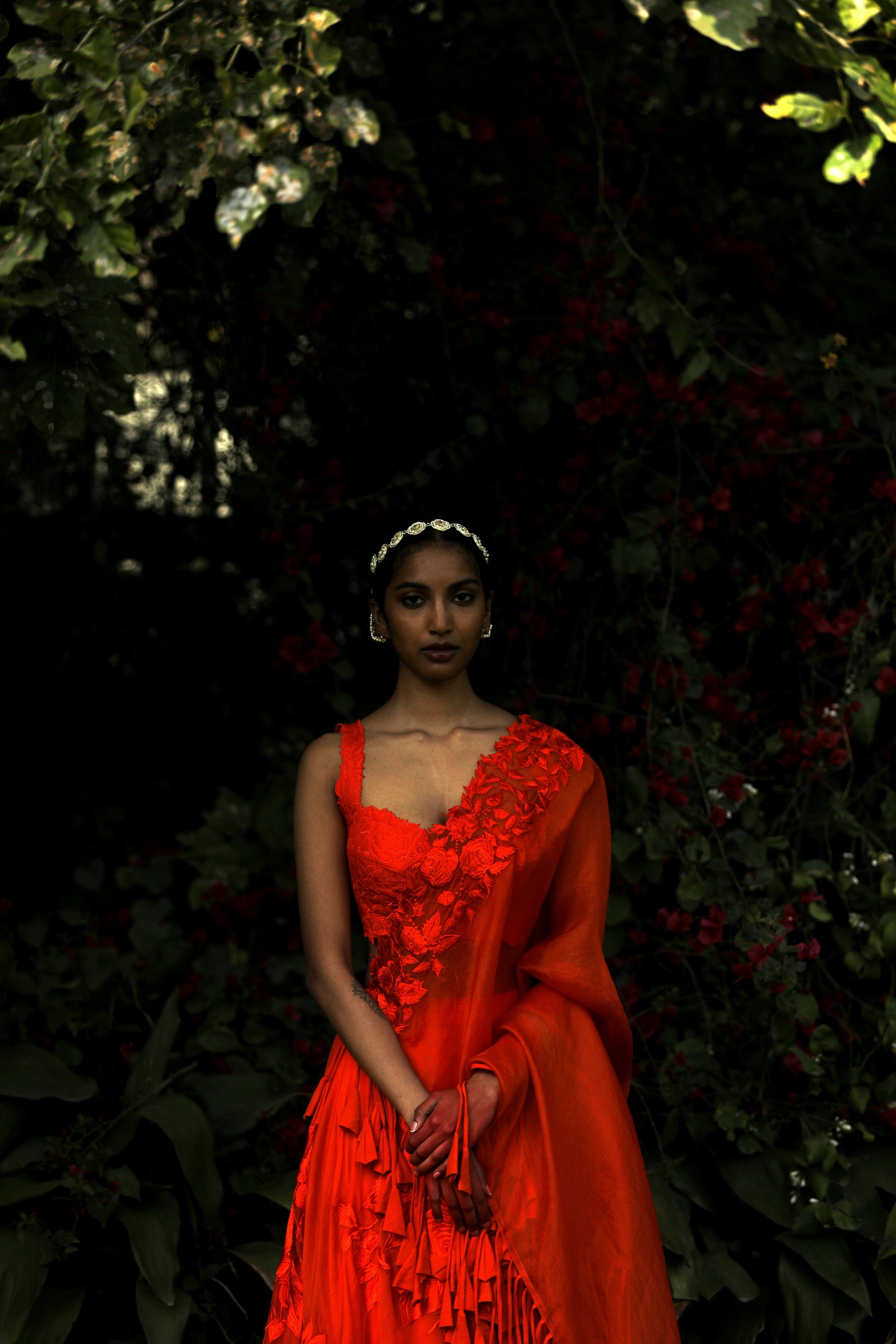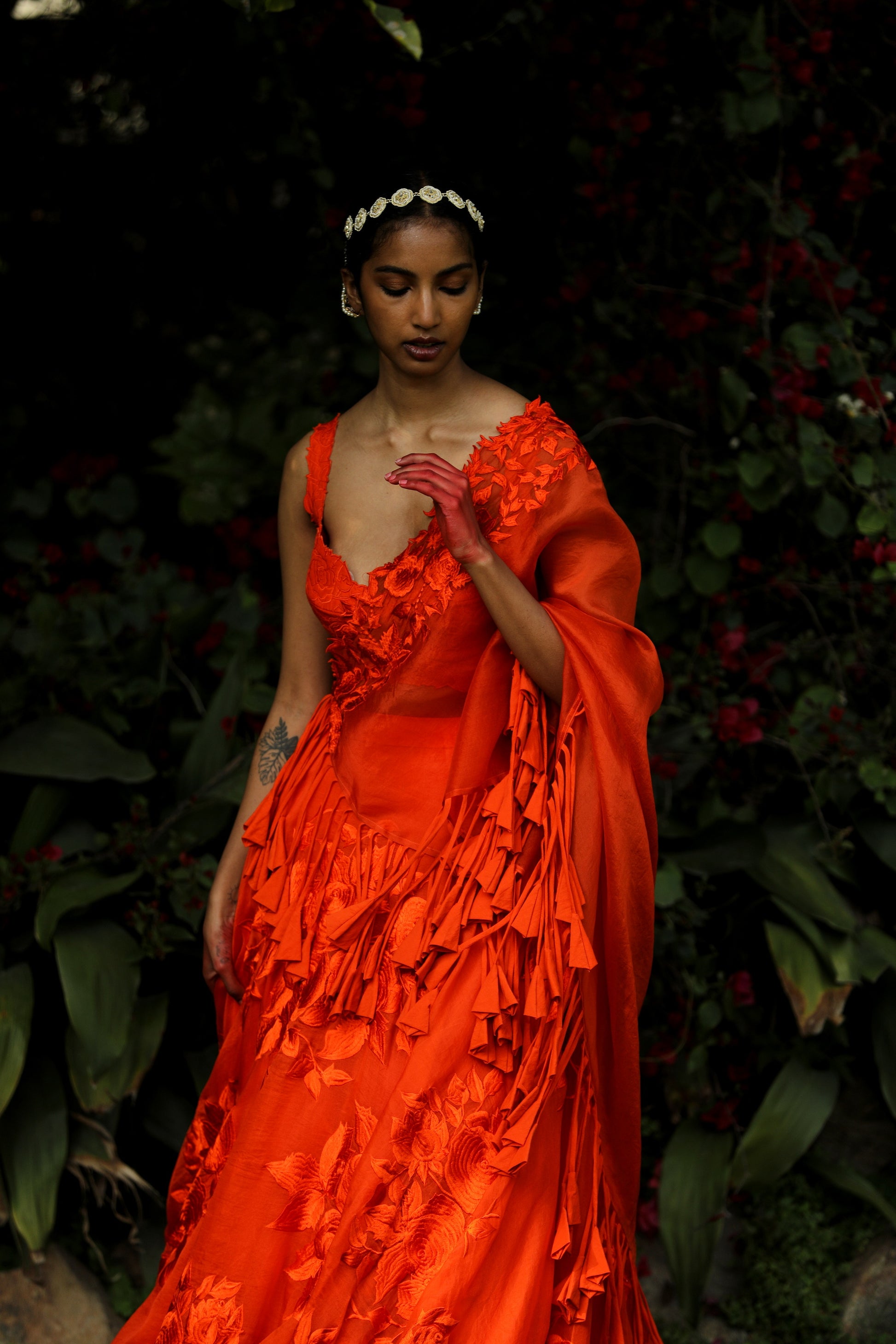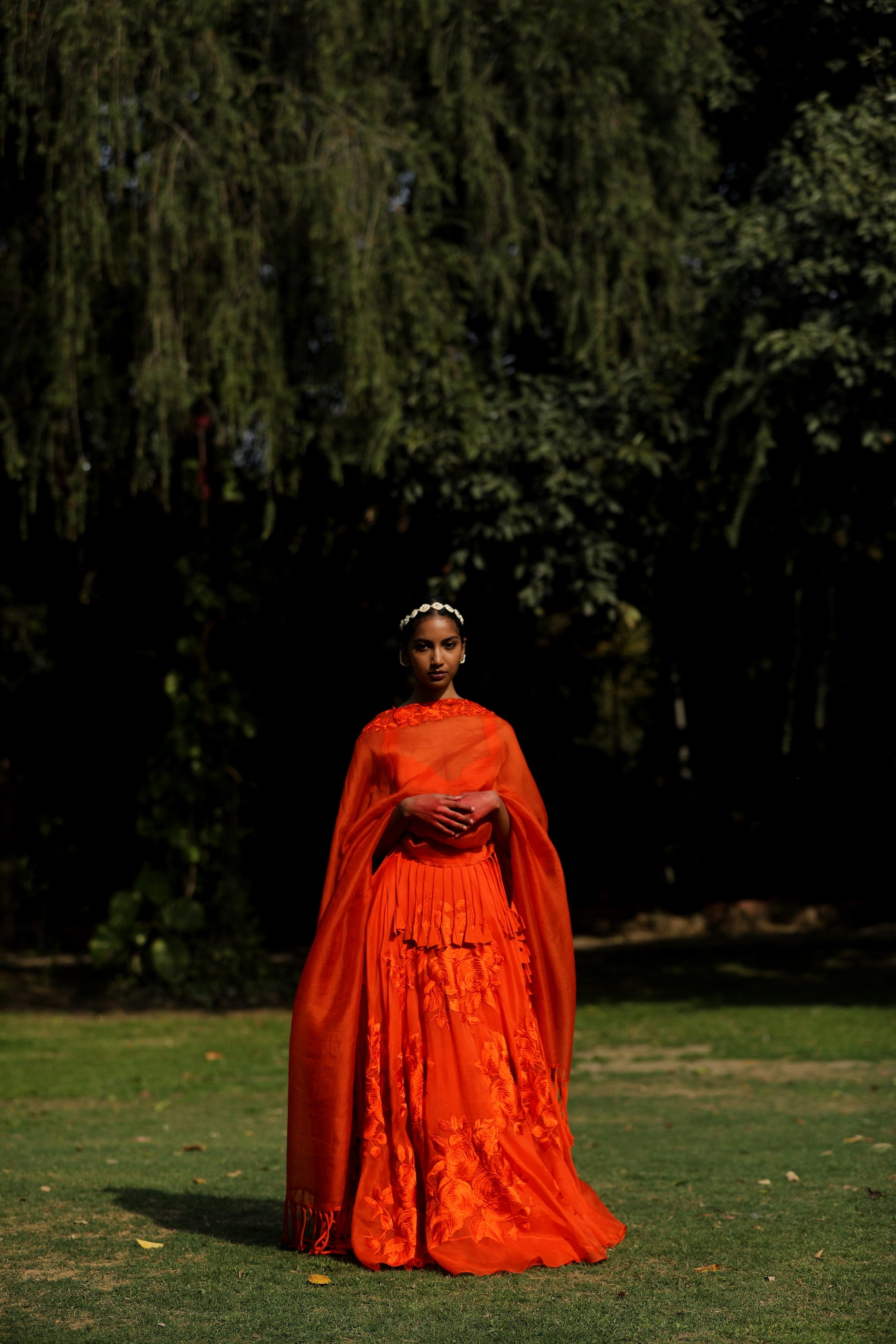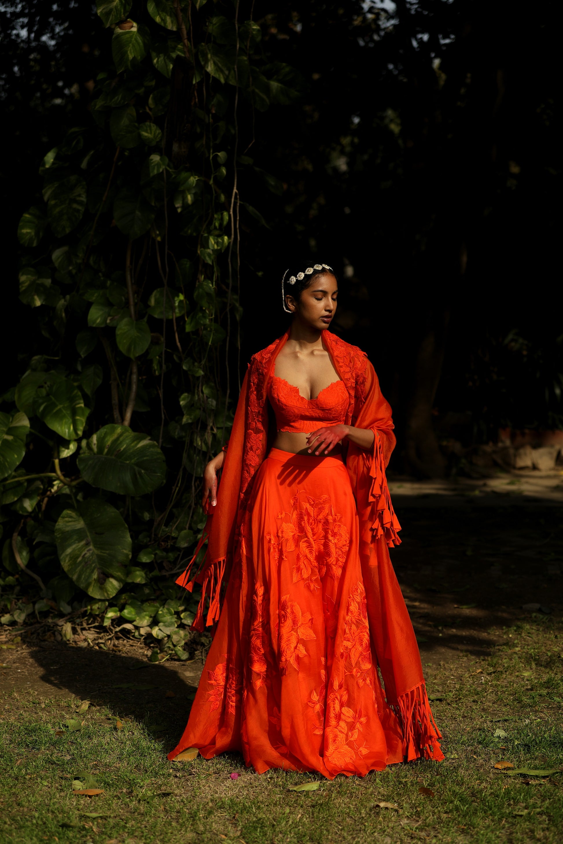 An organza floral thread embroidered lehenga worn with silk quilted bralette and an organza dupatta highlighted with thread embroidery on edges, all in Orange colour.