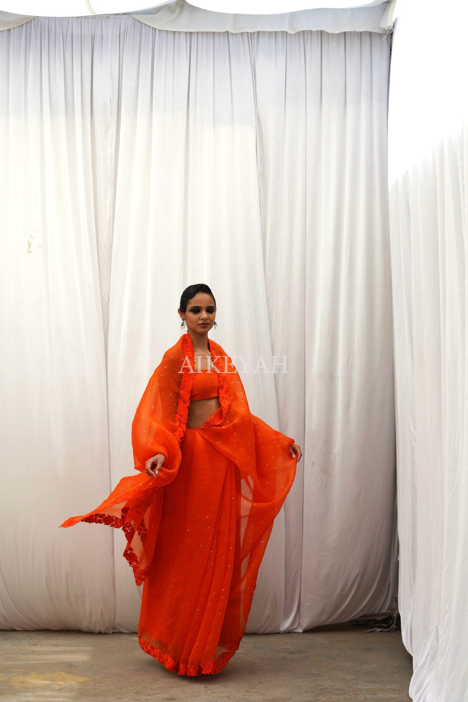 A light grey organza sari embroidered in signature floral border and highlighted with gold sequins all over.