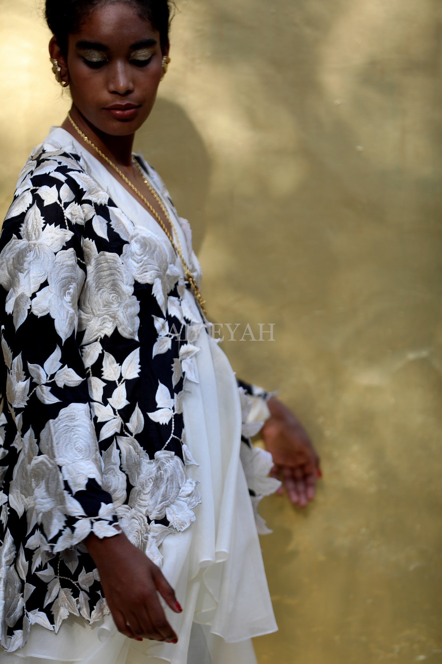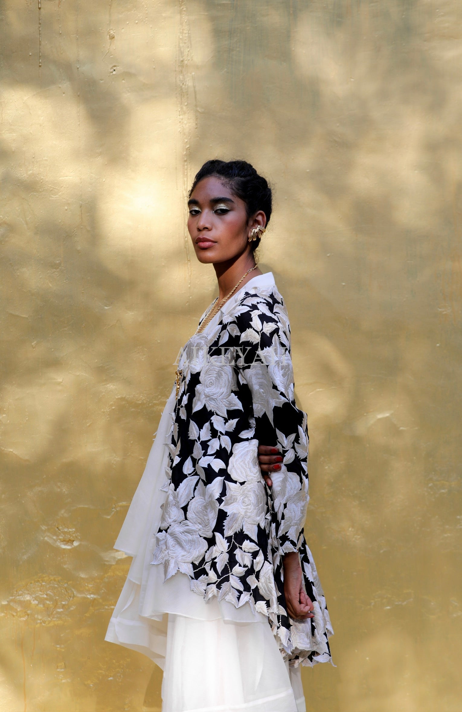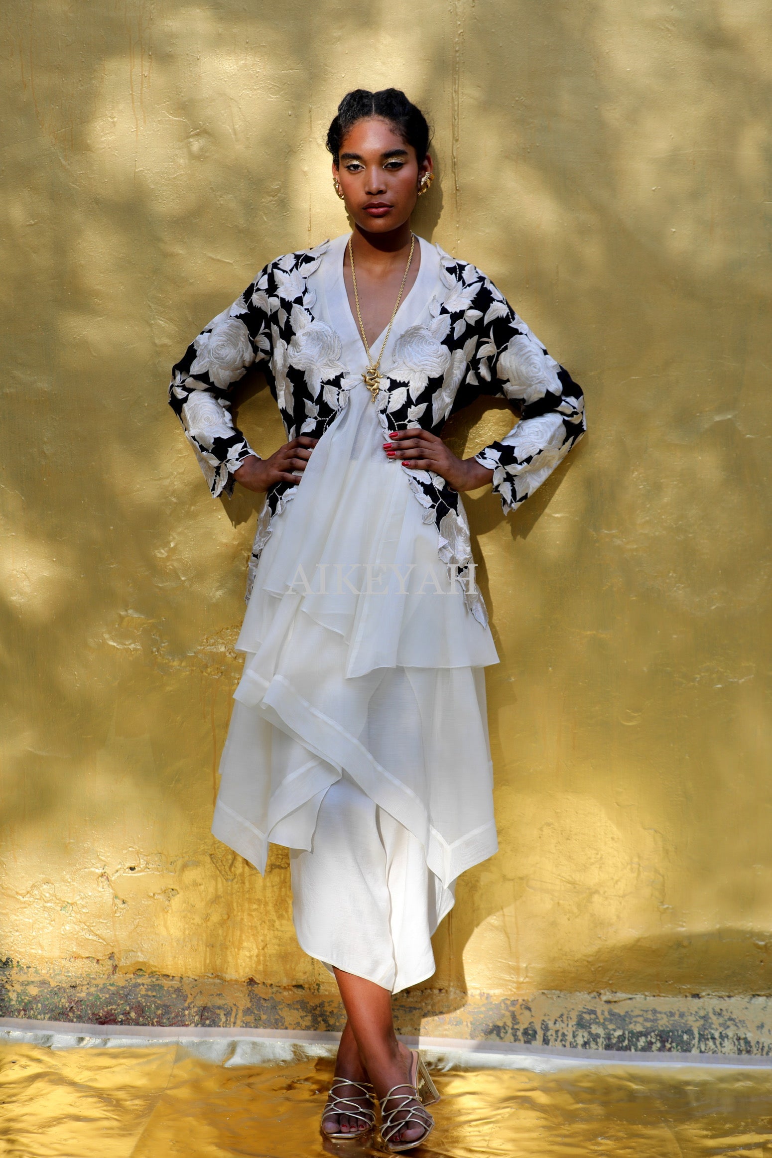 Chanderi asymmetric layered top worn with low crotch pants in shantung in ivory styled with aikeyah's signature Edwardian style jacket in black embroidered with ivory thread floral.
