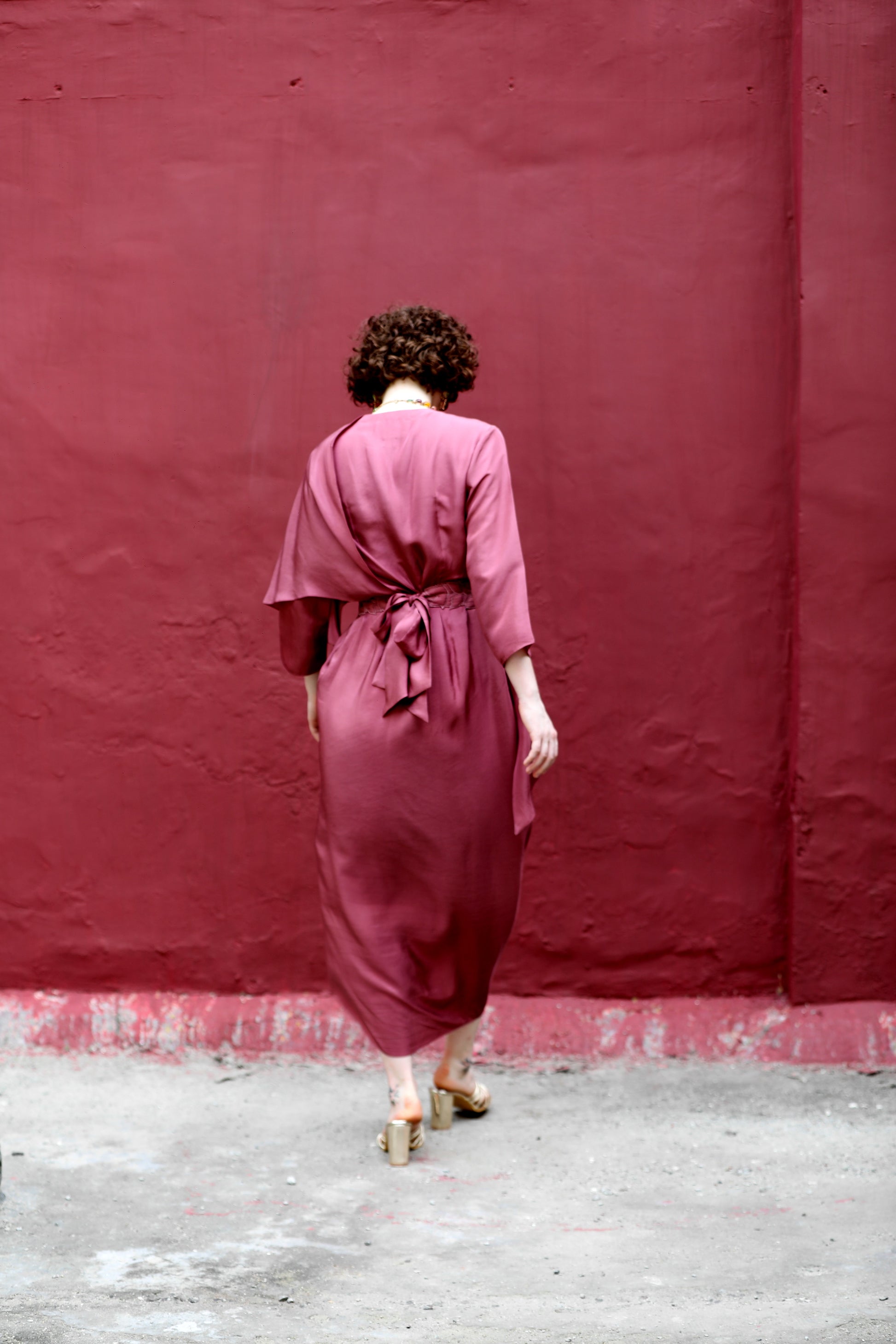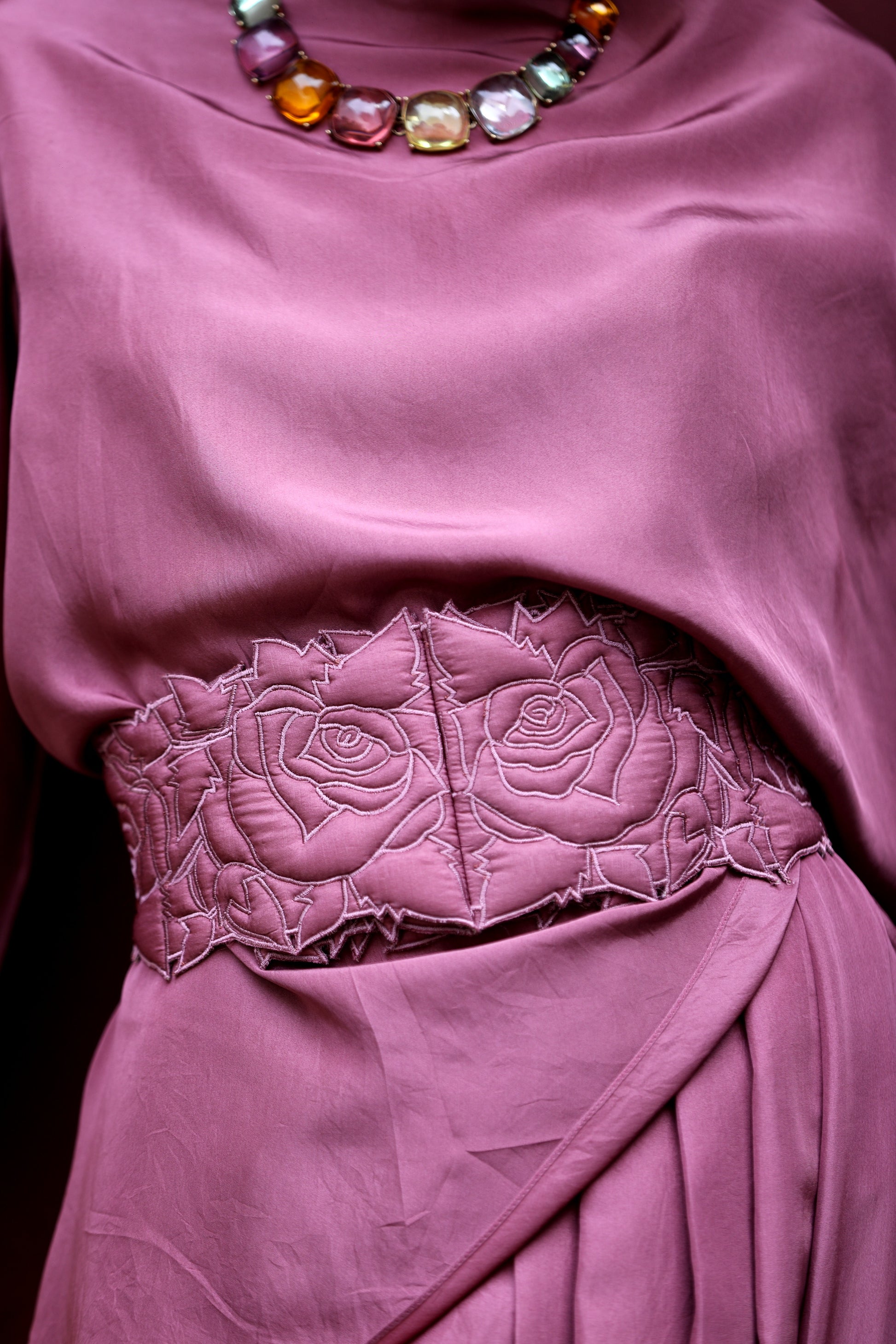 A silk drape dress worn with a quilted floral belt, all in Bermuda Onion color.