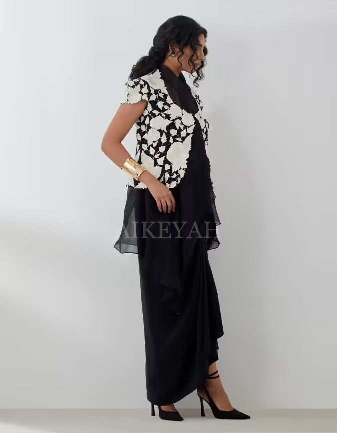 A black and ivory classic signature jacket worn with an organza sheer top with silk skirt.
