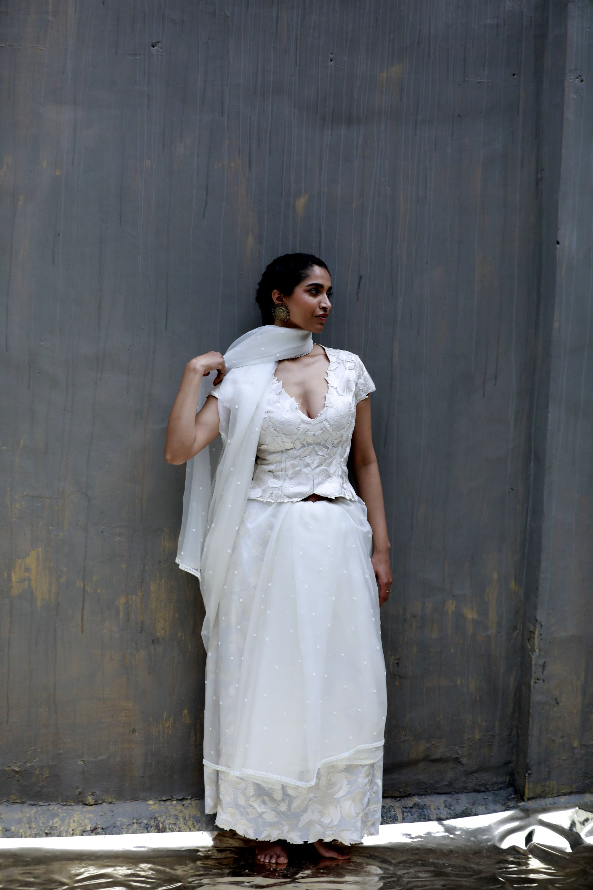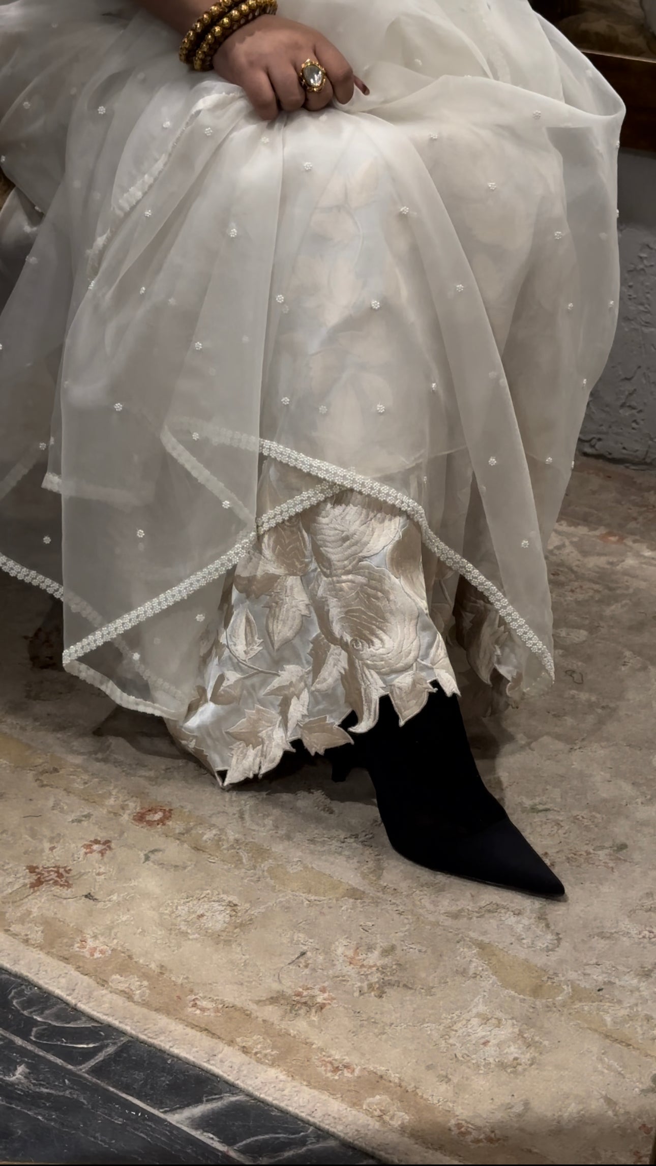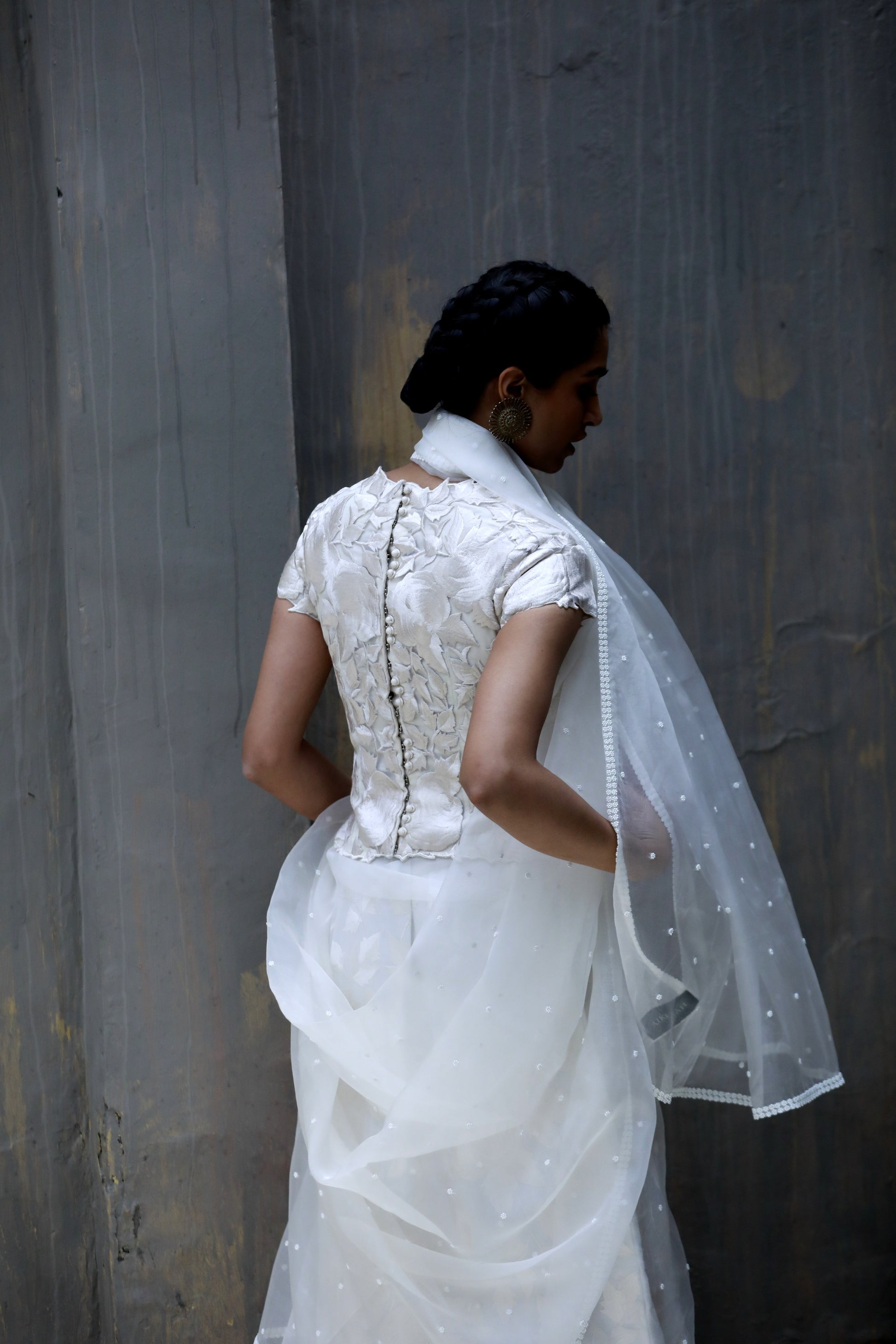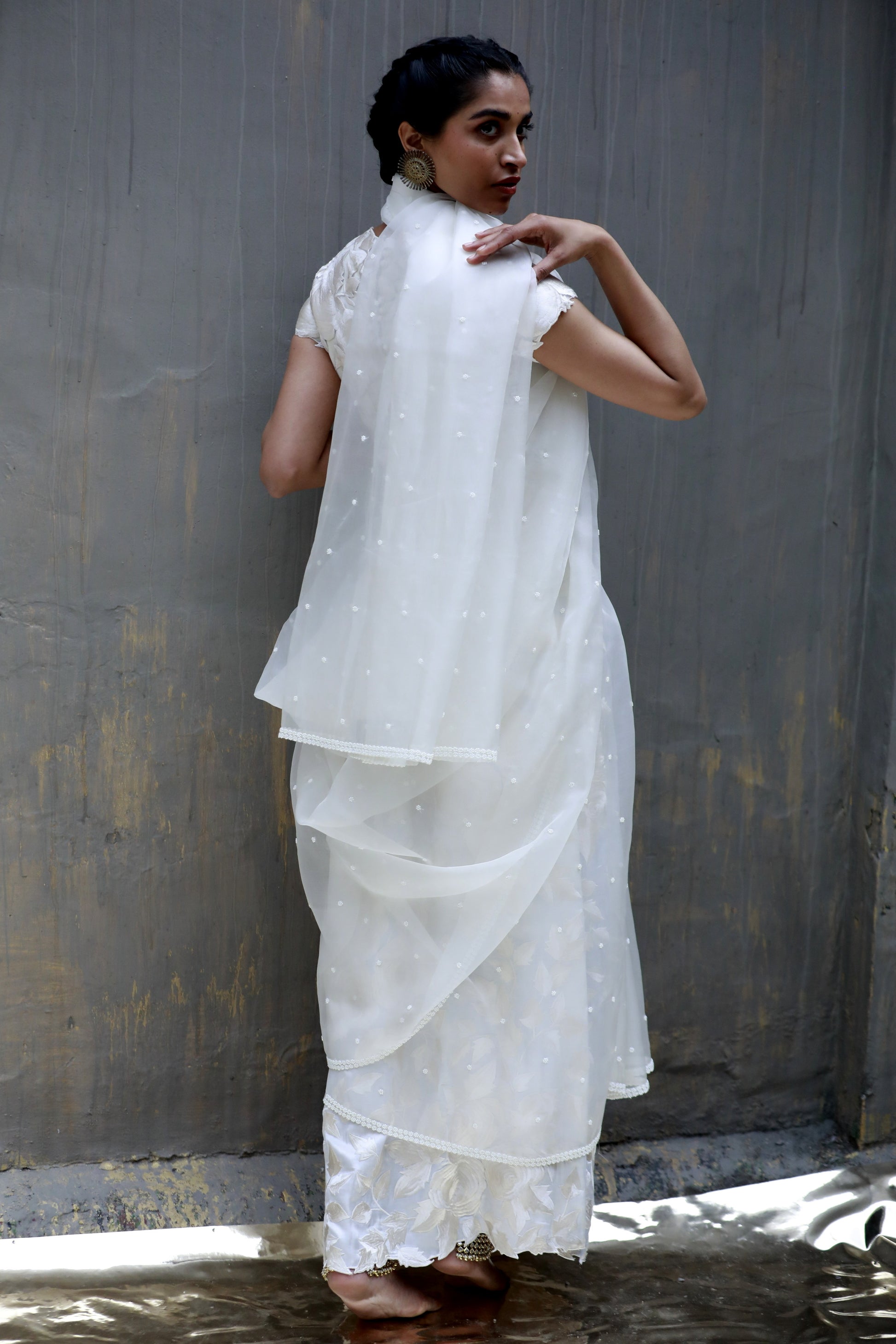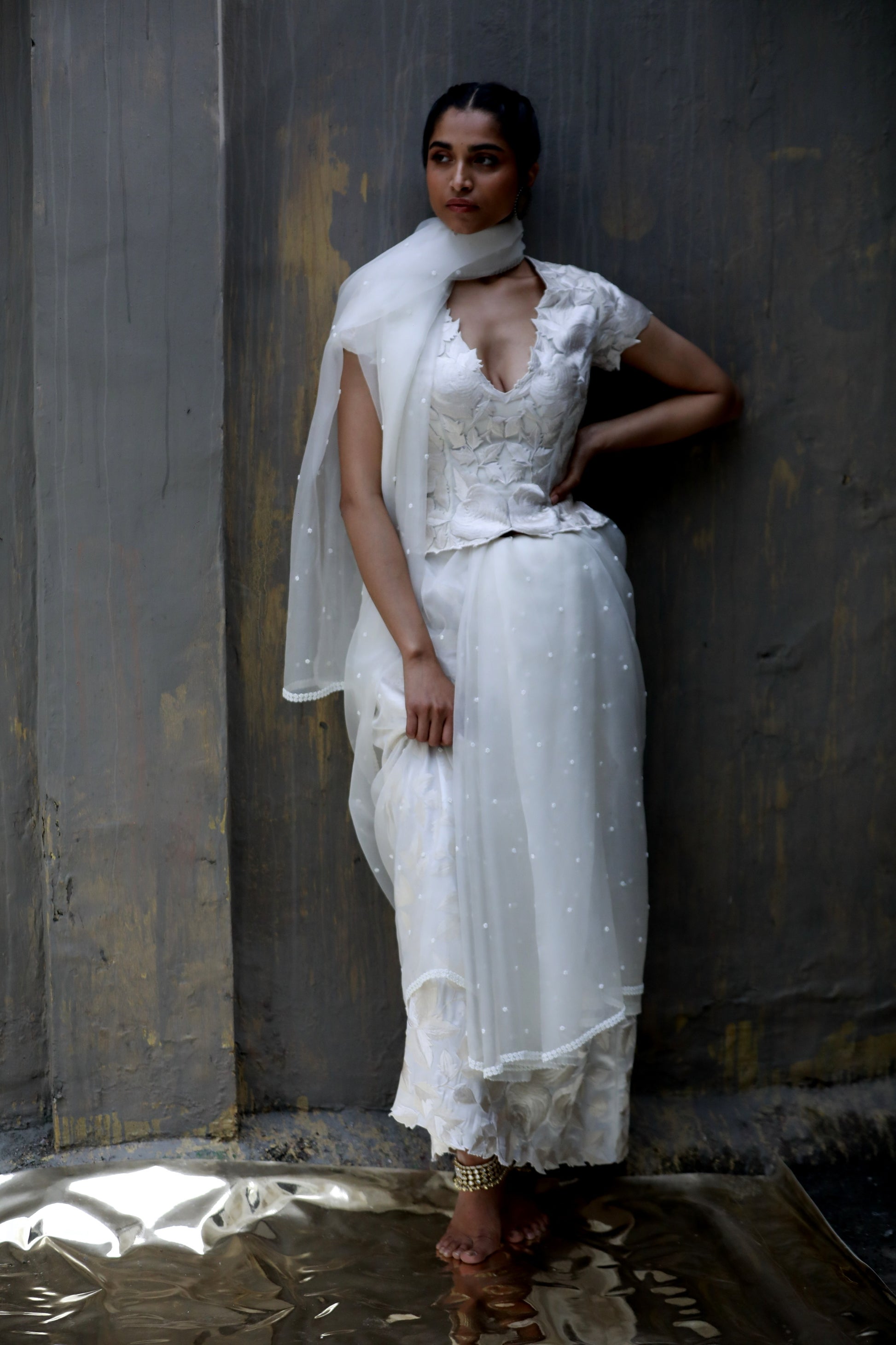 An Ivory organza sari, highlighted with ivory beads at the edges with sprinkling, worn with an embroidered mashru silk petticoat and an embroidered blouse or a signature silk quilted bralette.