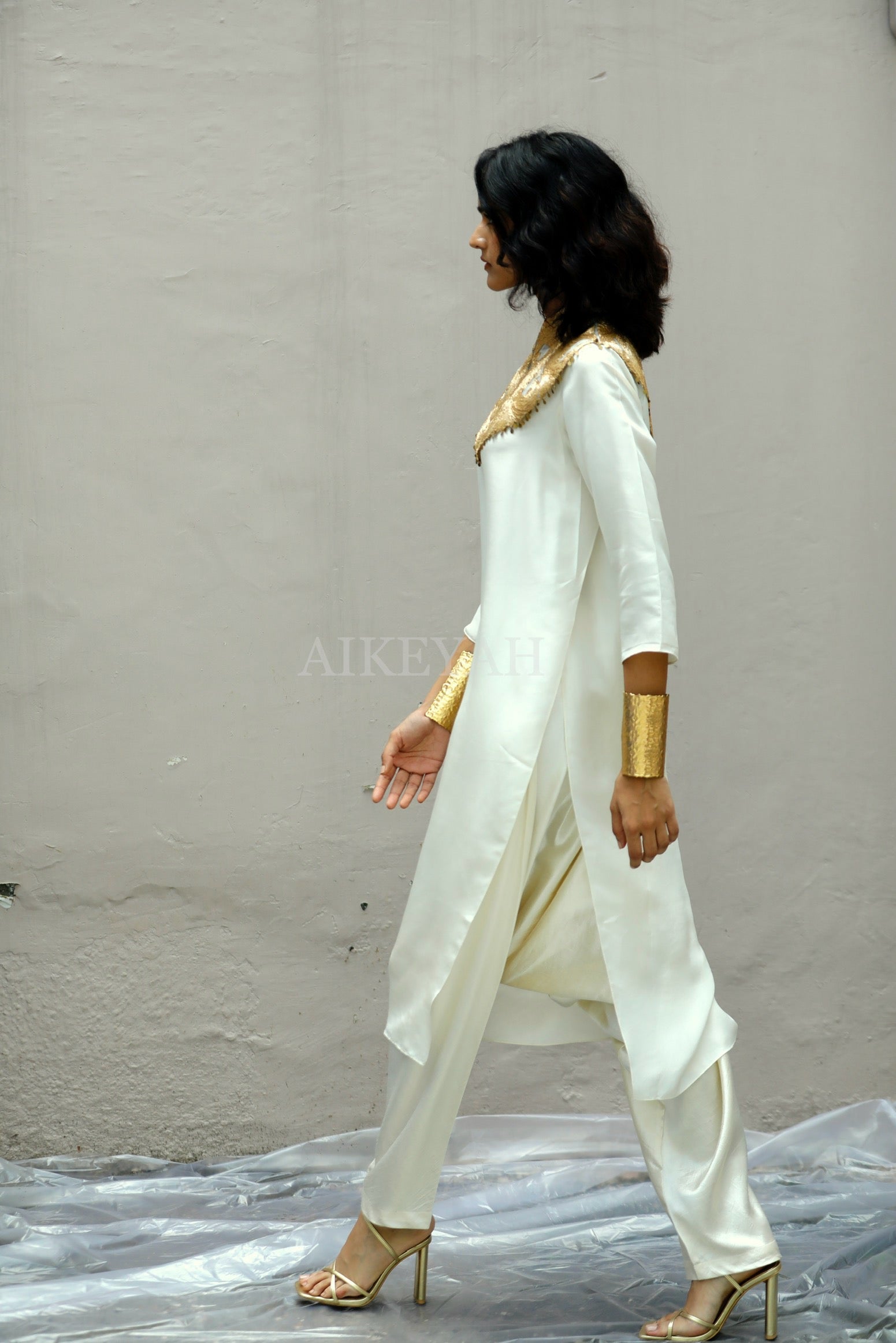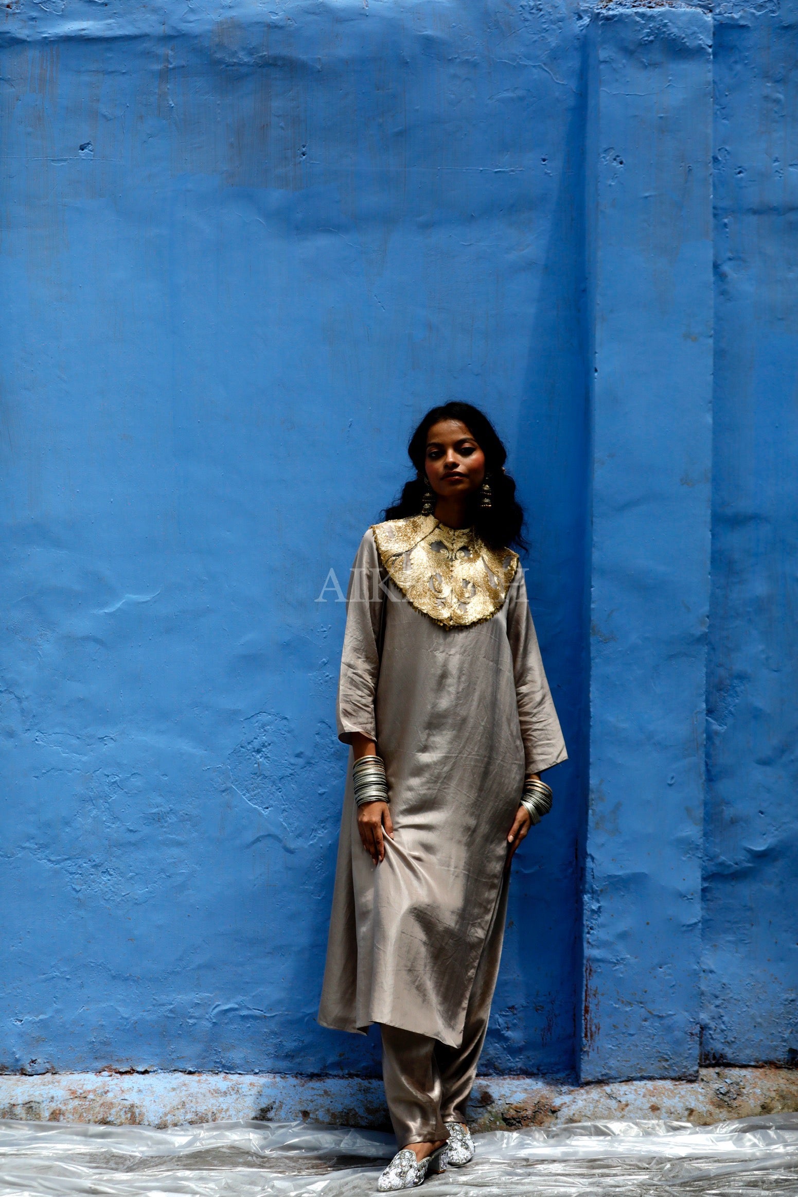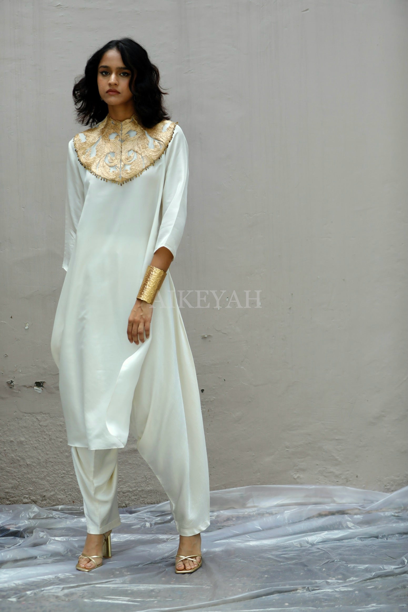 A Habutai silk straight tunic worn with mashru silk drop crotch straight pants and an embroidered gold collar.