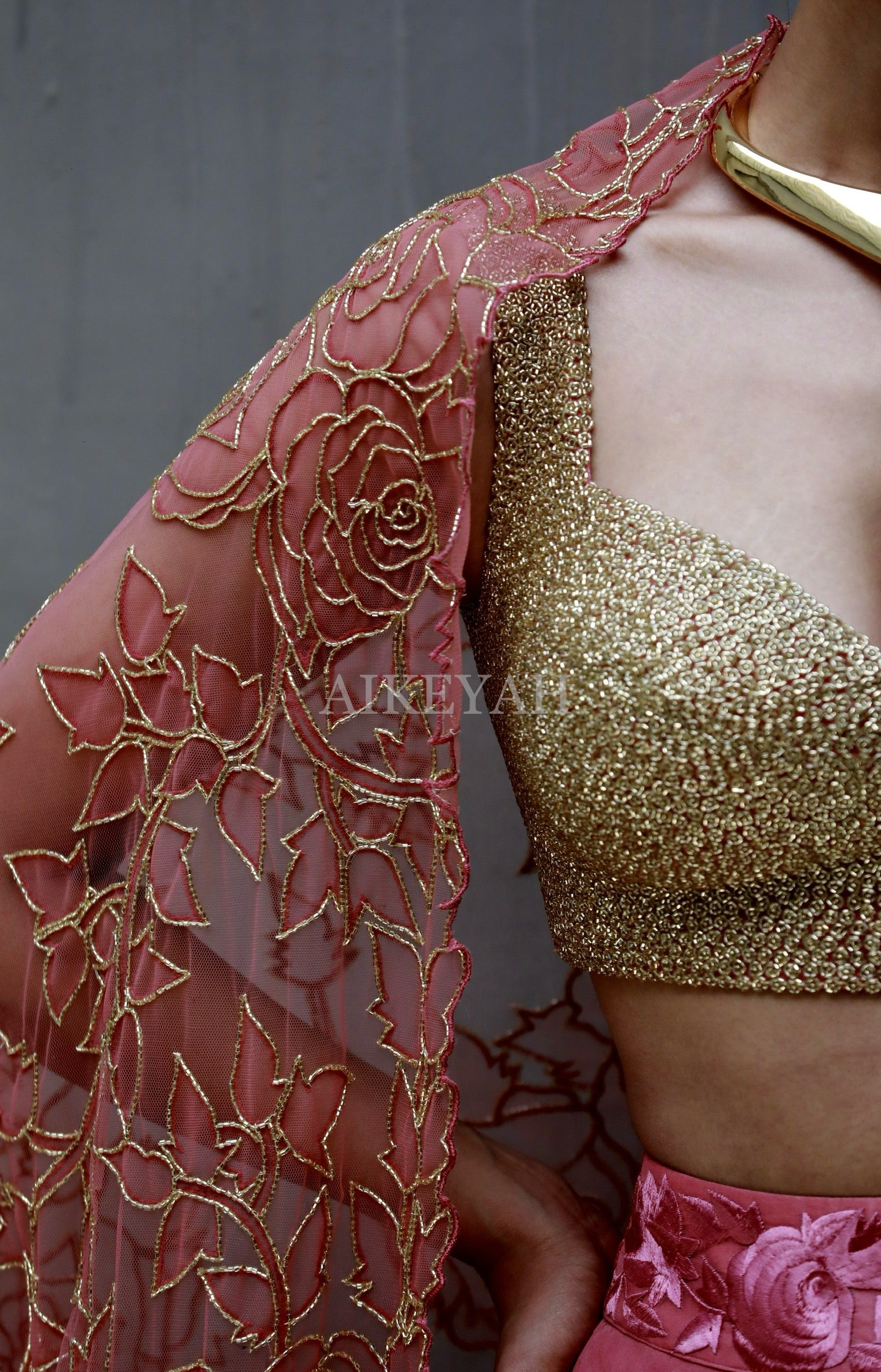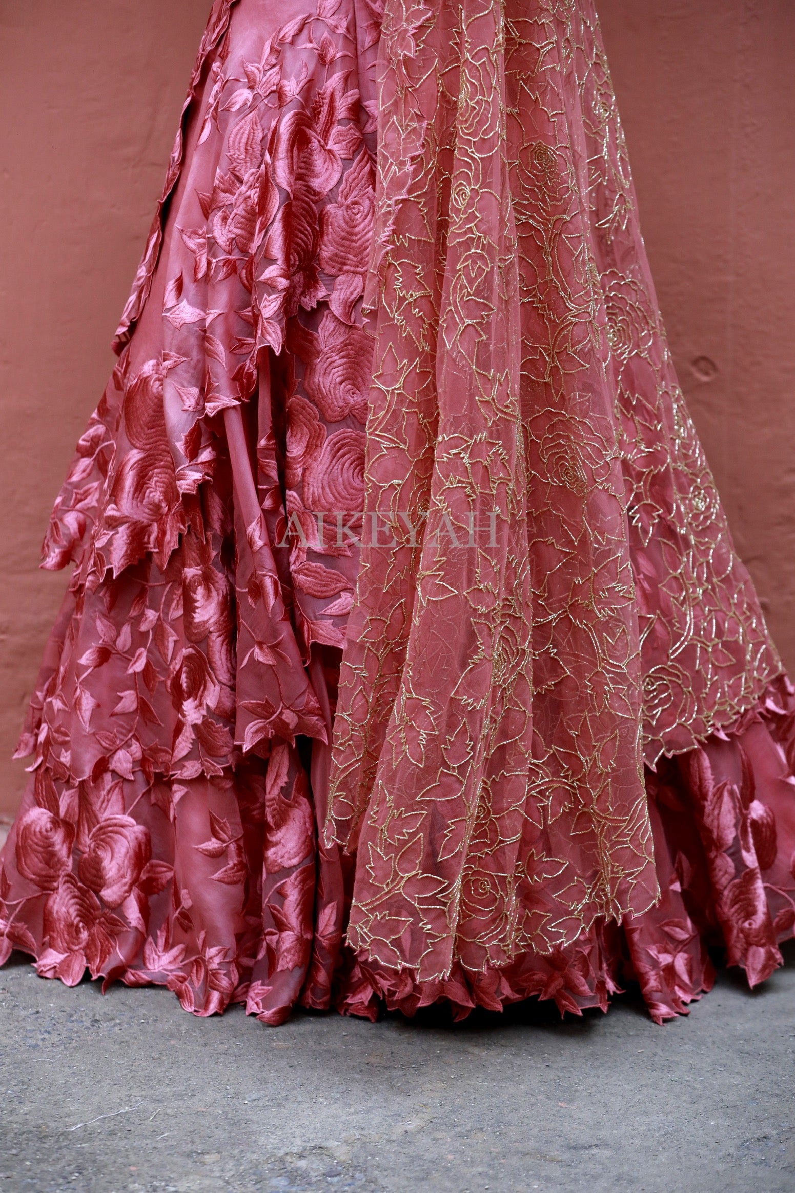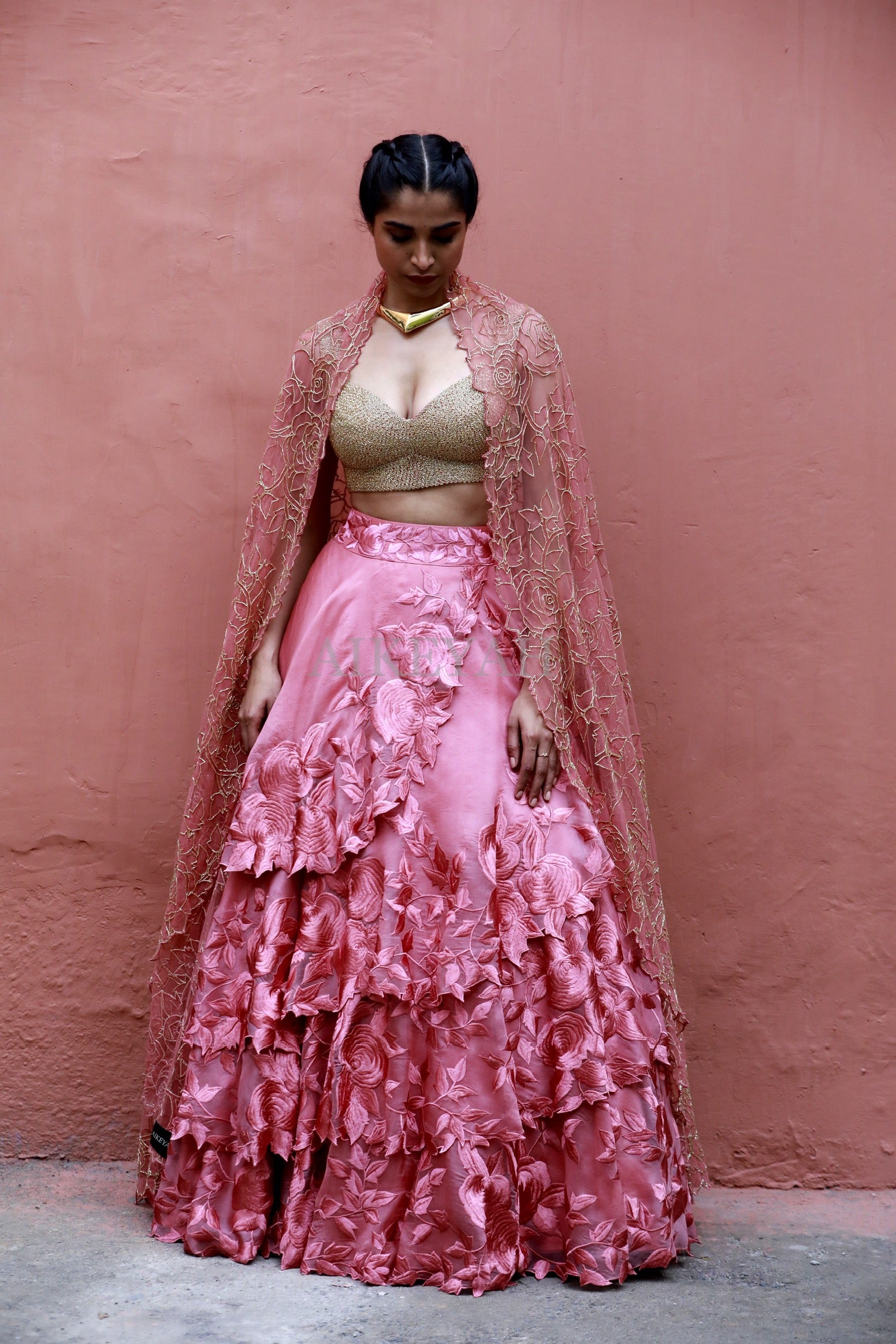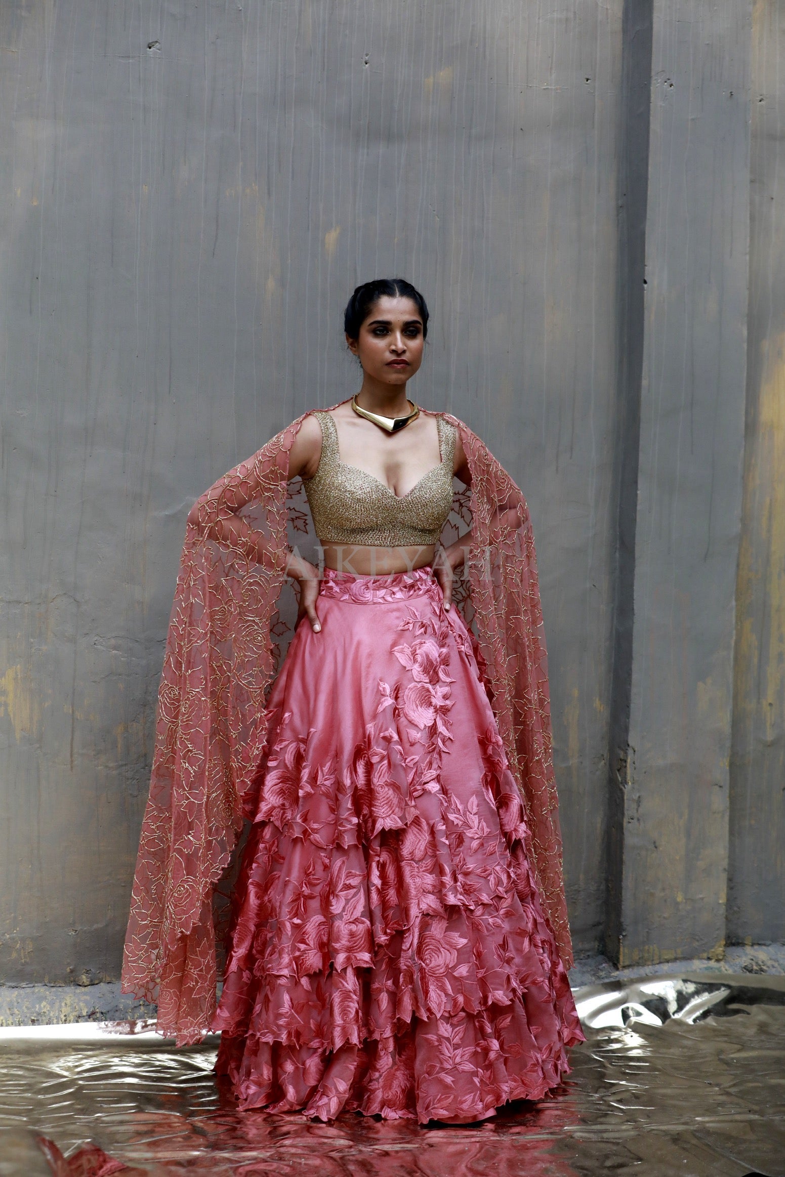 A tiered tulle embroidered lehenga worn with a glass beads embroidered bralette and an organza embroidered dupatta all in hues of peachy pink.