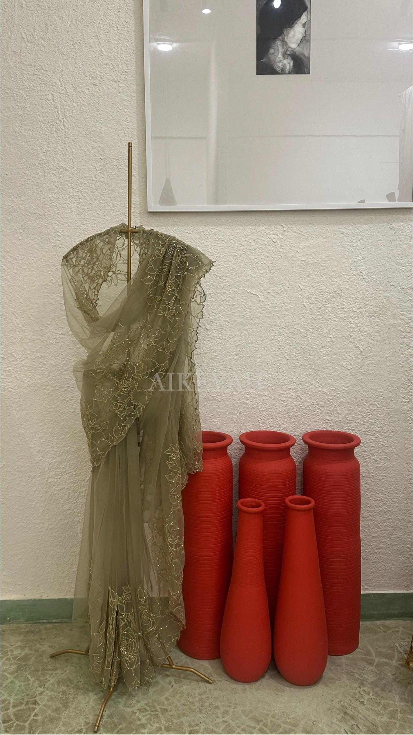 A tulle appliqué sari highlighted with tonal glass beads in hint blue color, in signature roses.