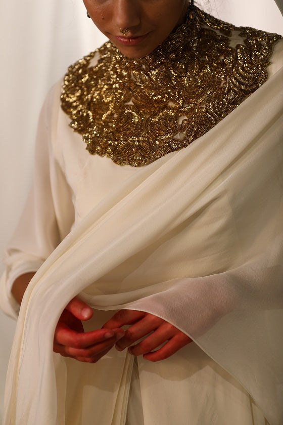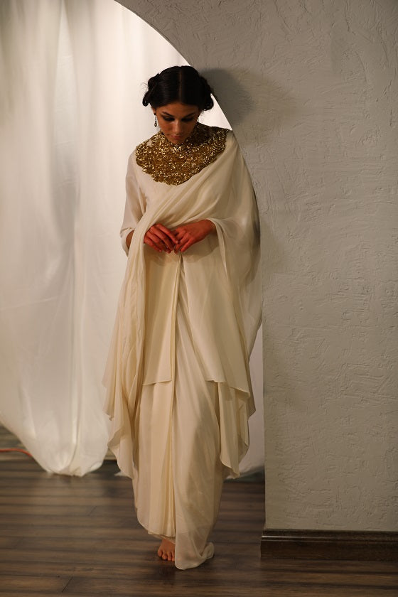 A Crepe and Chiffon pre-draped sari inspired dress worn with a hand embroidered Signature detachable collar in gold floral motif.