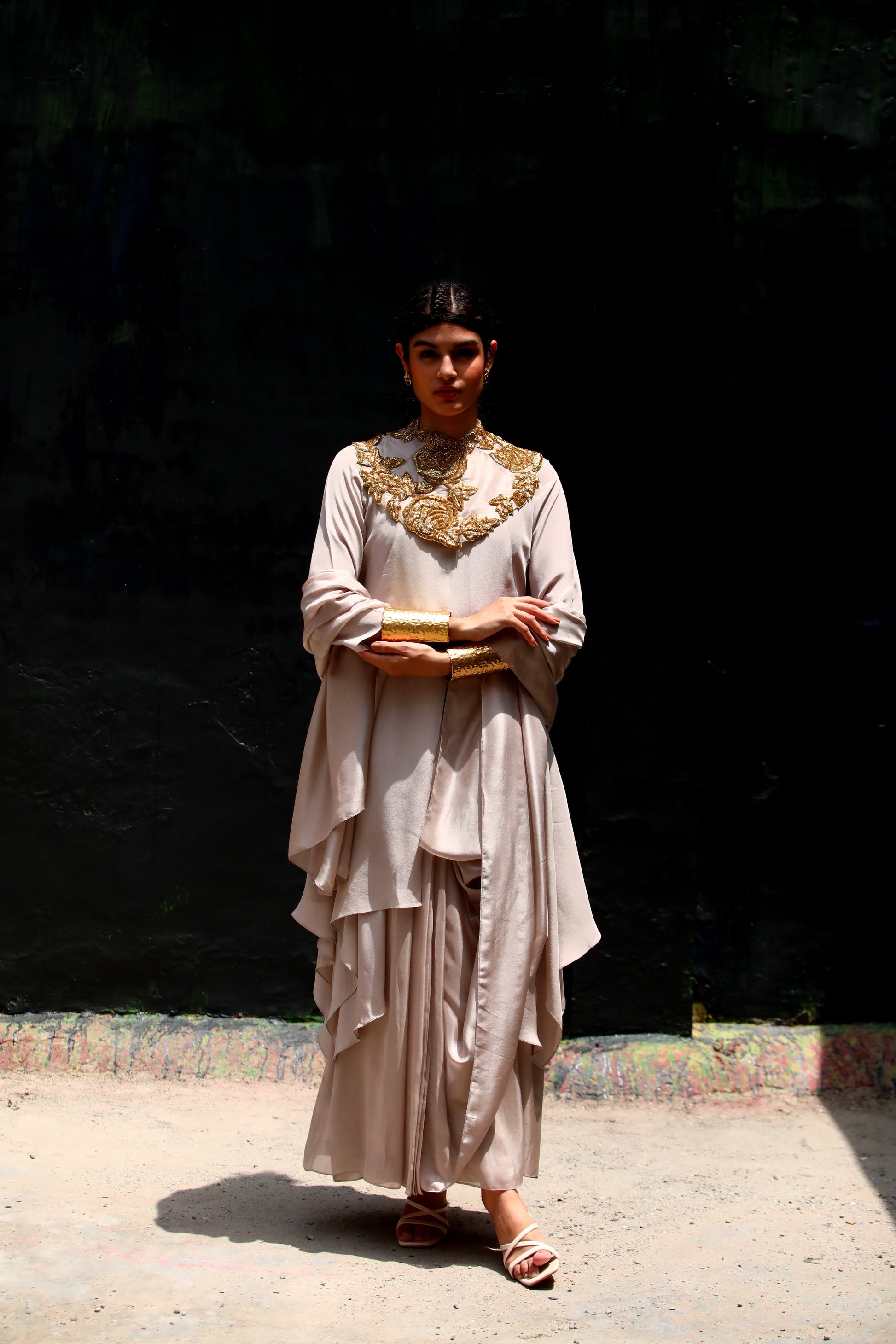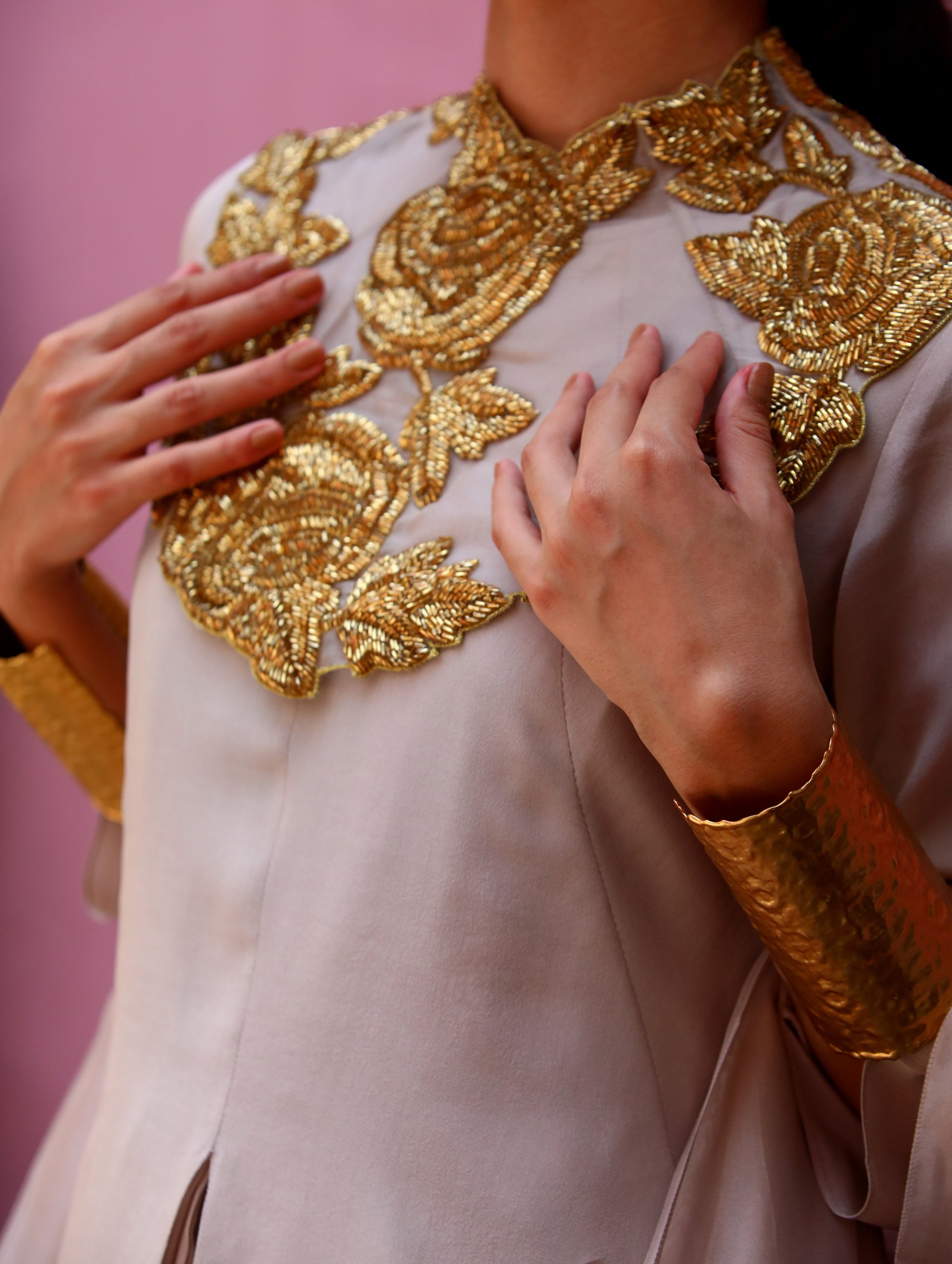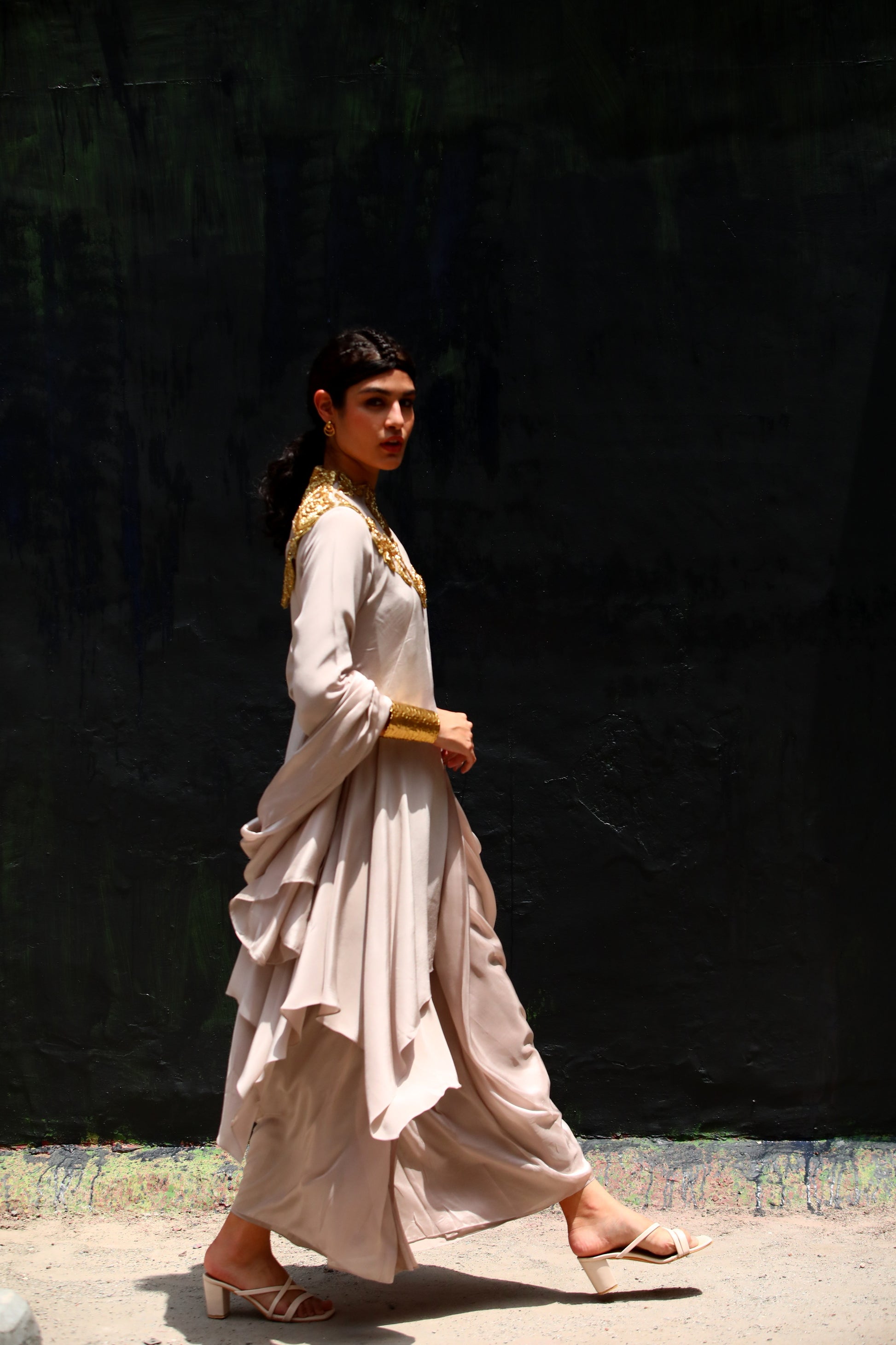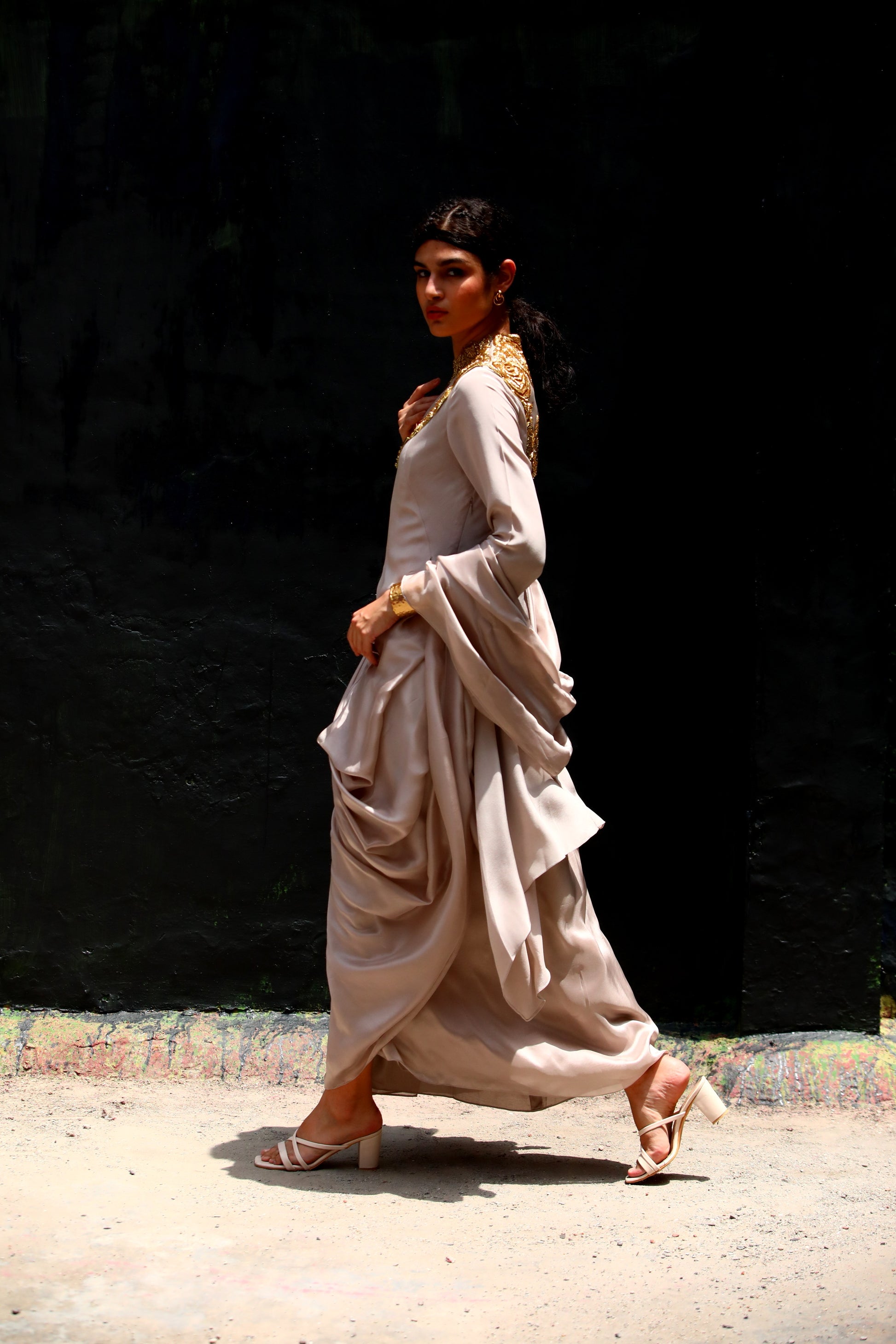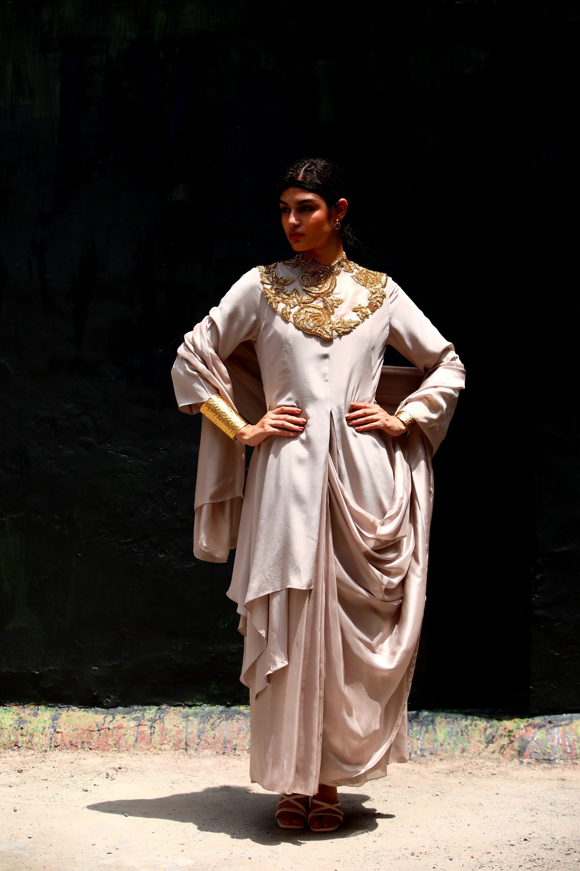 A Crepe and Chiffon pre-draped sari inspired dress worn with a hand embroidered Signature detachable collar in gold floral motif.