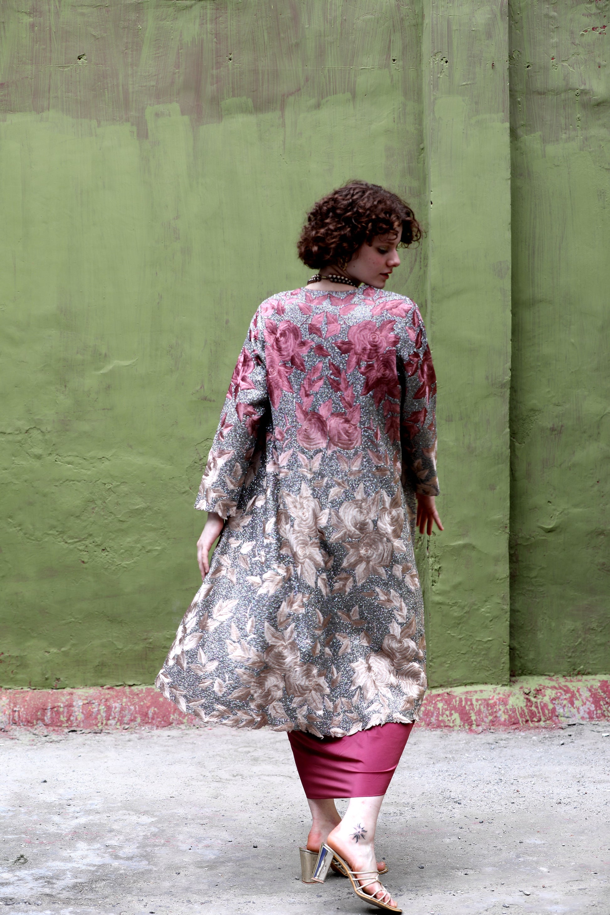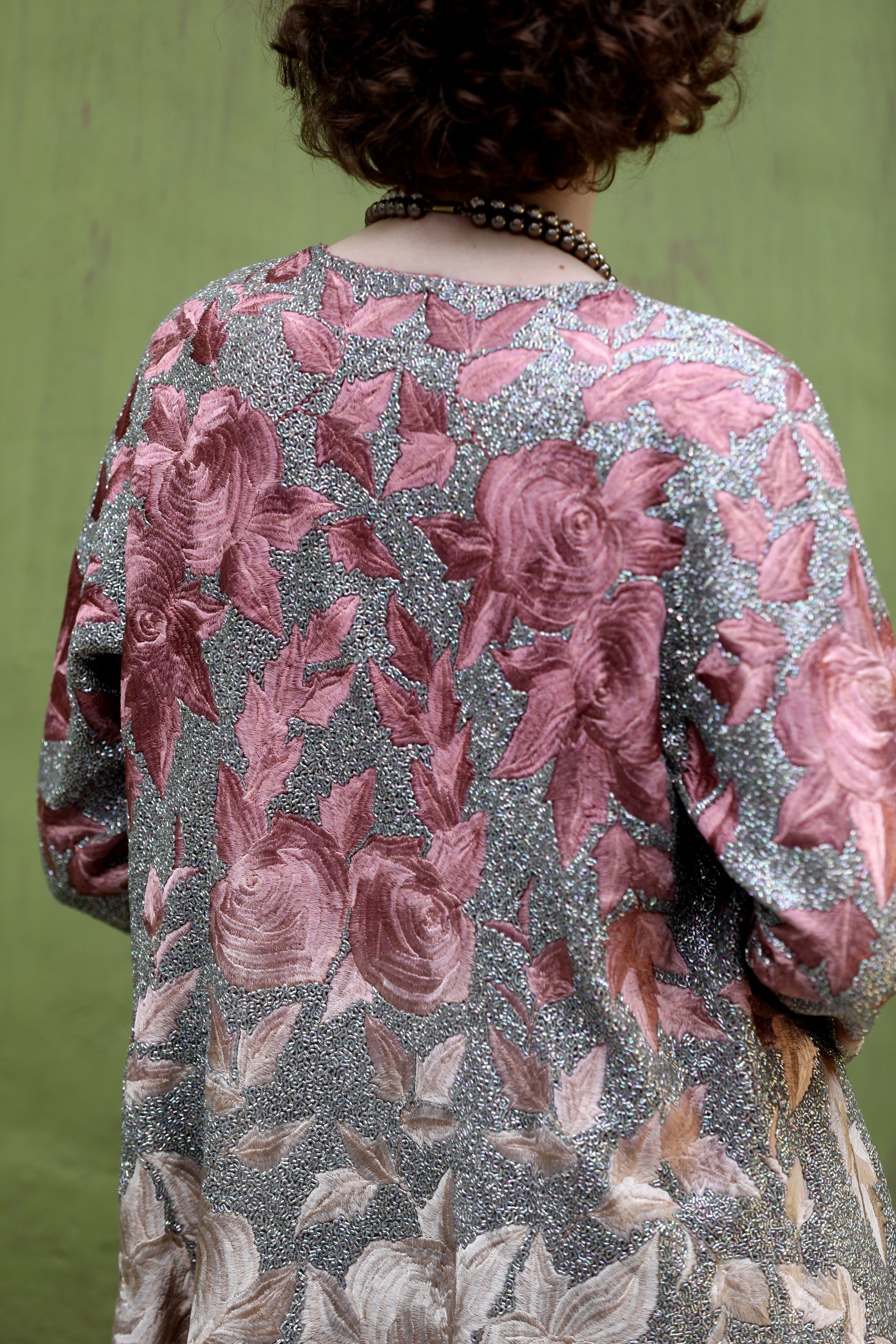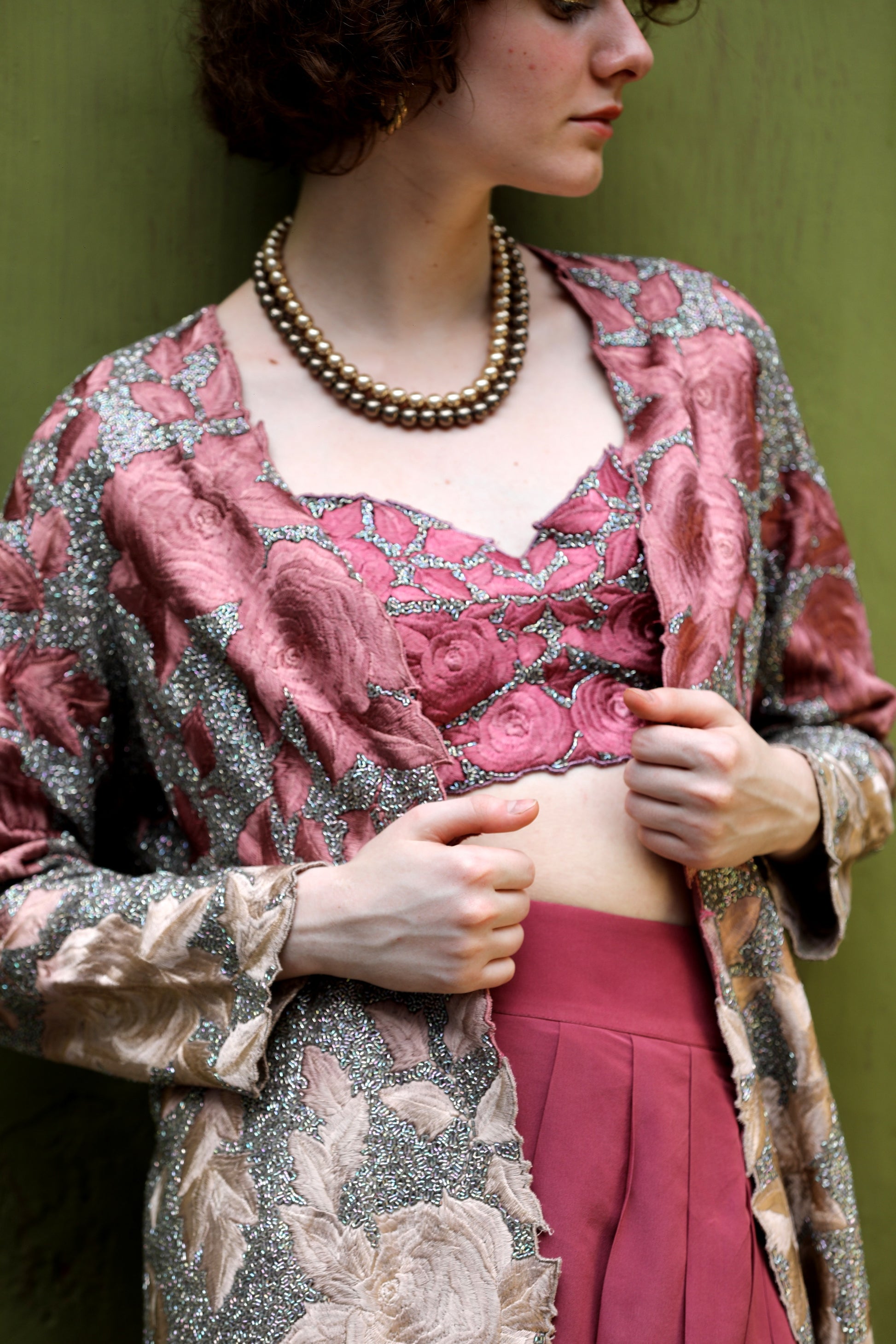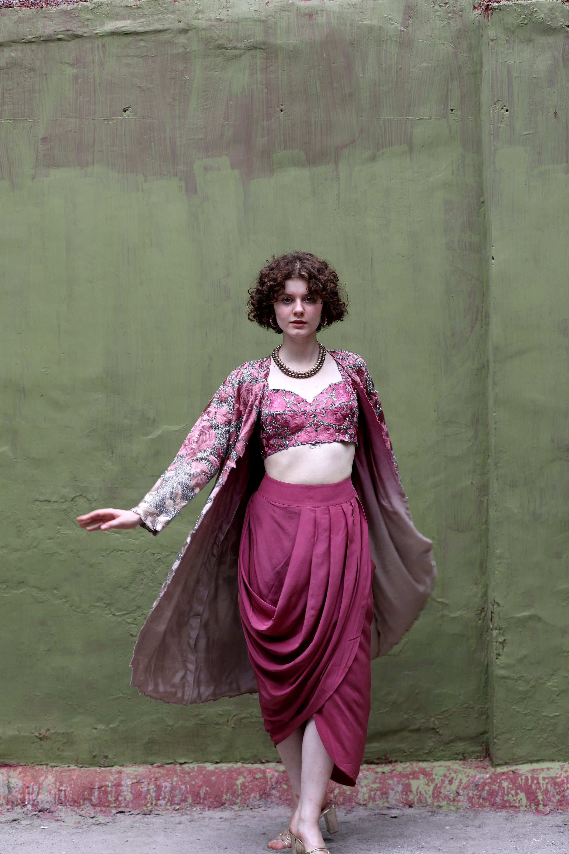 A Bermuda onion ombre embroidered jacket worn with a bralette and a crepe cowl skirt.