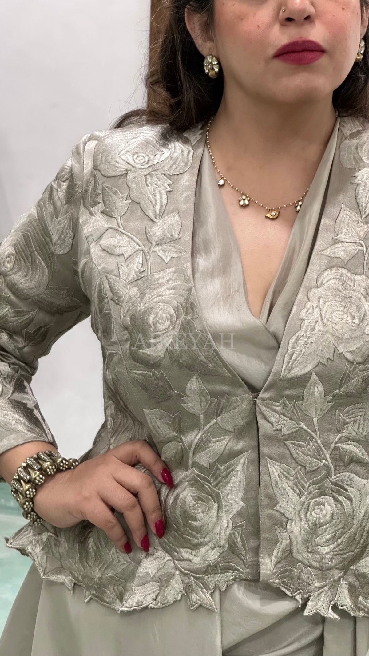 A Signature embroidered layover worn with an organza asymmetric top and a crepe skirt.