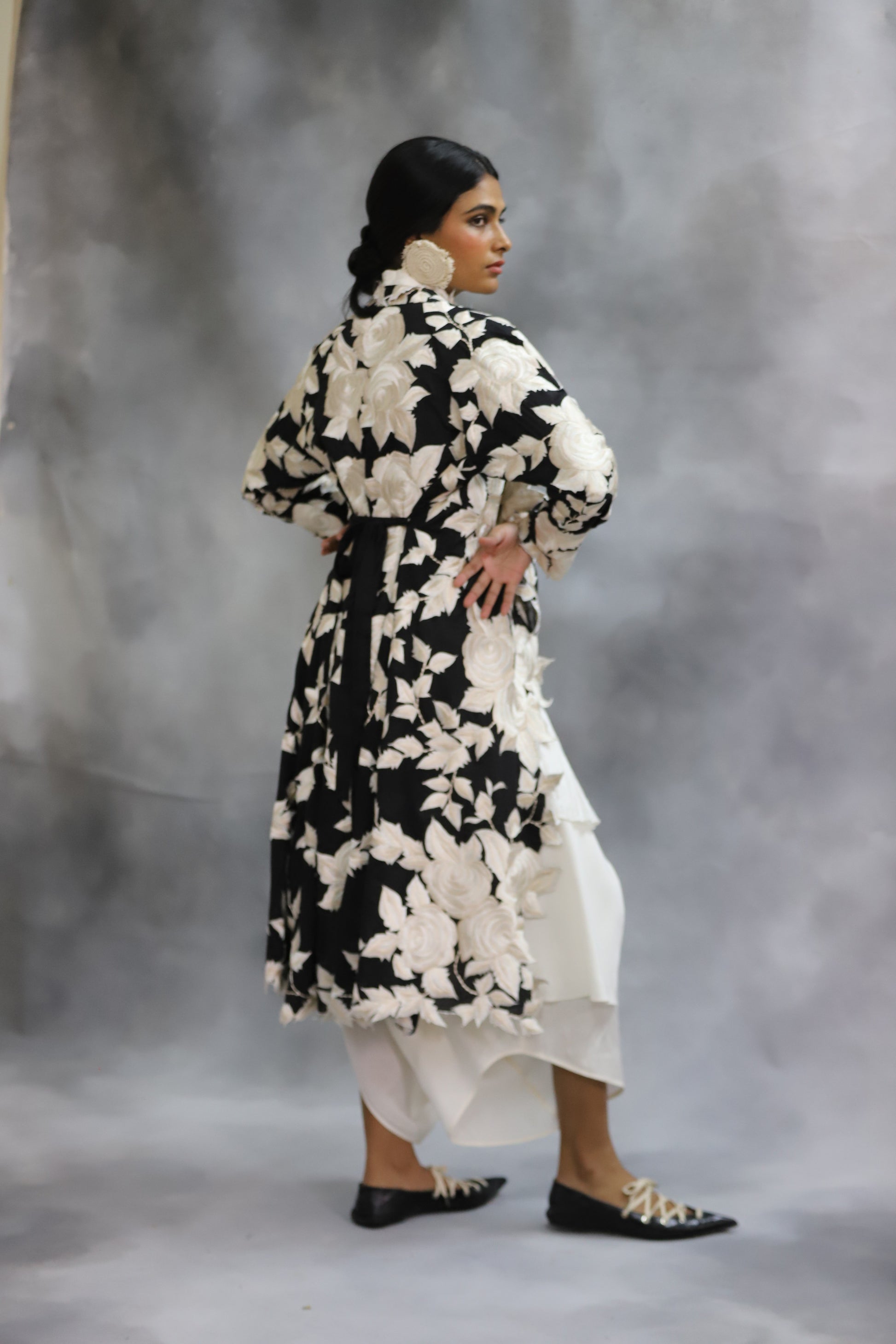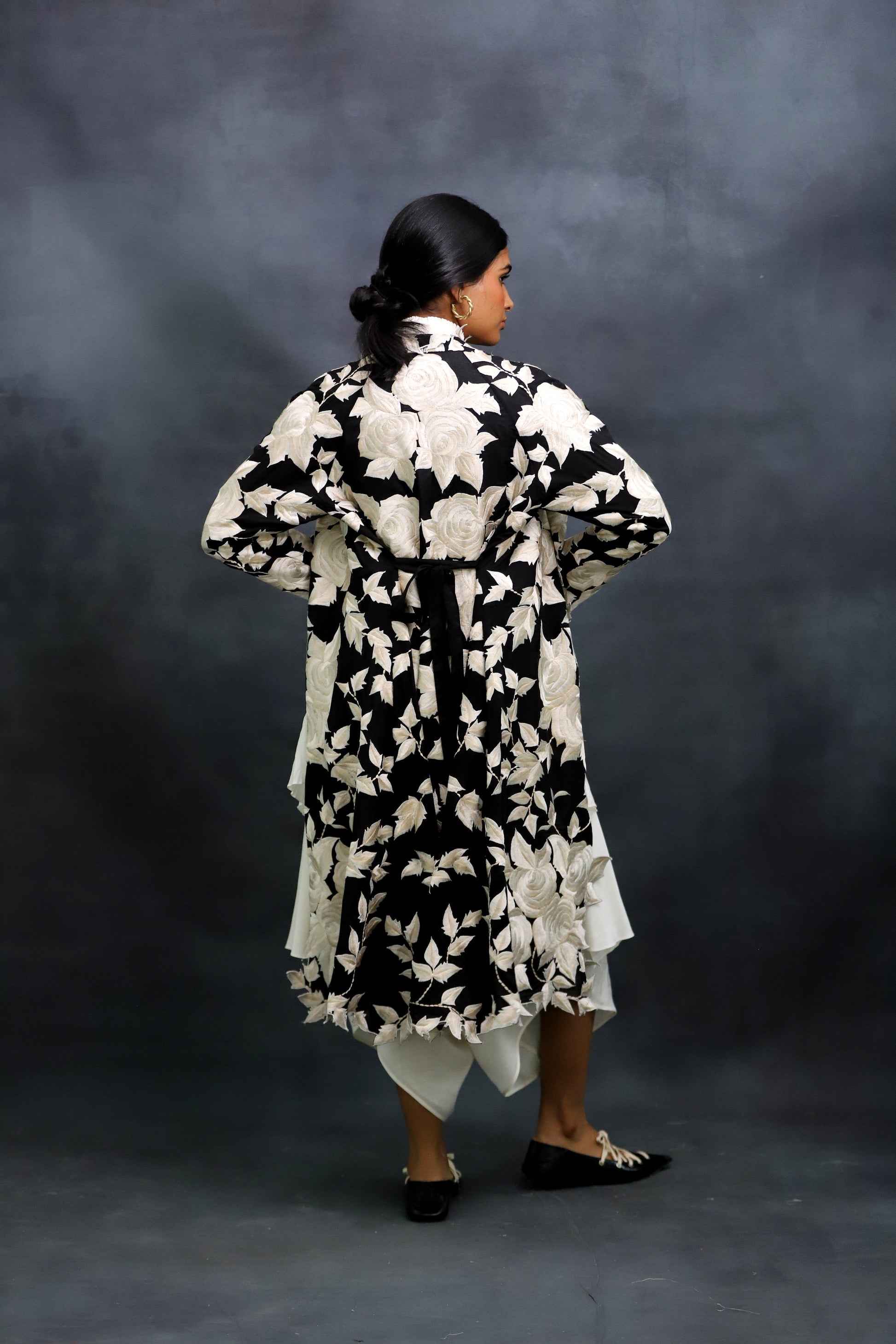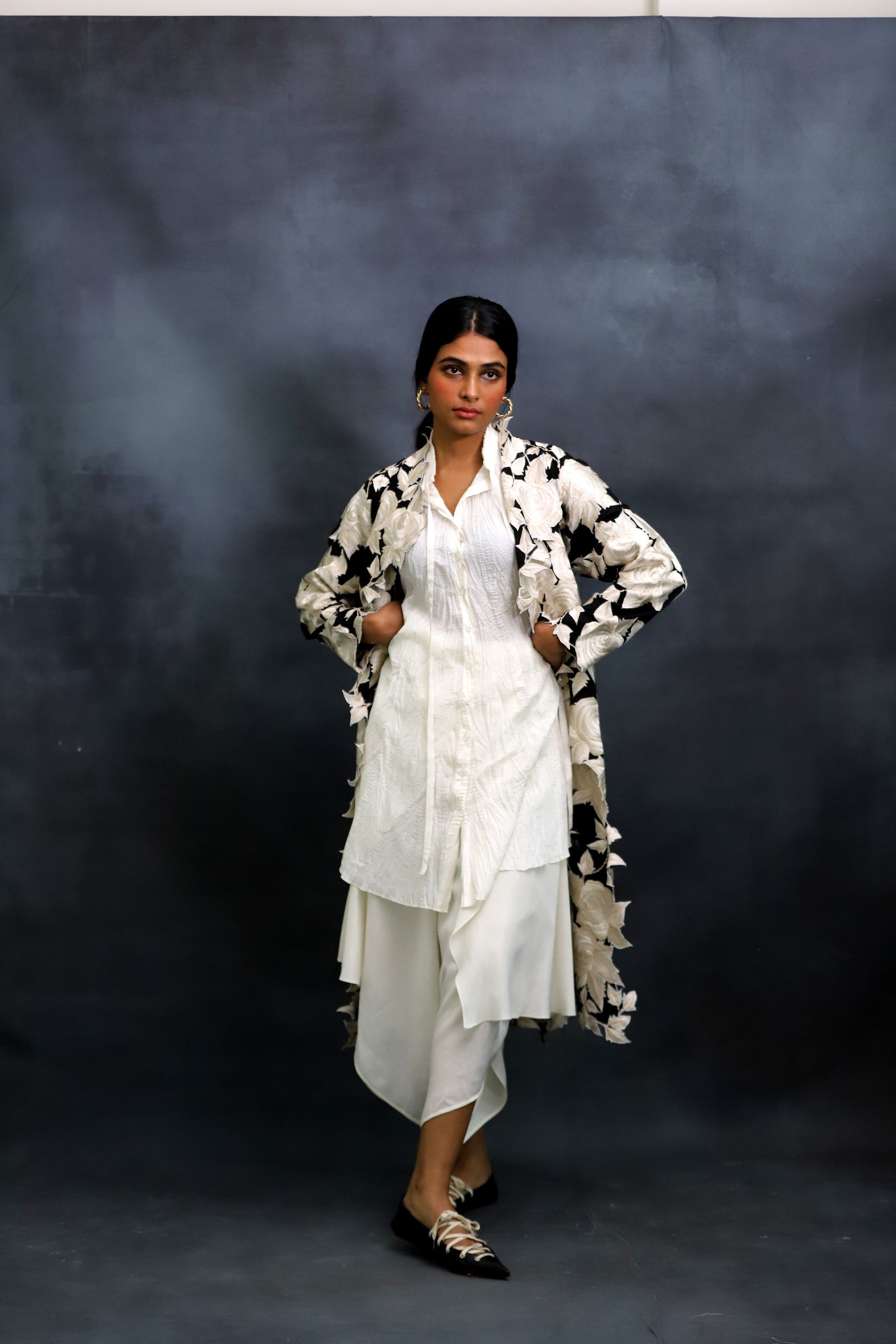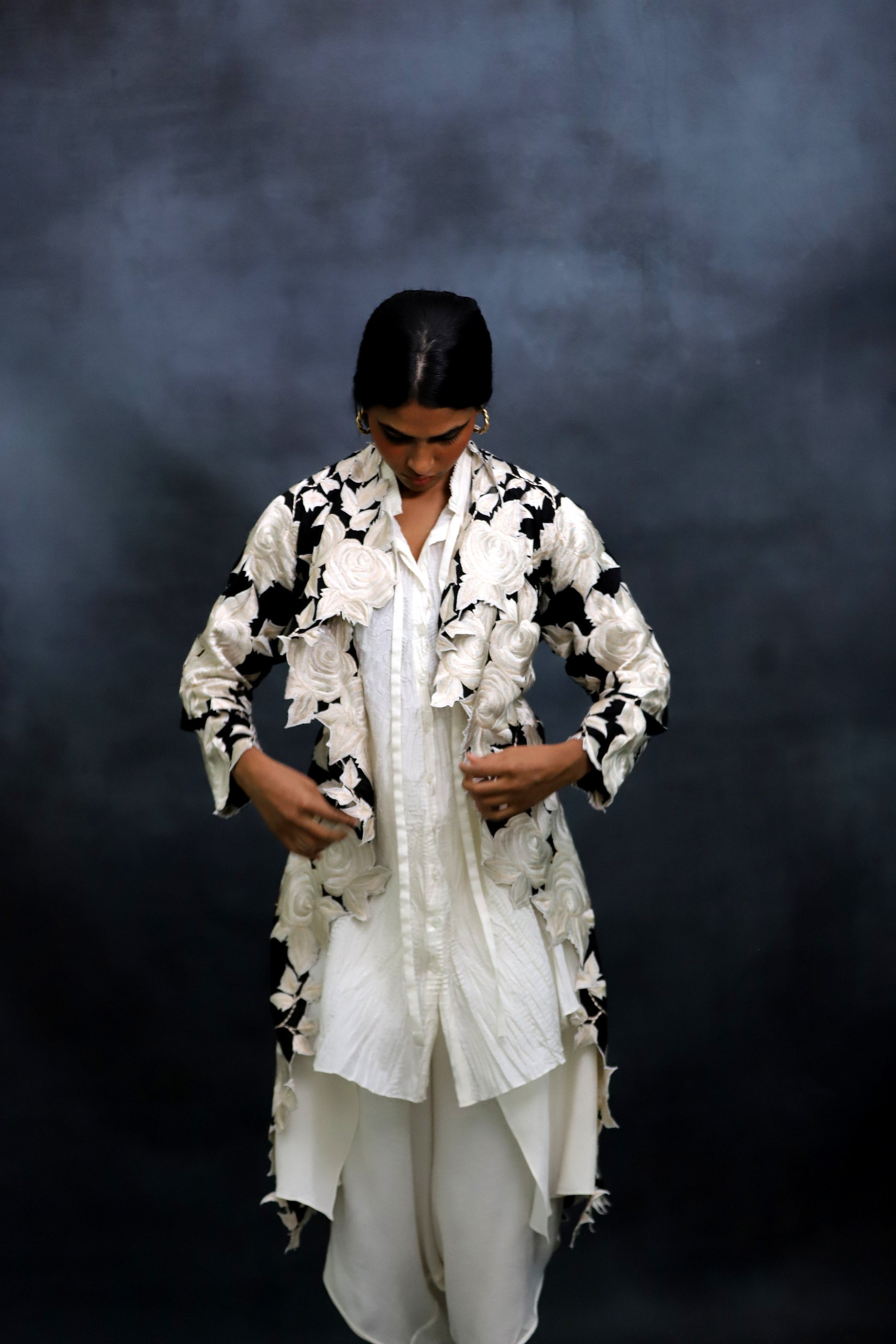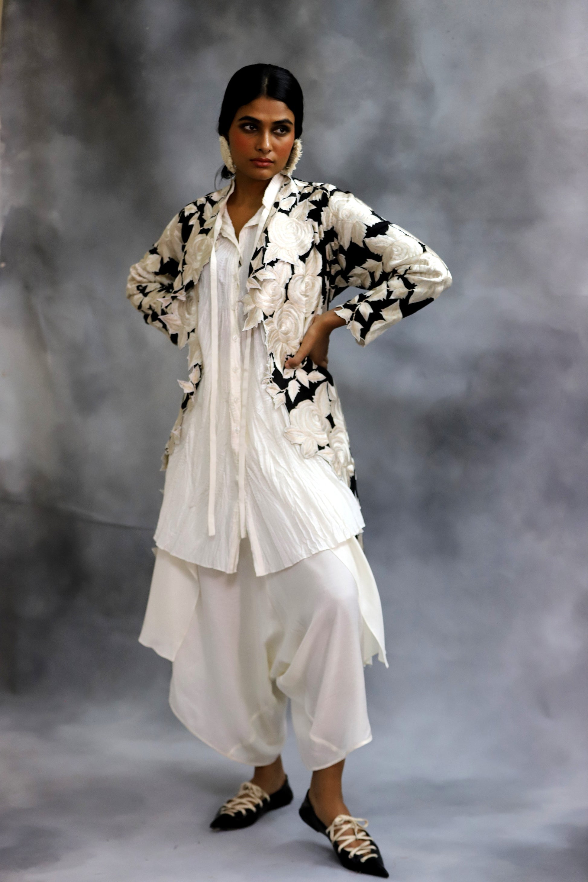 Offwhite Crushed habutai silk shirt worn with low crotch pants in shantoon styled with aikeyah's signature floral thread embroidered overlay in Black modal.