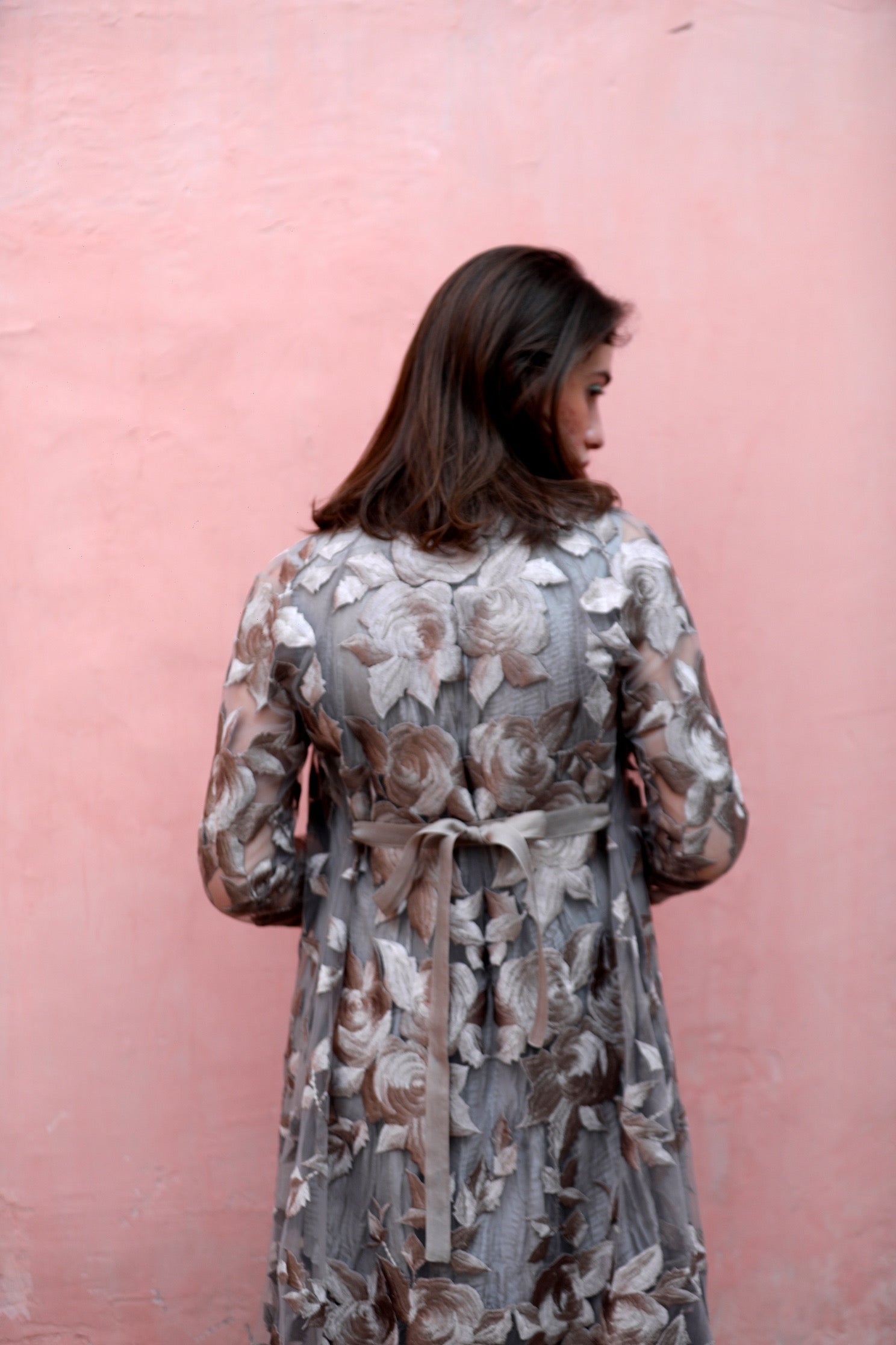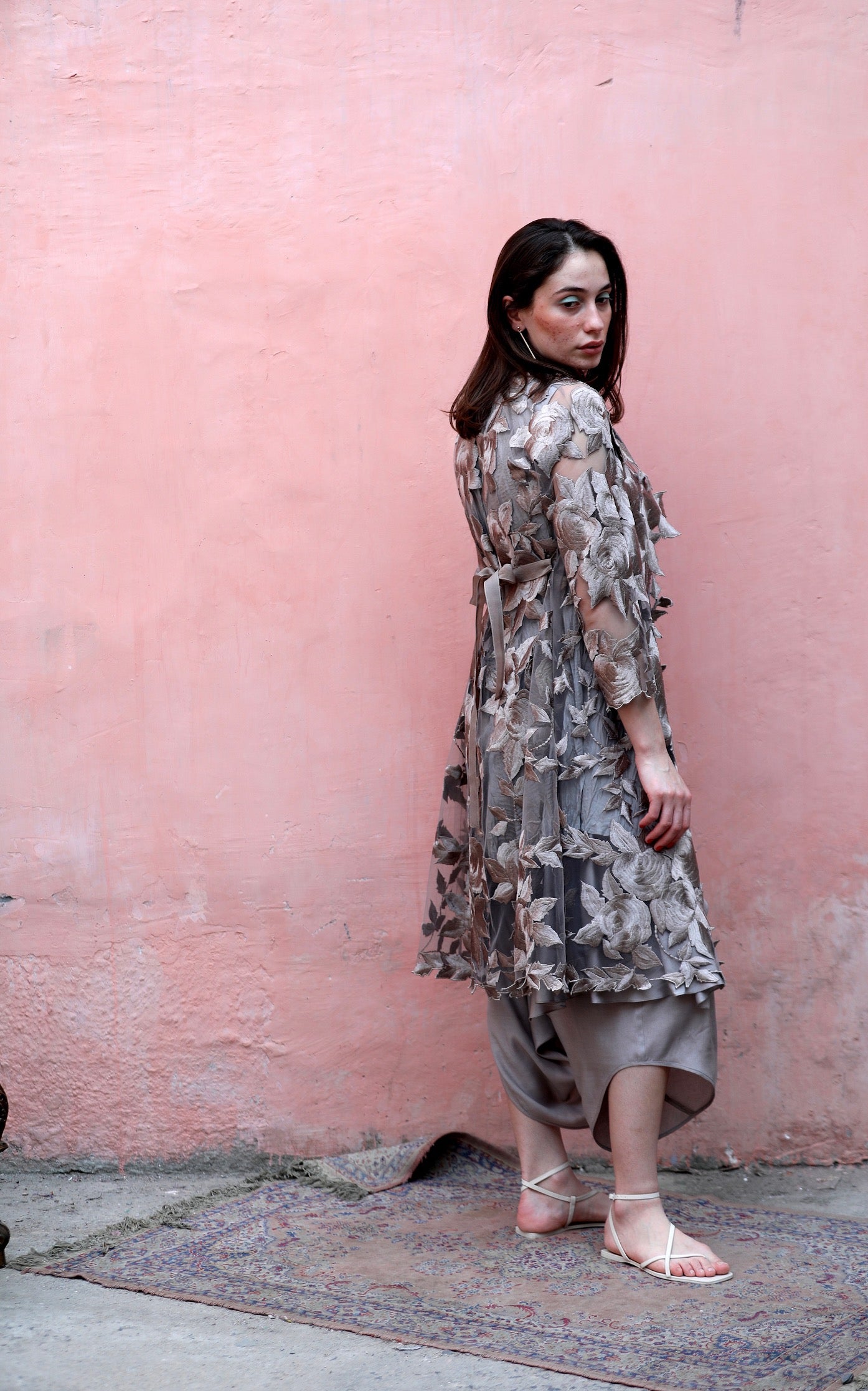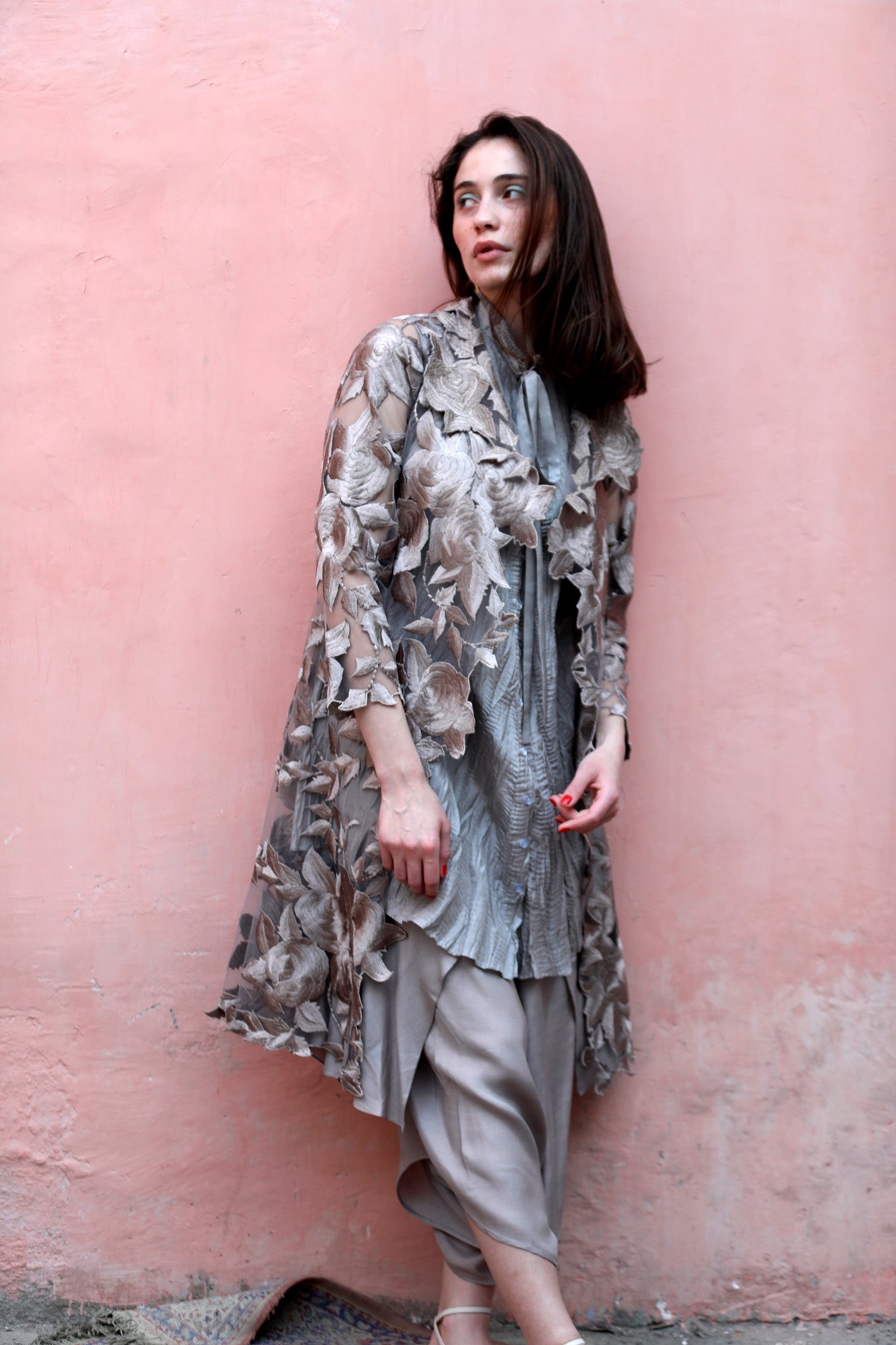 Crushed habutai silk shirt worn with low crotch pants in shantoon styled with aikeyah's signature floral thread embroidered overlay in tulle.
