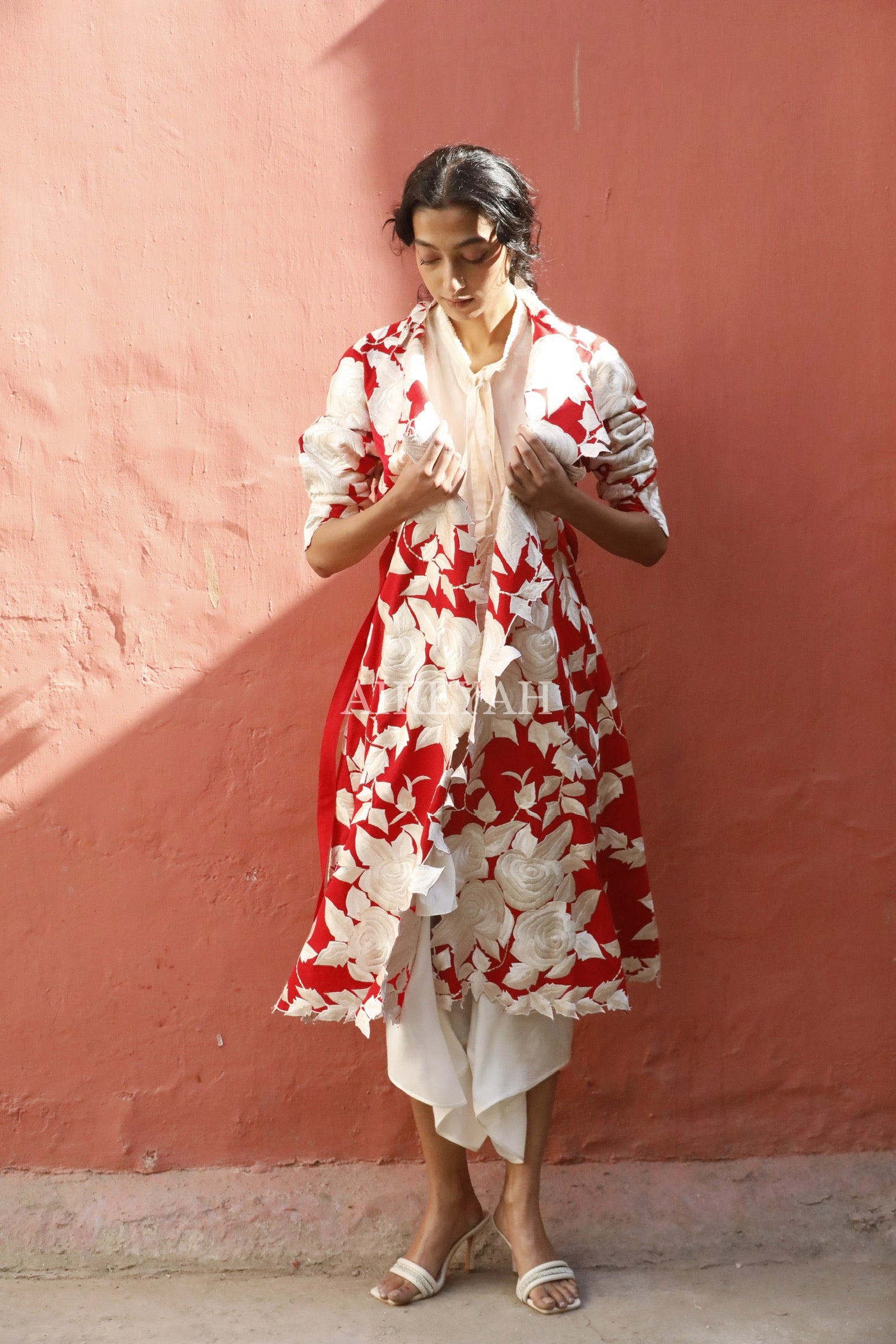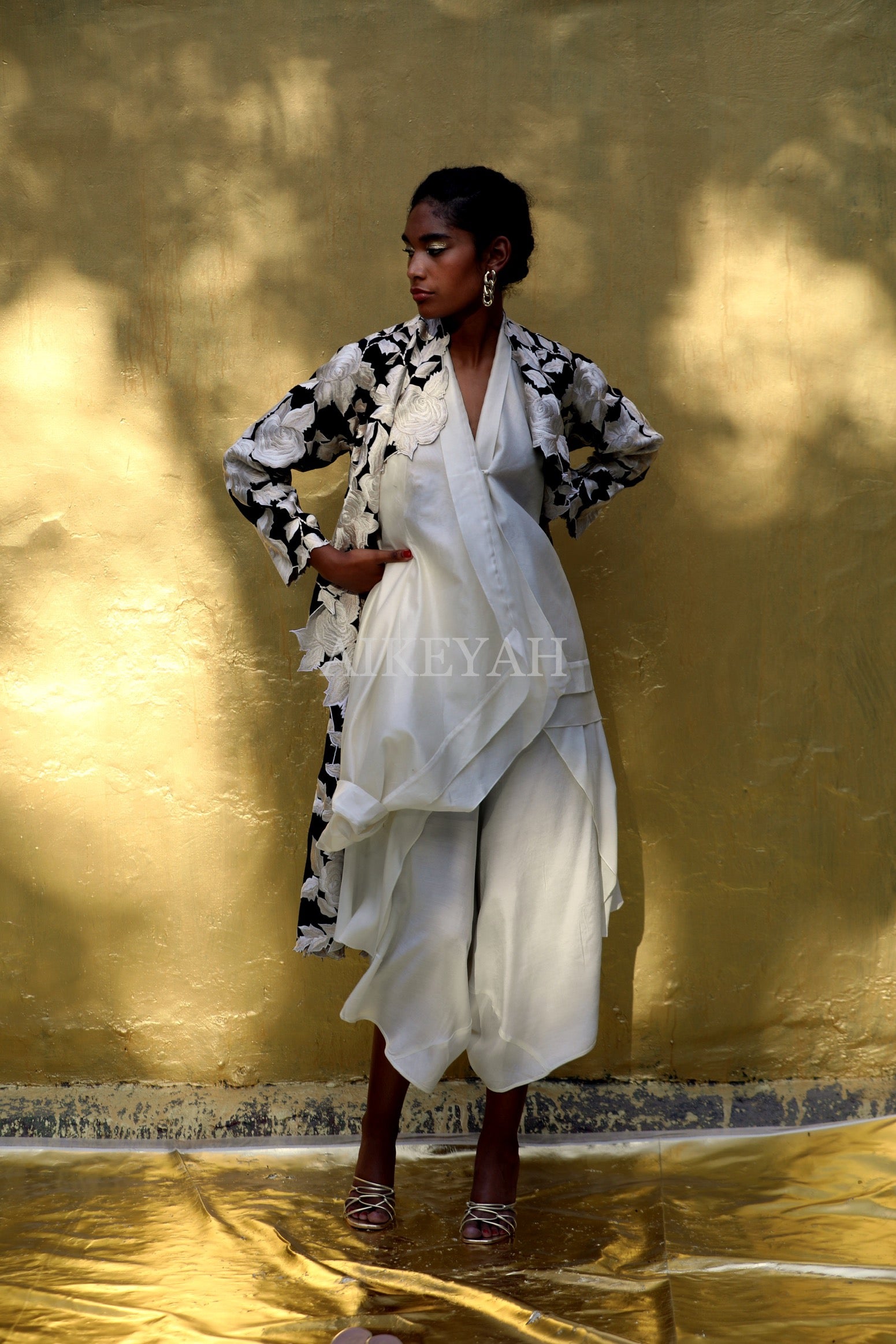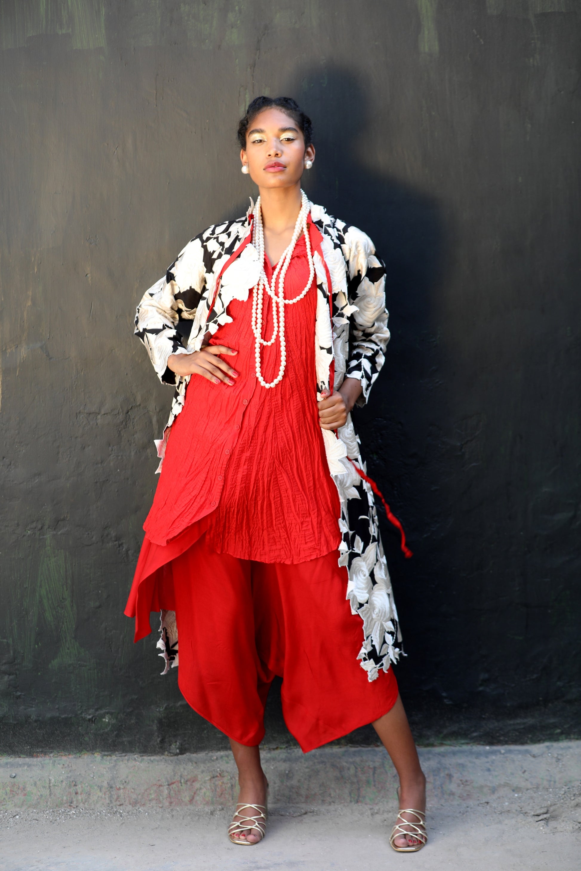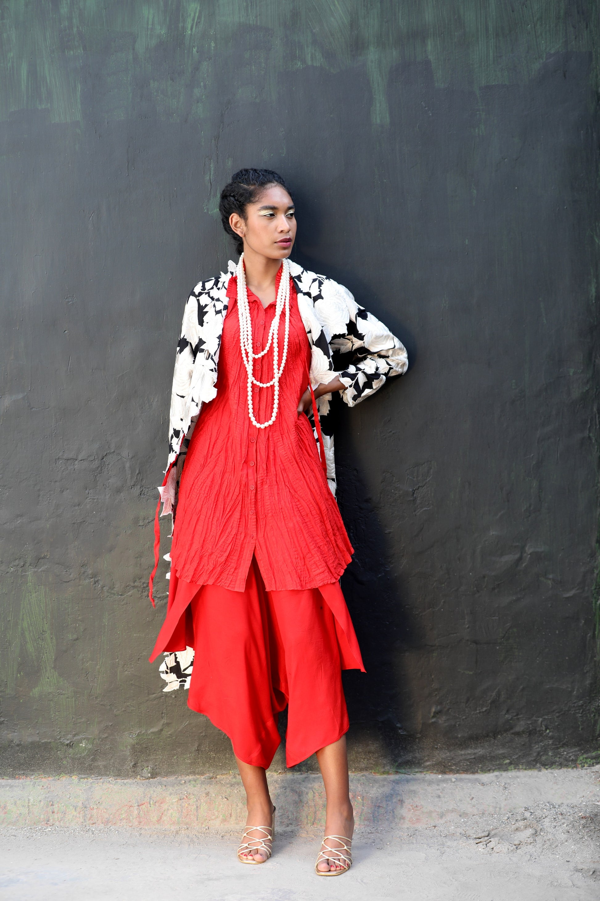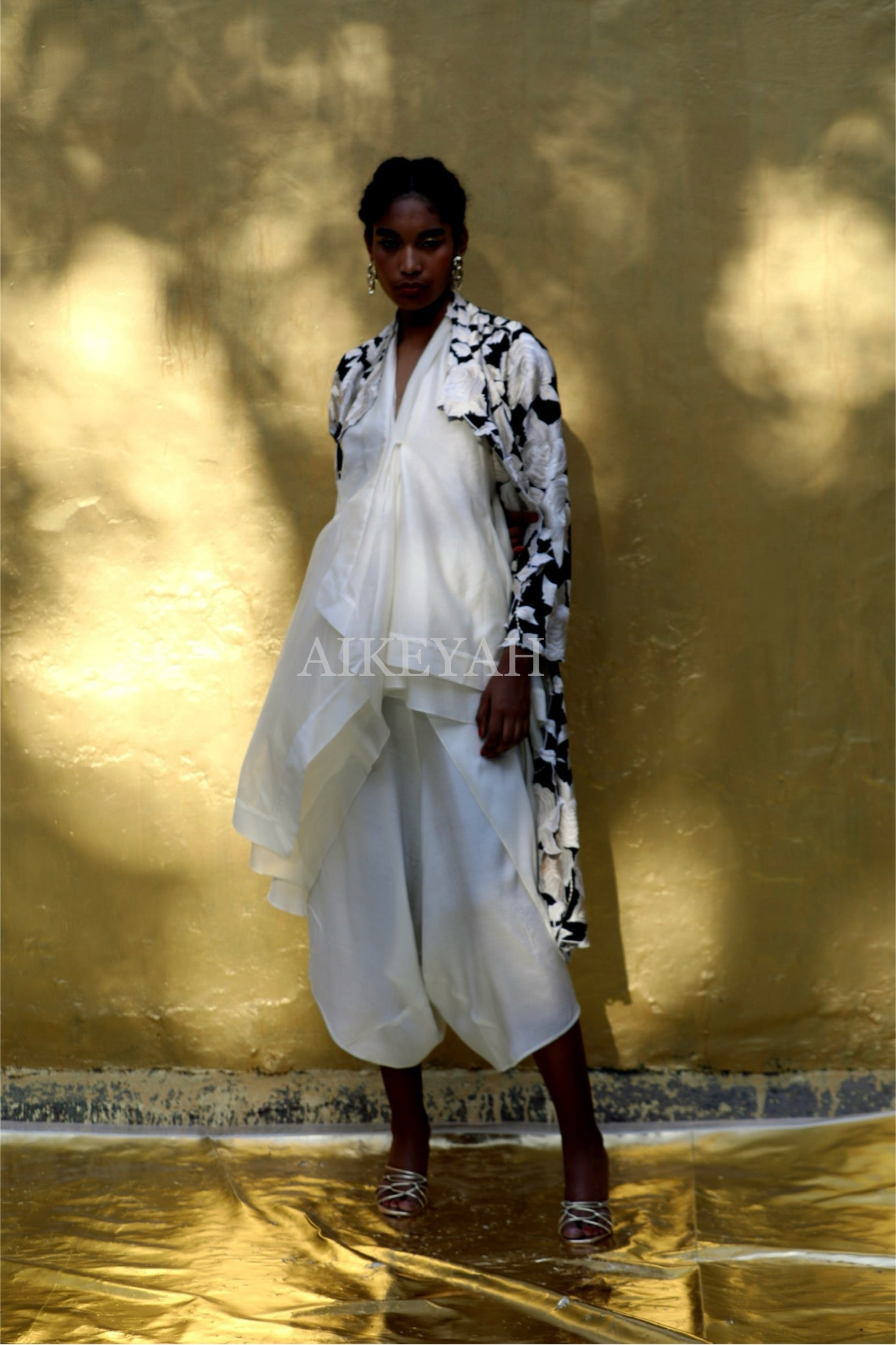 An ivory chanderi assymetric top worn with low crotch pants in shantung styled with aikeyah's signature floral thread embroidered overlay in Black and offwhite. Also comes with an option to wear with Red silk shirt and pants.