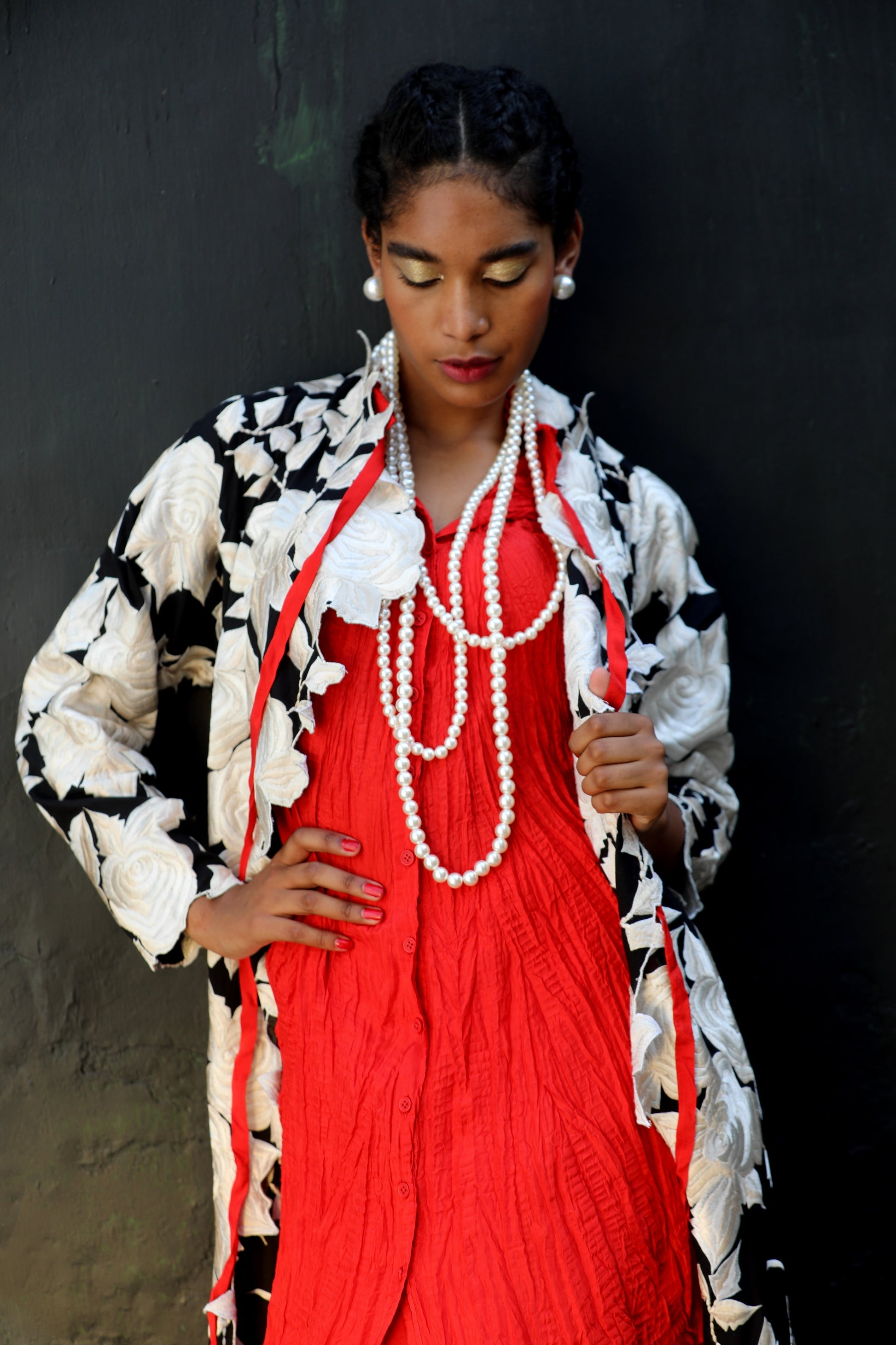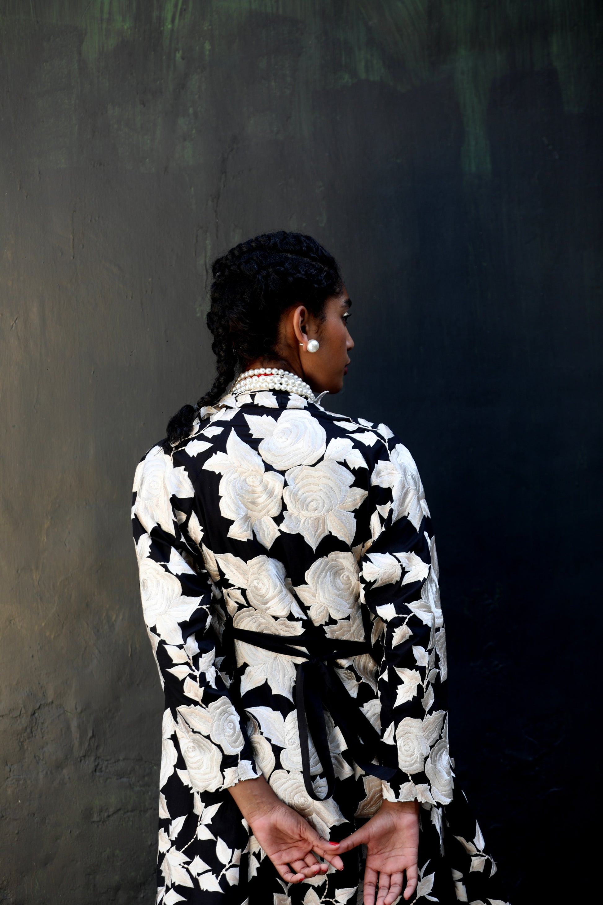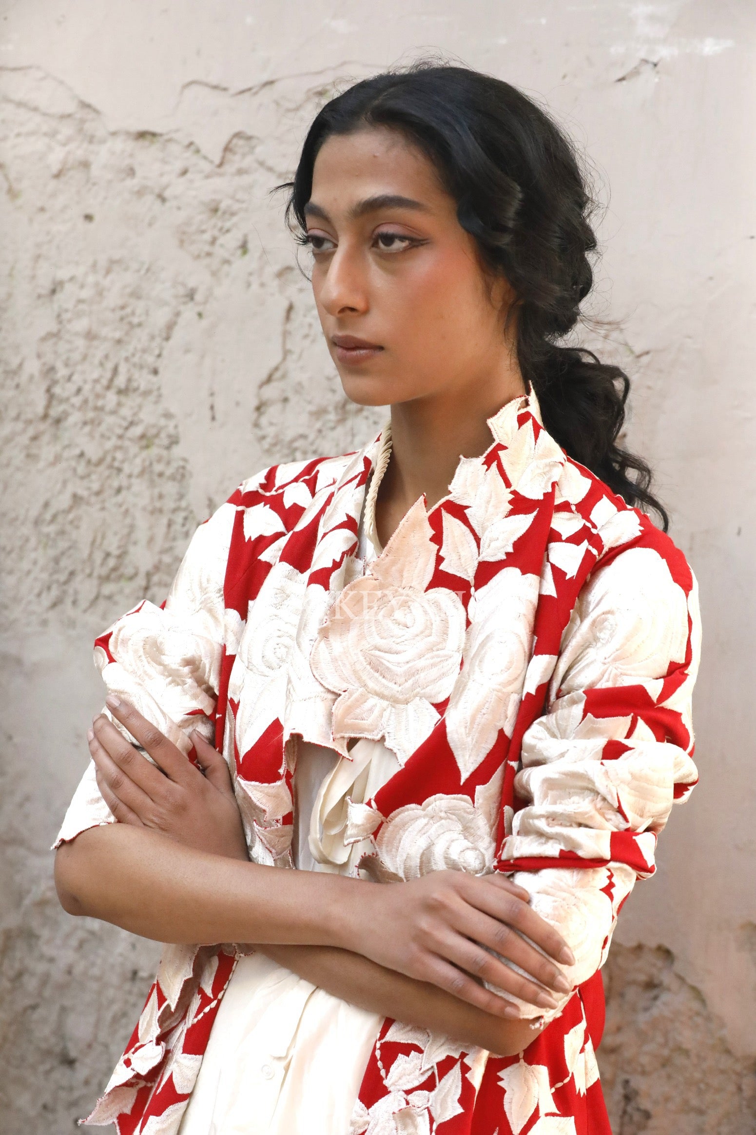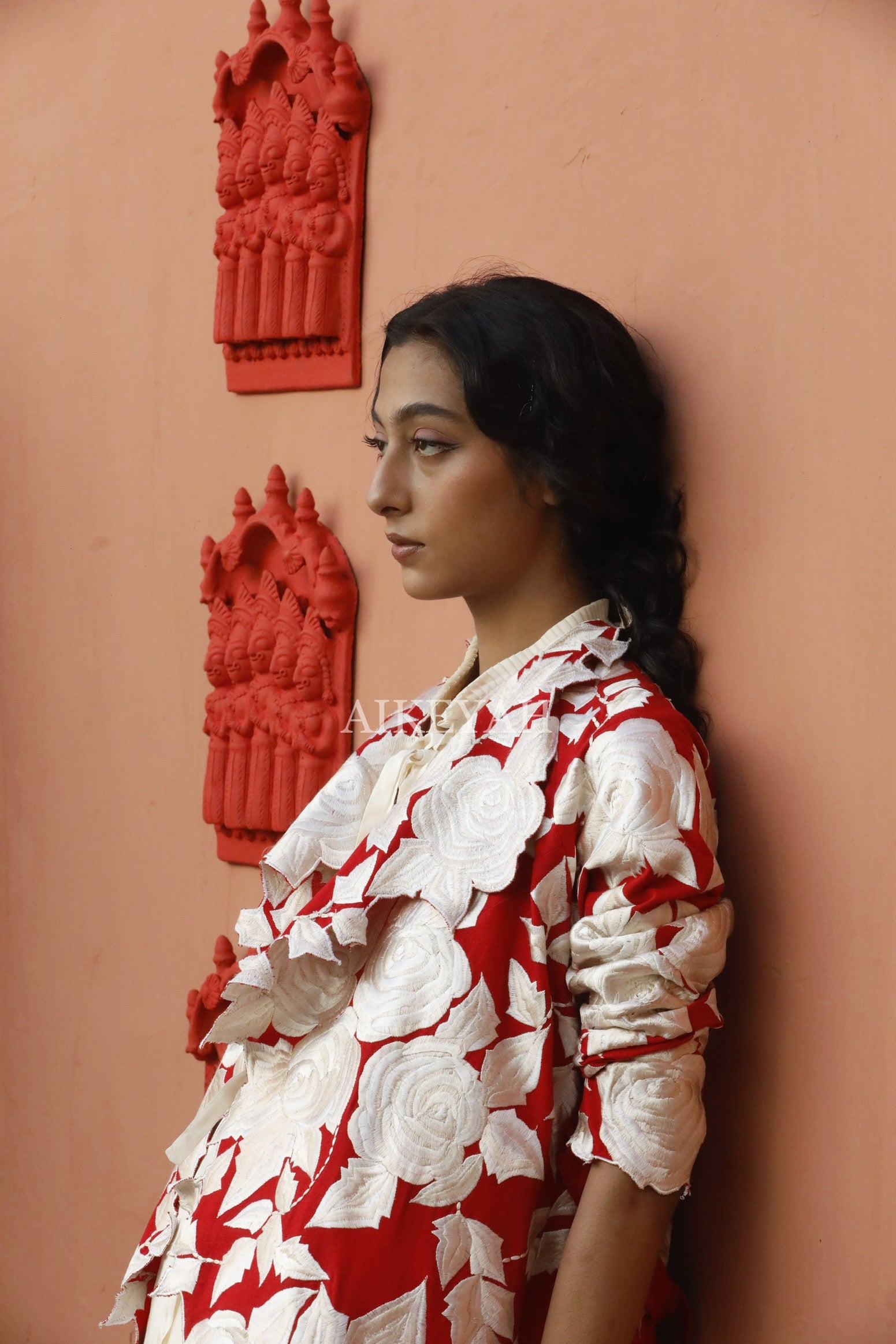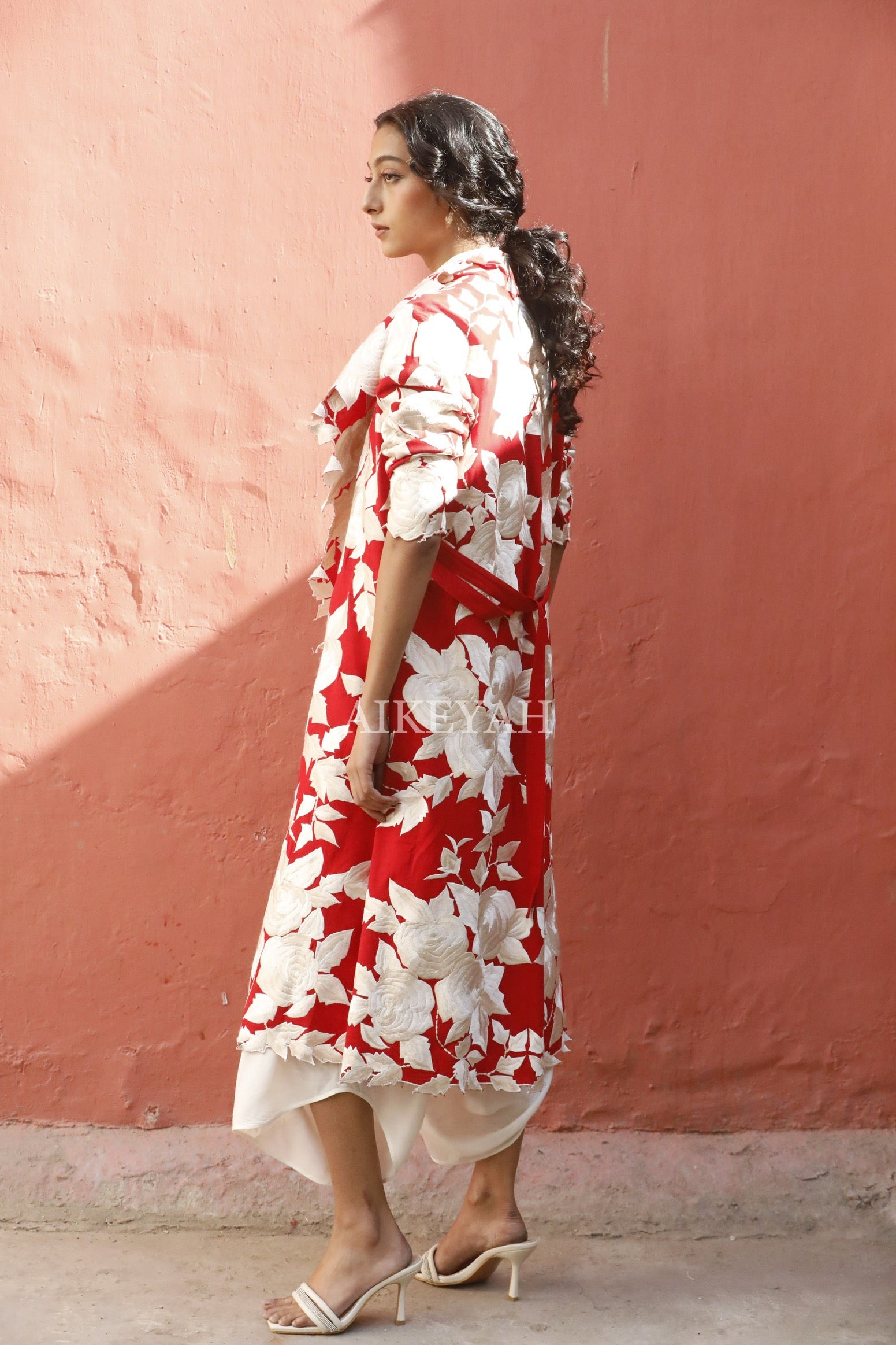 An ivory chanderi assymetric top worn with low crotch pants in shantung styled with aikeyah's signature floral thread embroidered overlay in Black and offwhite. Also comes with an option to wear with Red silk shirt and pants.