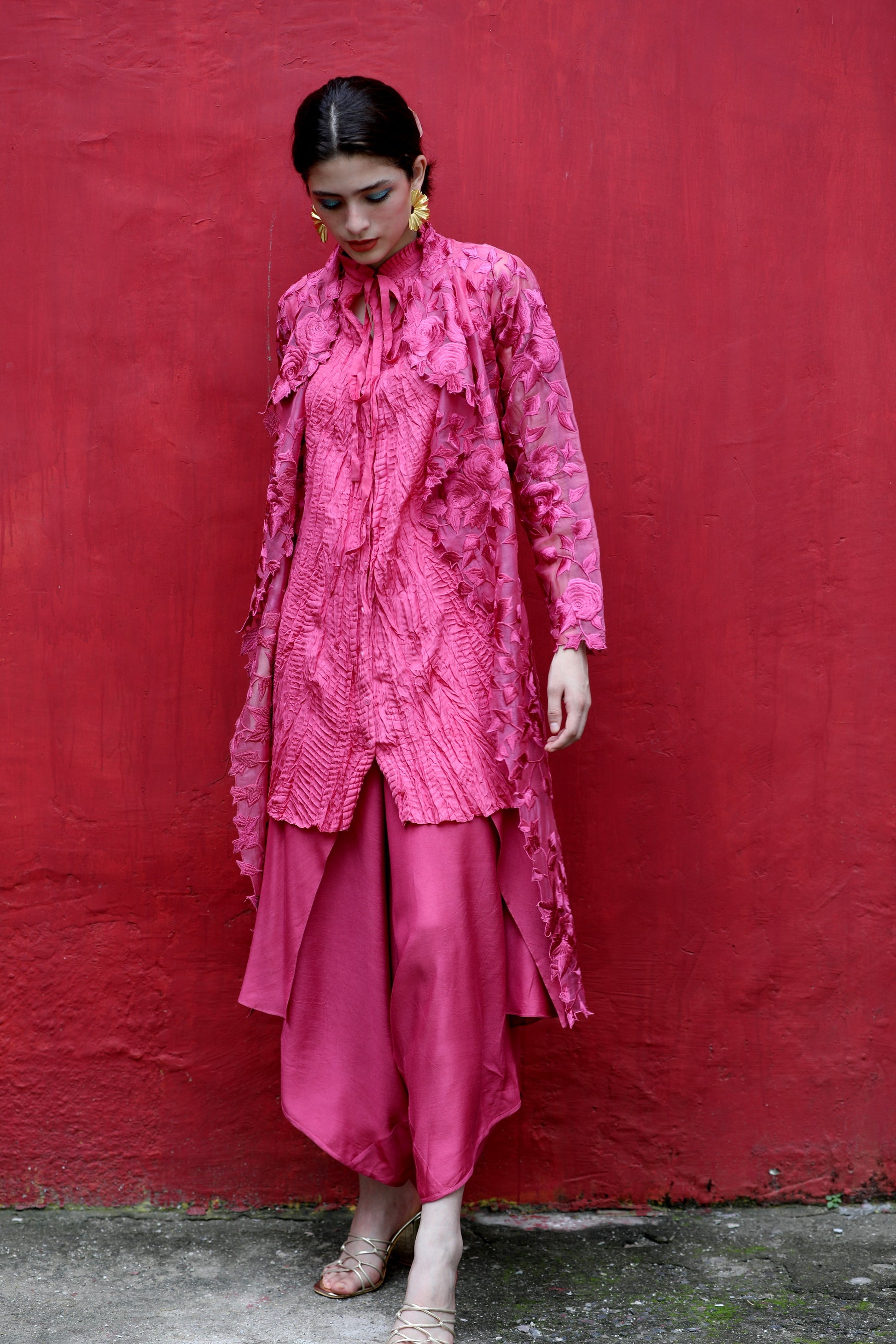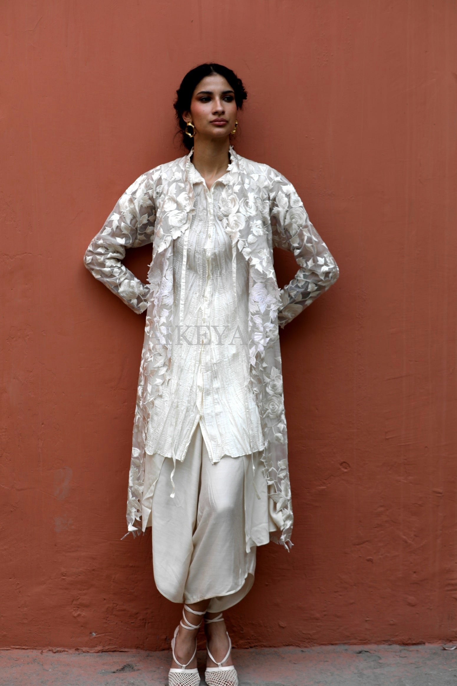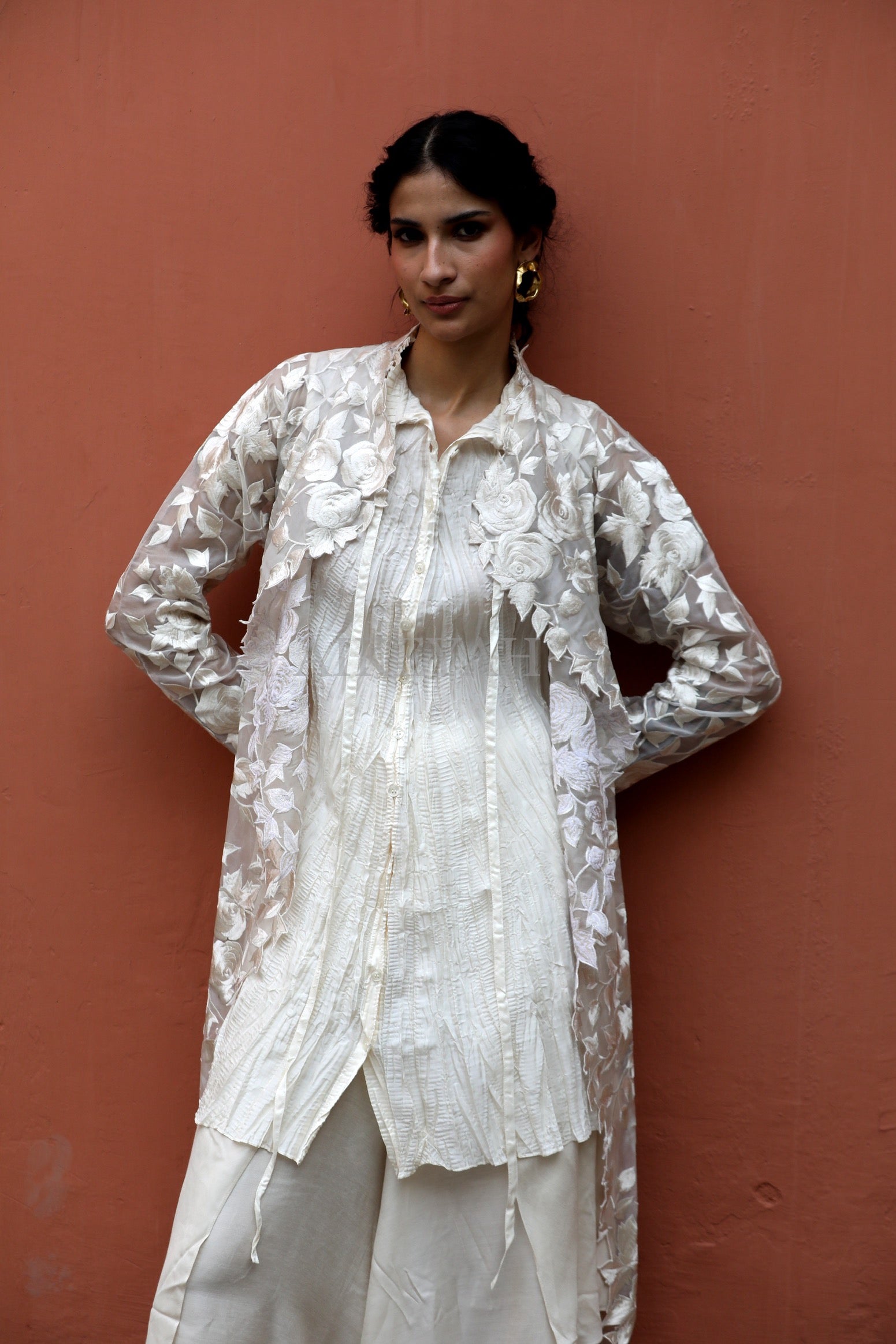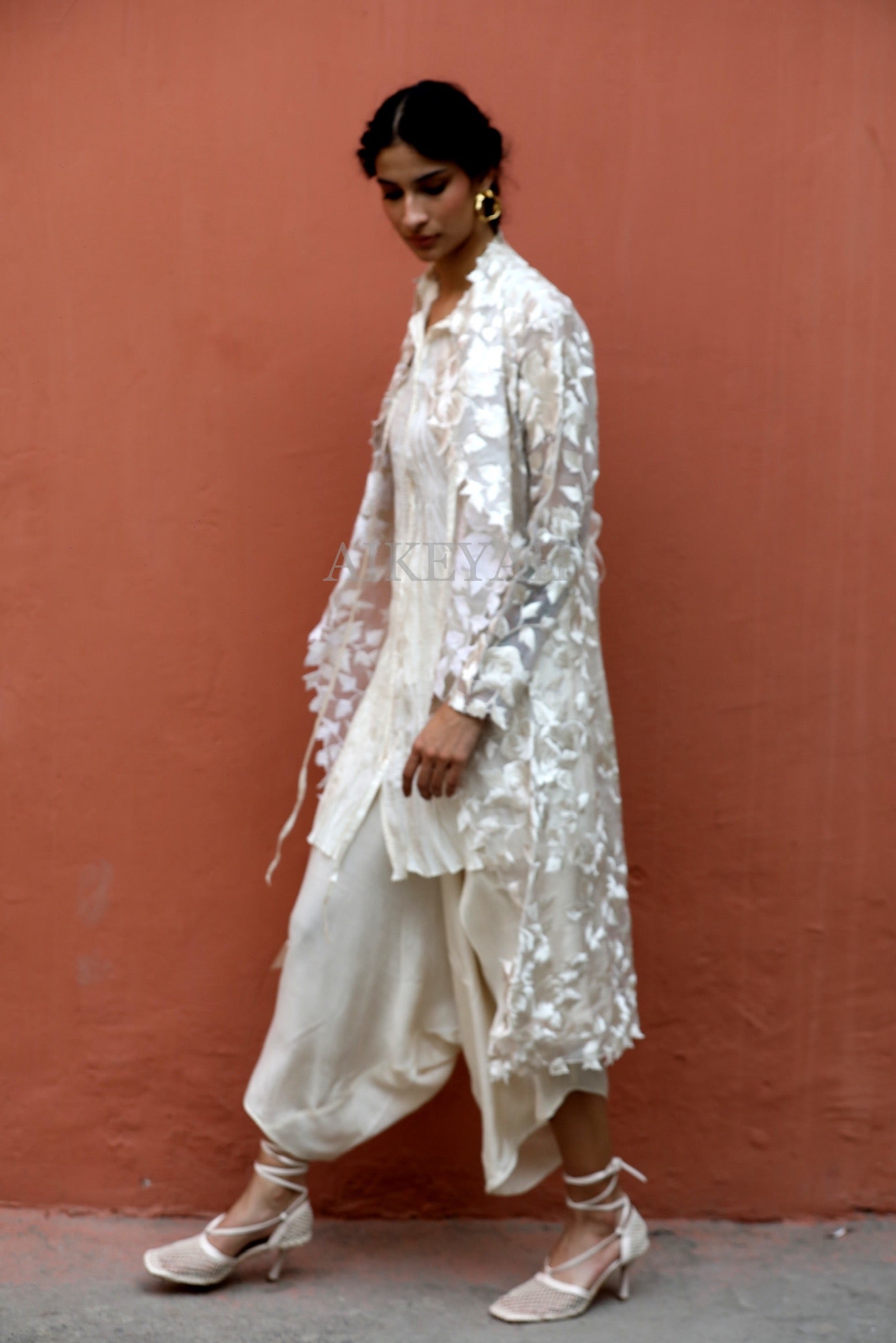 An Organza embroidered layover worn with a Crushed habutai silk shirt signature flap pants in shantung.