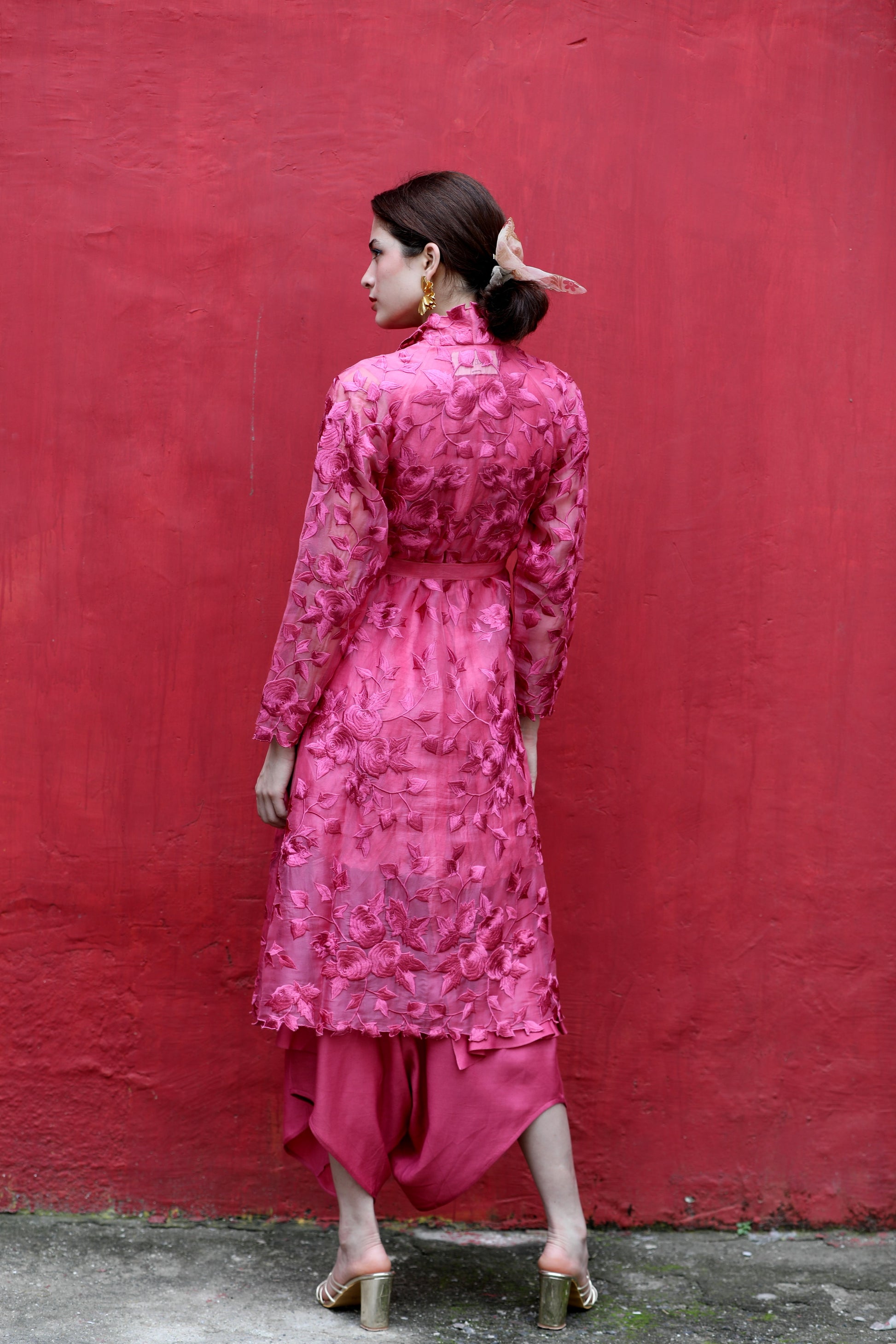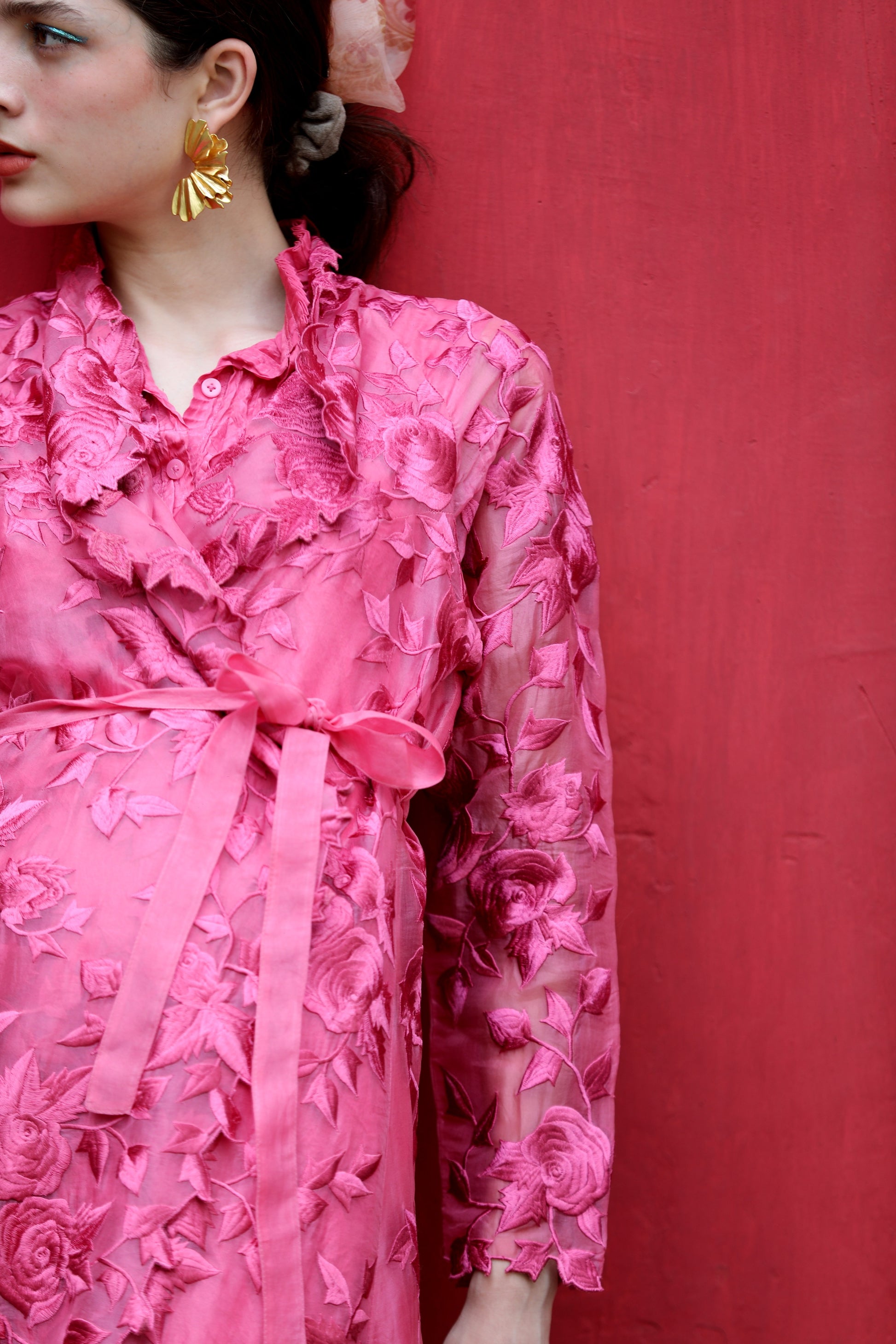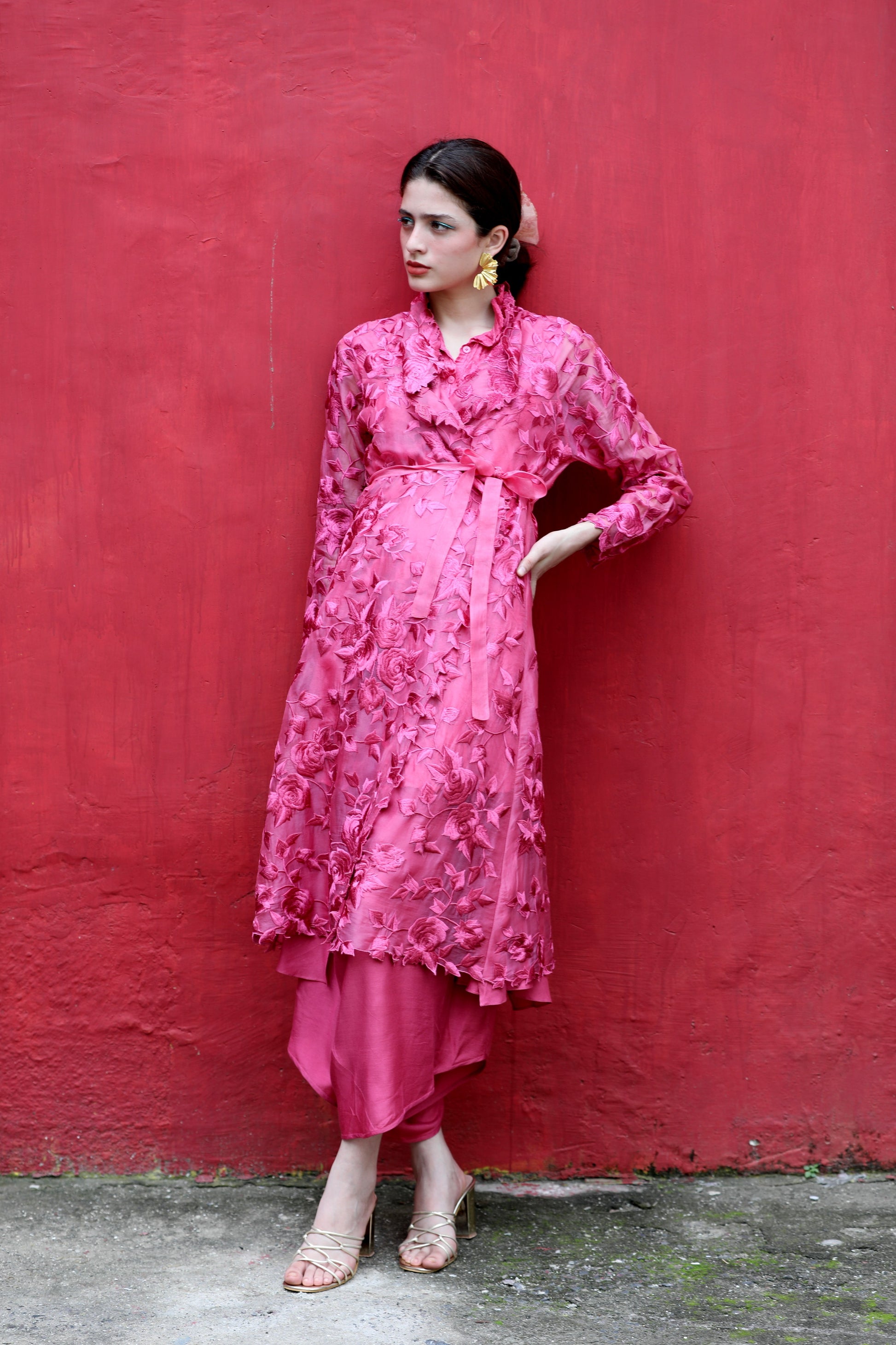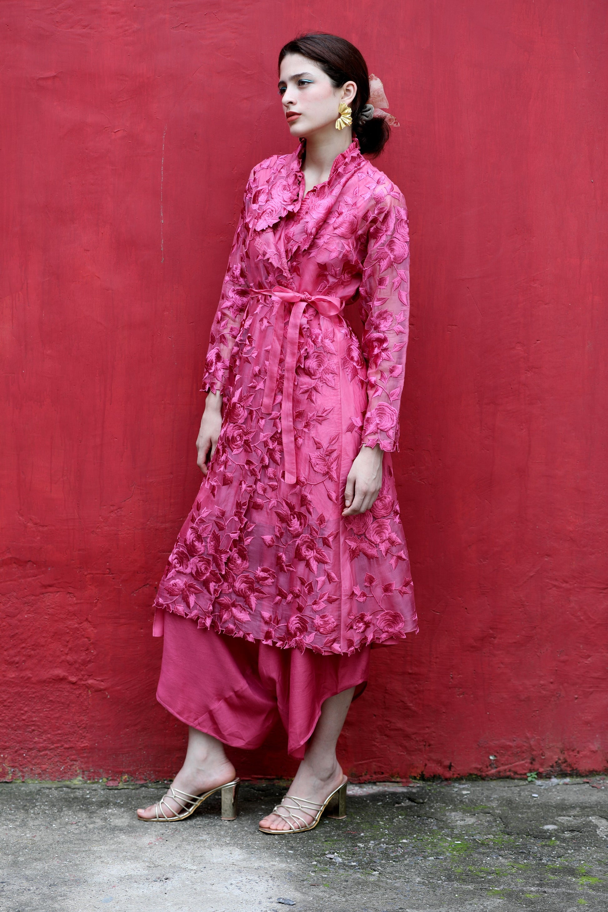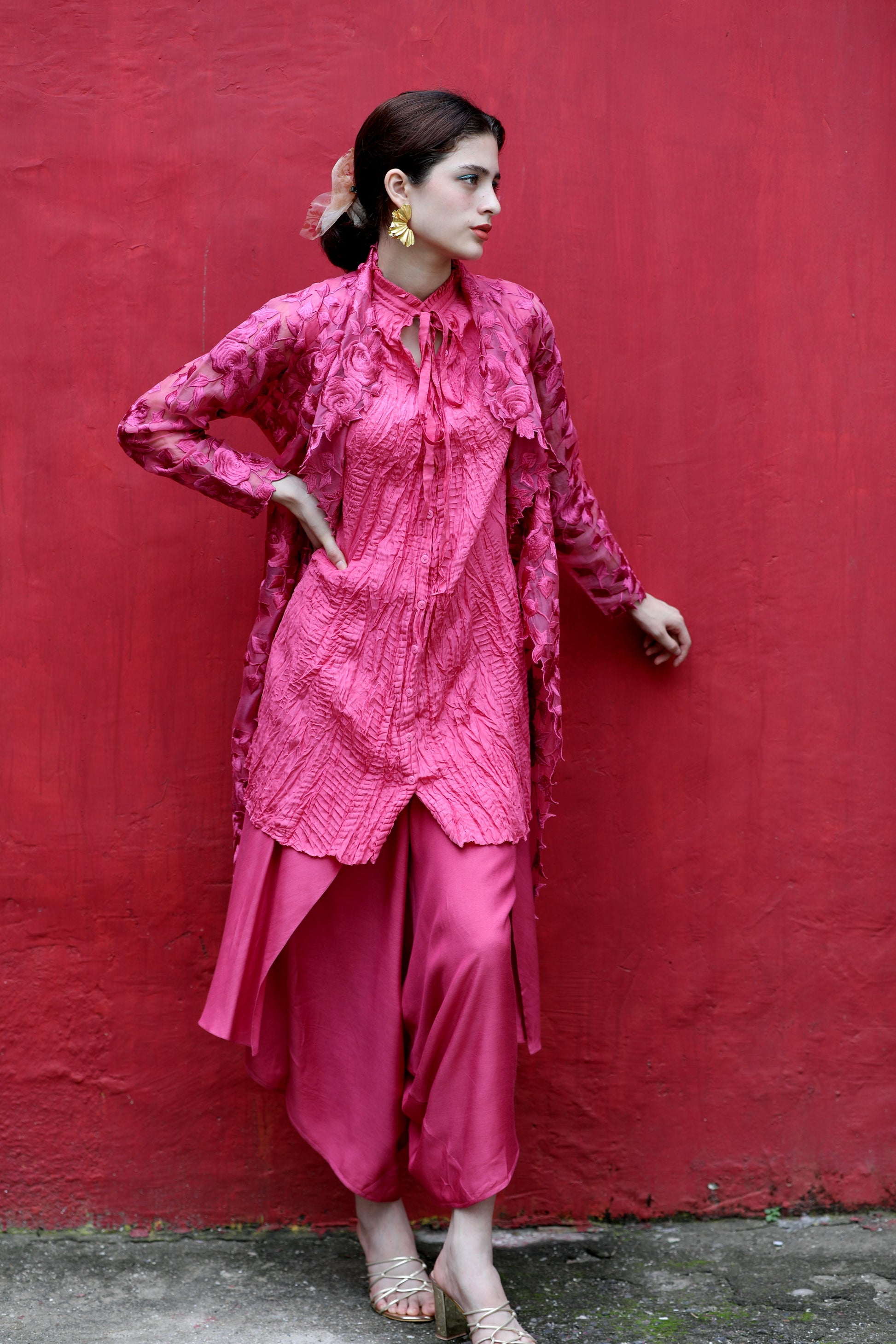 An Organza embroidered layover worn with a Crushed habutai silk shirt signature flap pants in shantung.