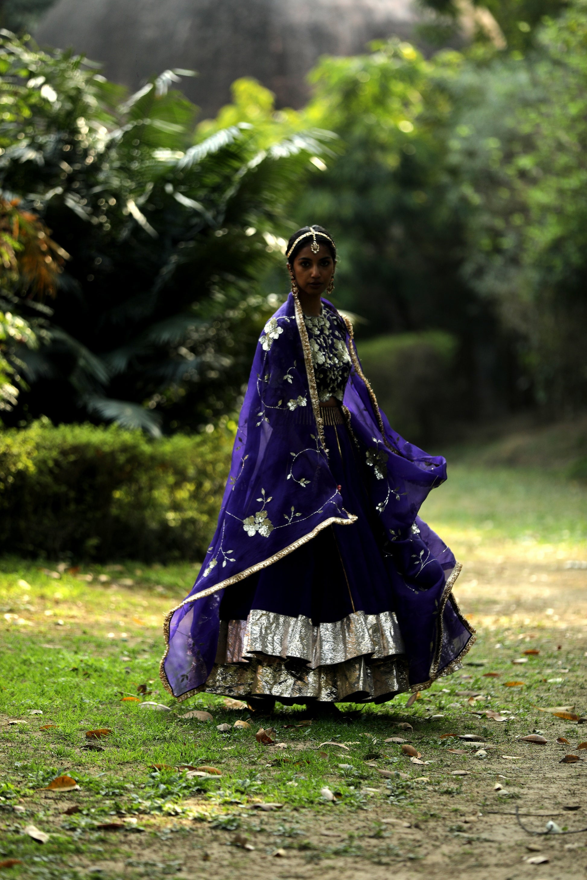 A brinjal purple Organza ankle length lehenga highlighted with double gota border worn with a chanderi hand embroidered blouse in sequins with an organza embroidered dupatta highlighted with kiran.