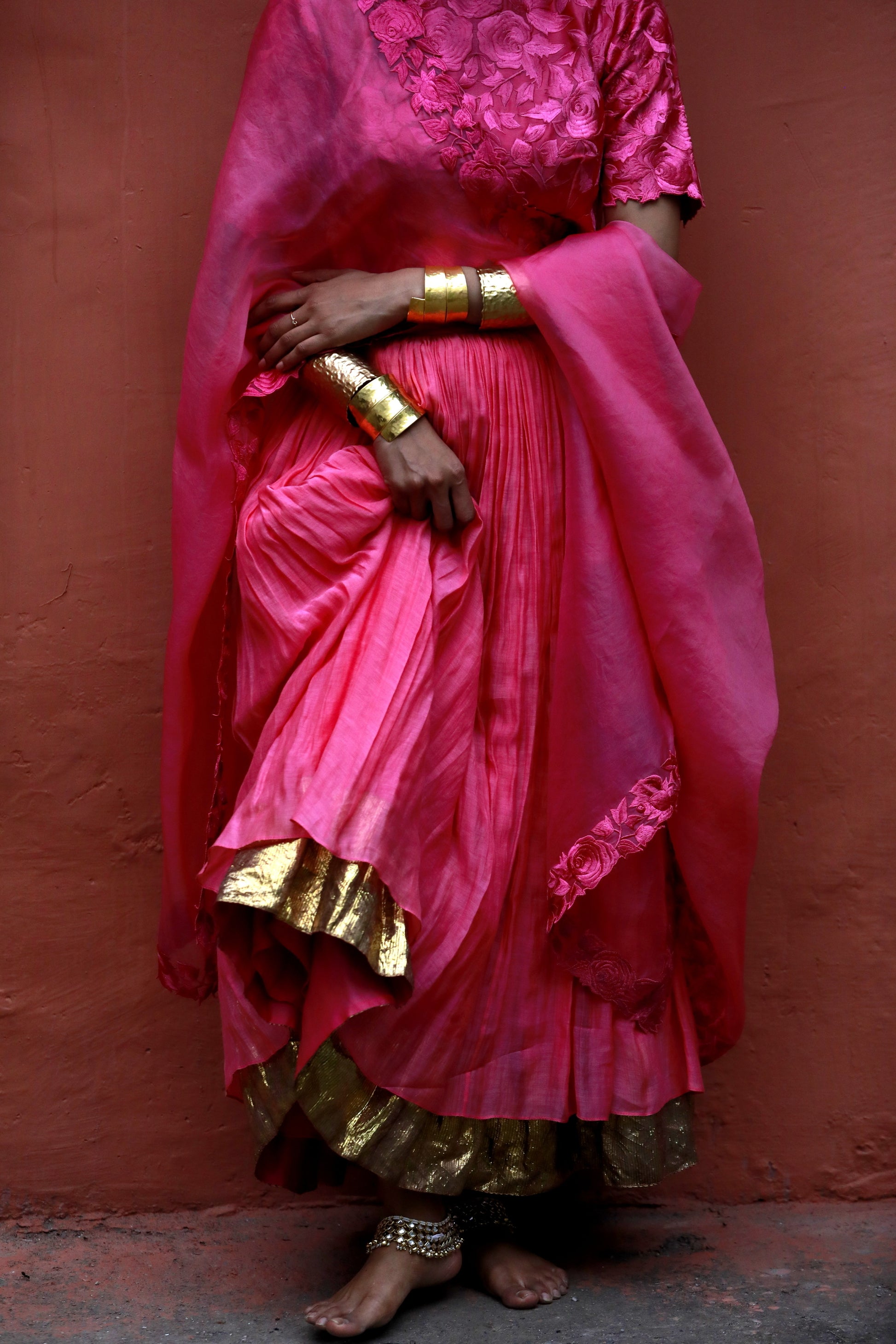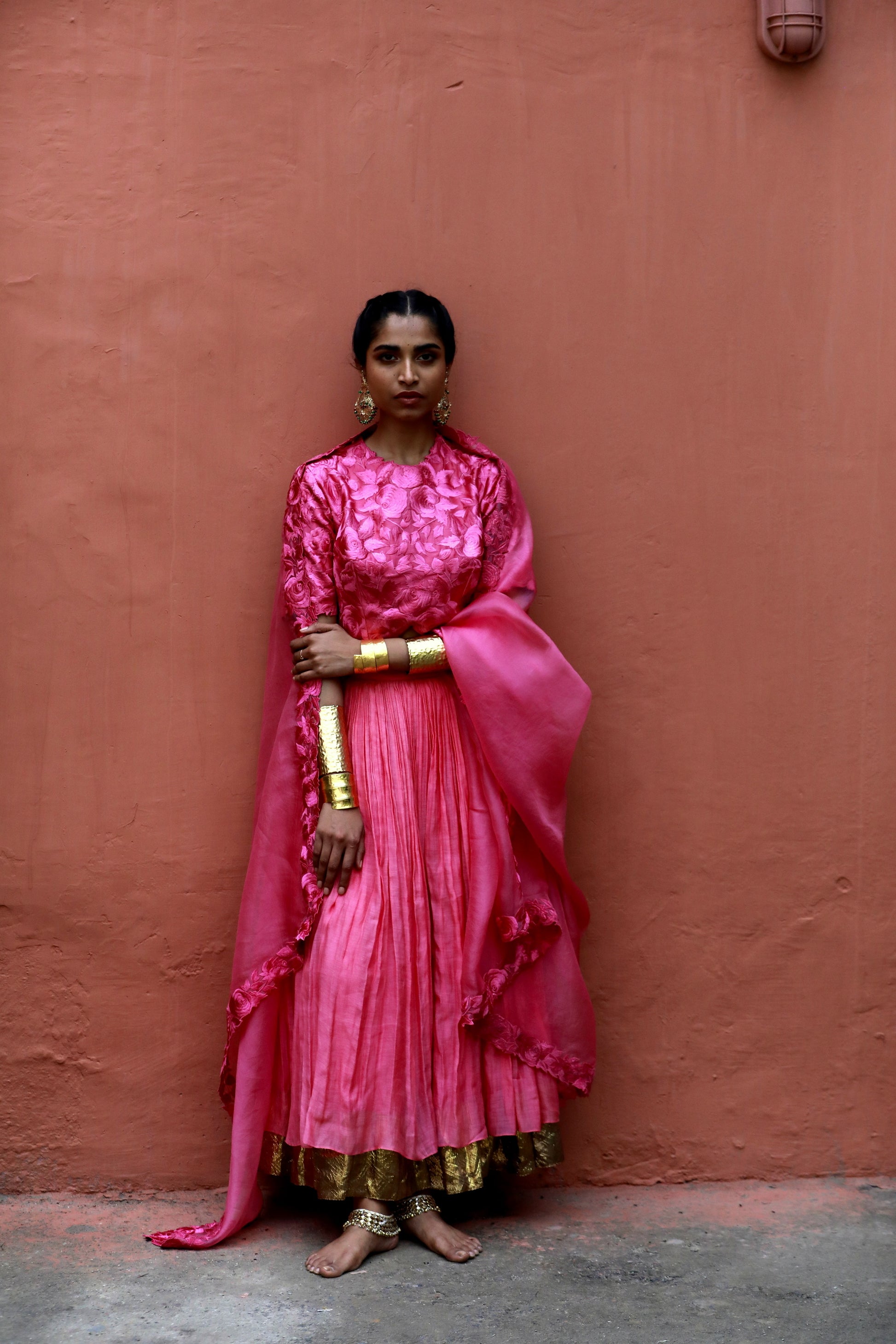 A chanderi gathered pleats ghagra highlighted with gota, worn with an embroidered chanderi blouse and an organza dupatta in signature floral embroidery, all in Gulabi Pink.