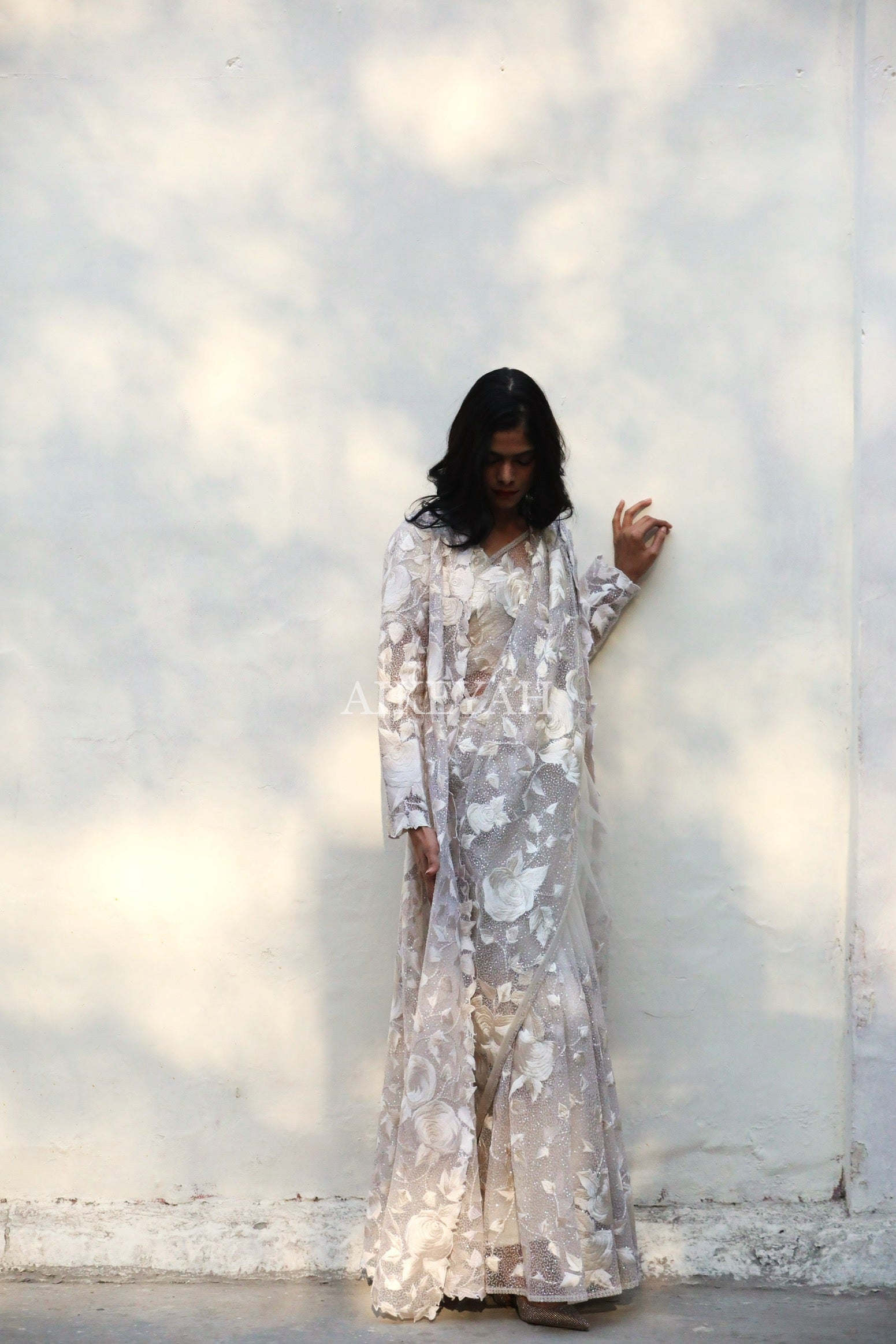 A tulle embroidered sari in signature roses and sequins worn with same blouse and a long lay over jacket.