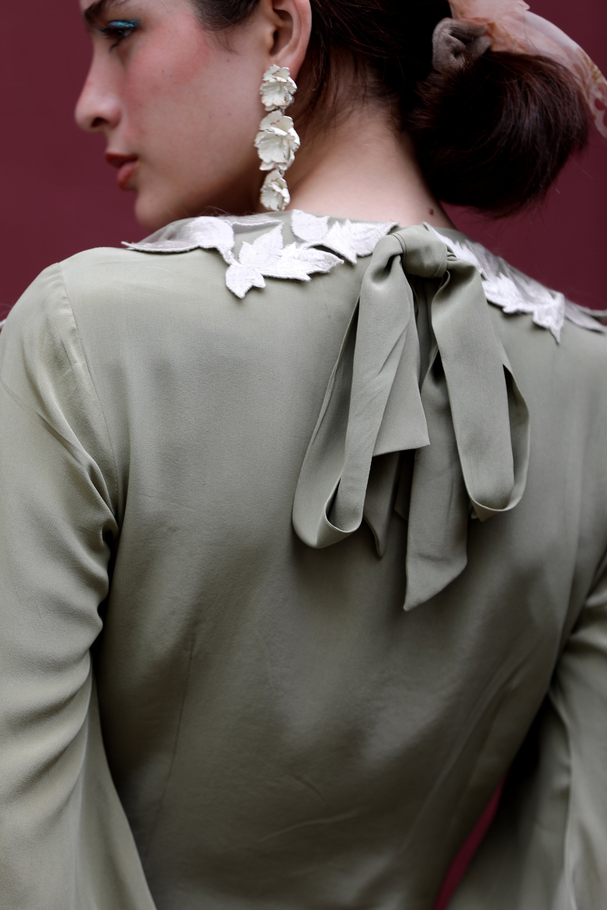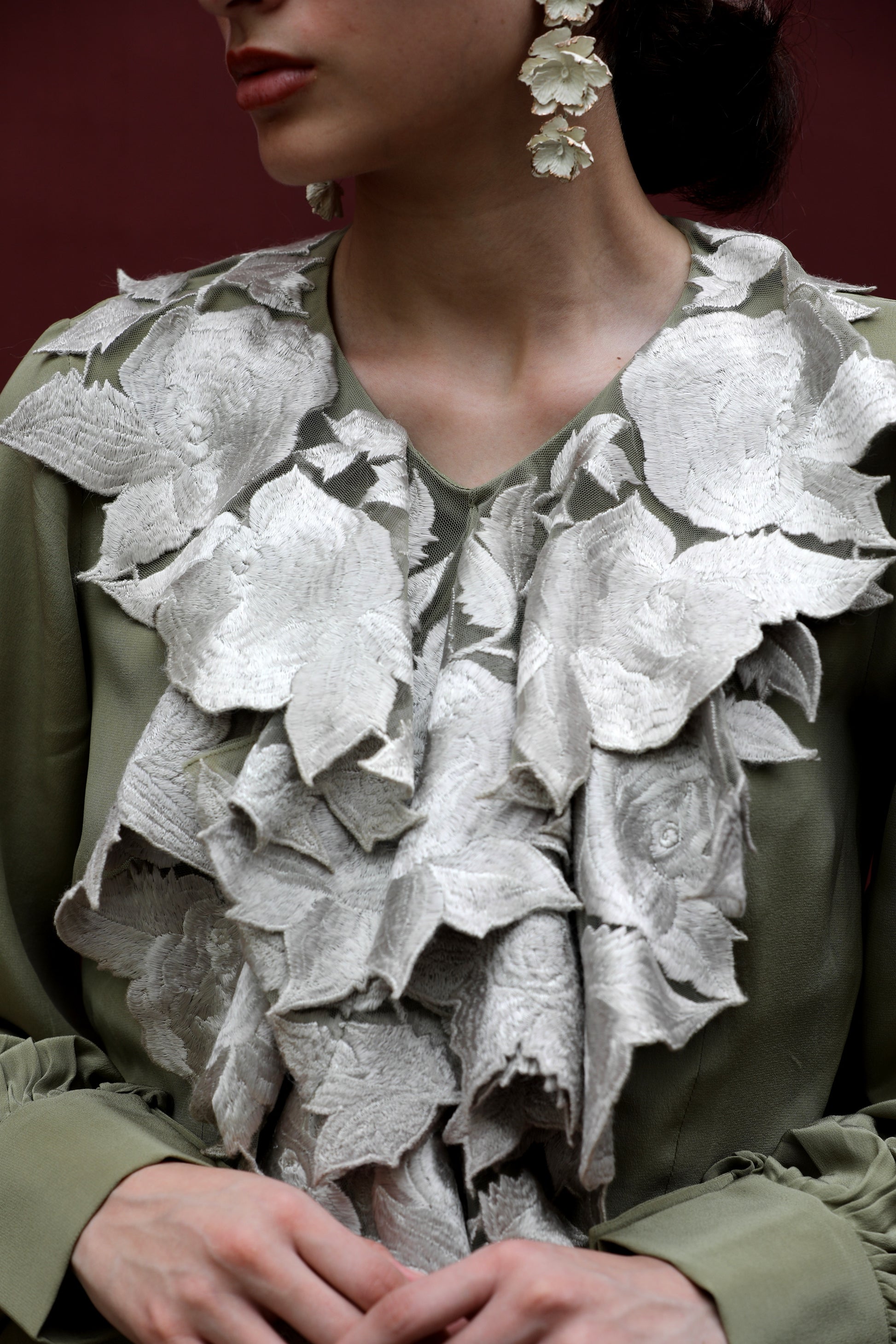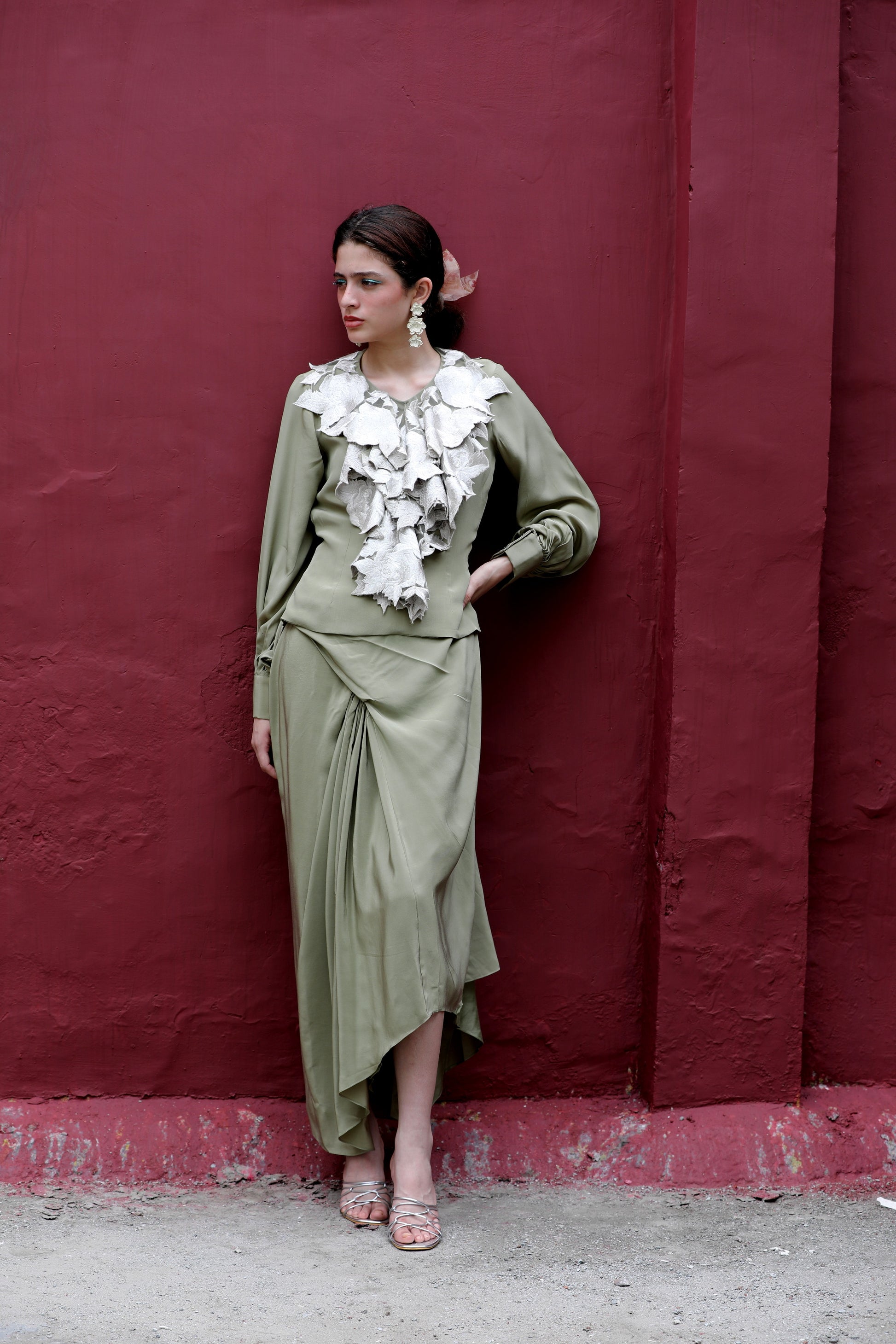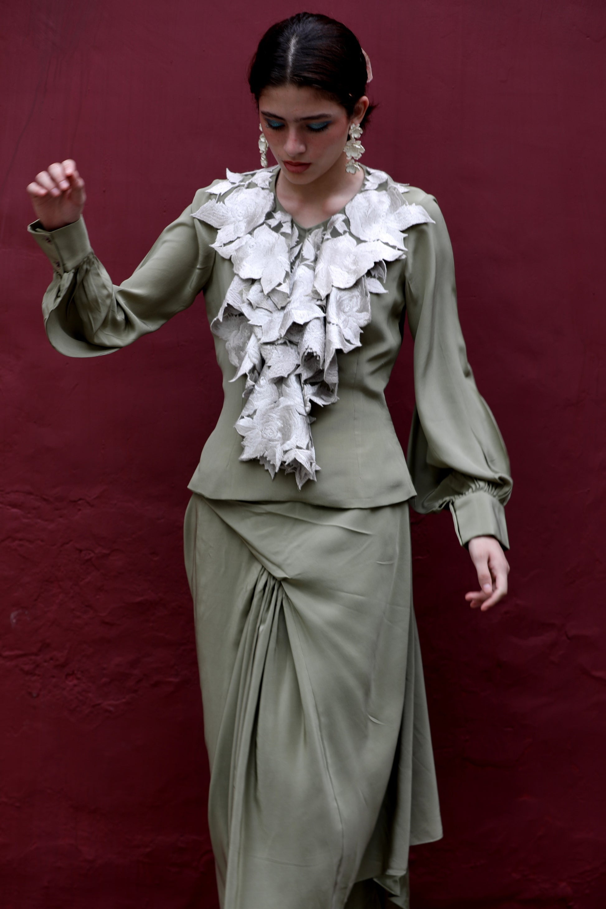 A Pastel green floral embroidered frill top worn with a drape skirt.