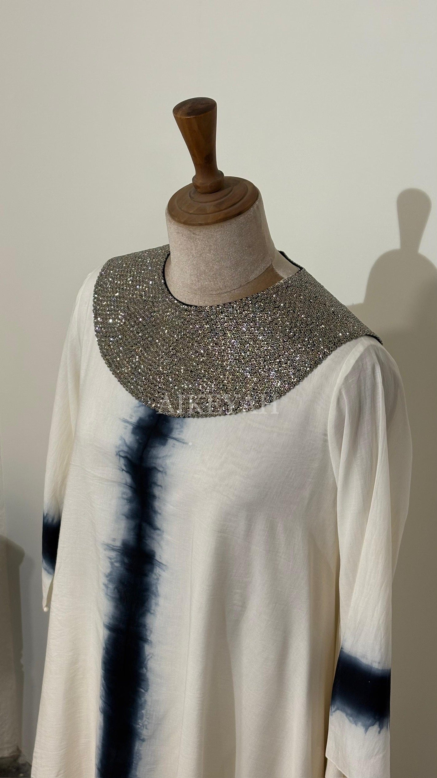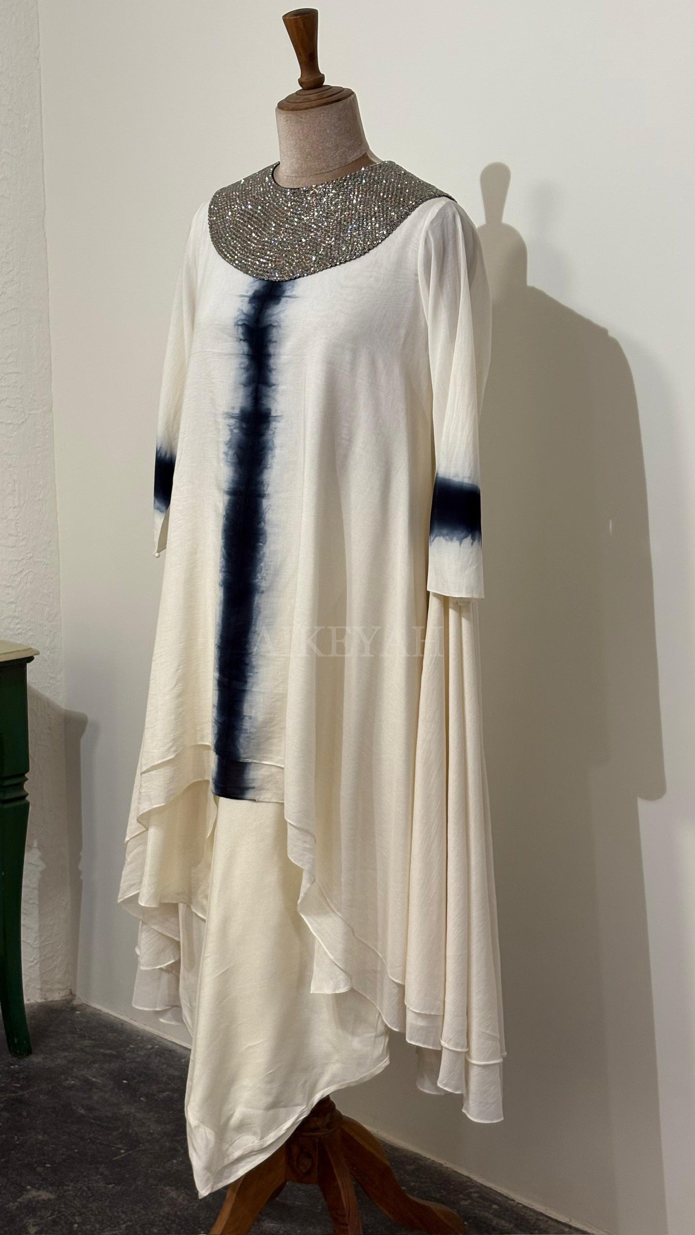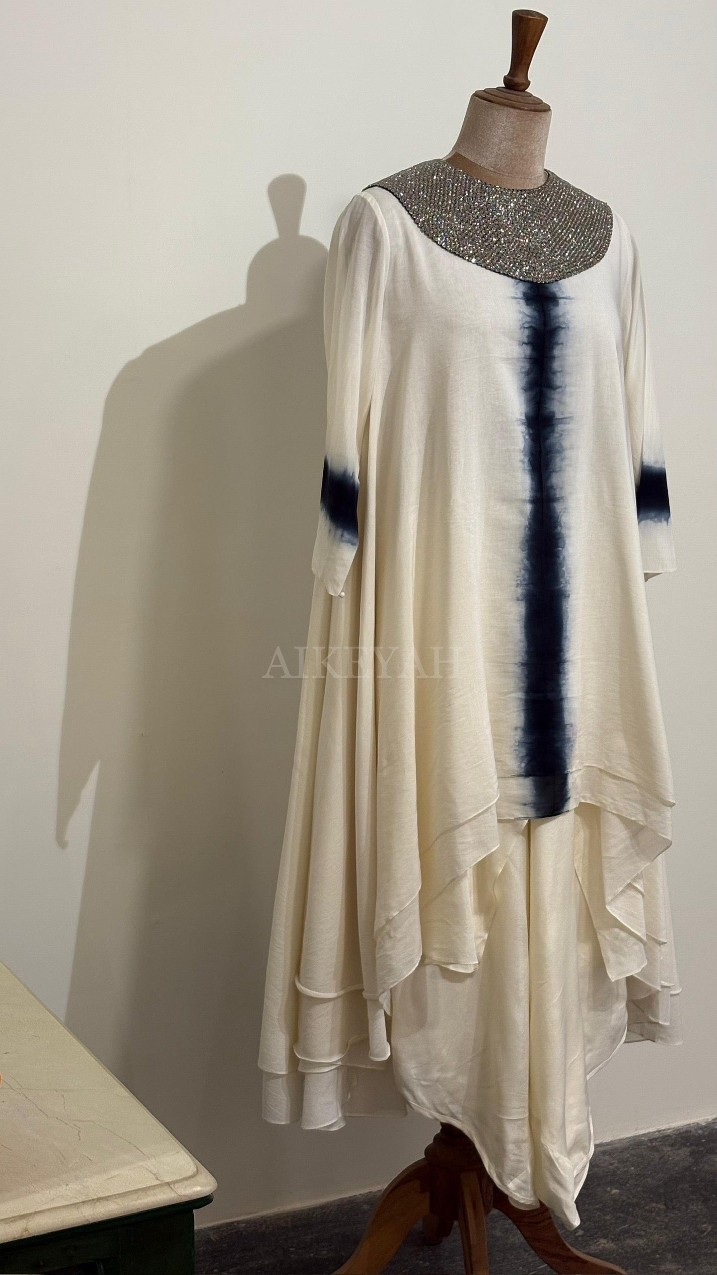A Shibori Colton silk tunic in ivory worn with signature flap pants and an embroidered collar.