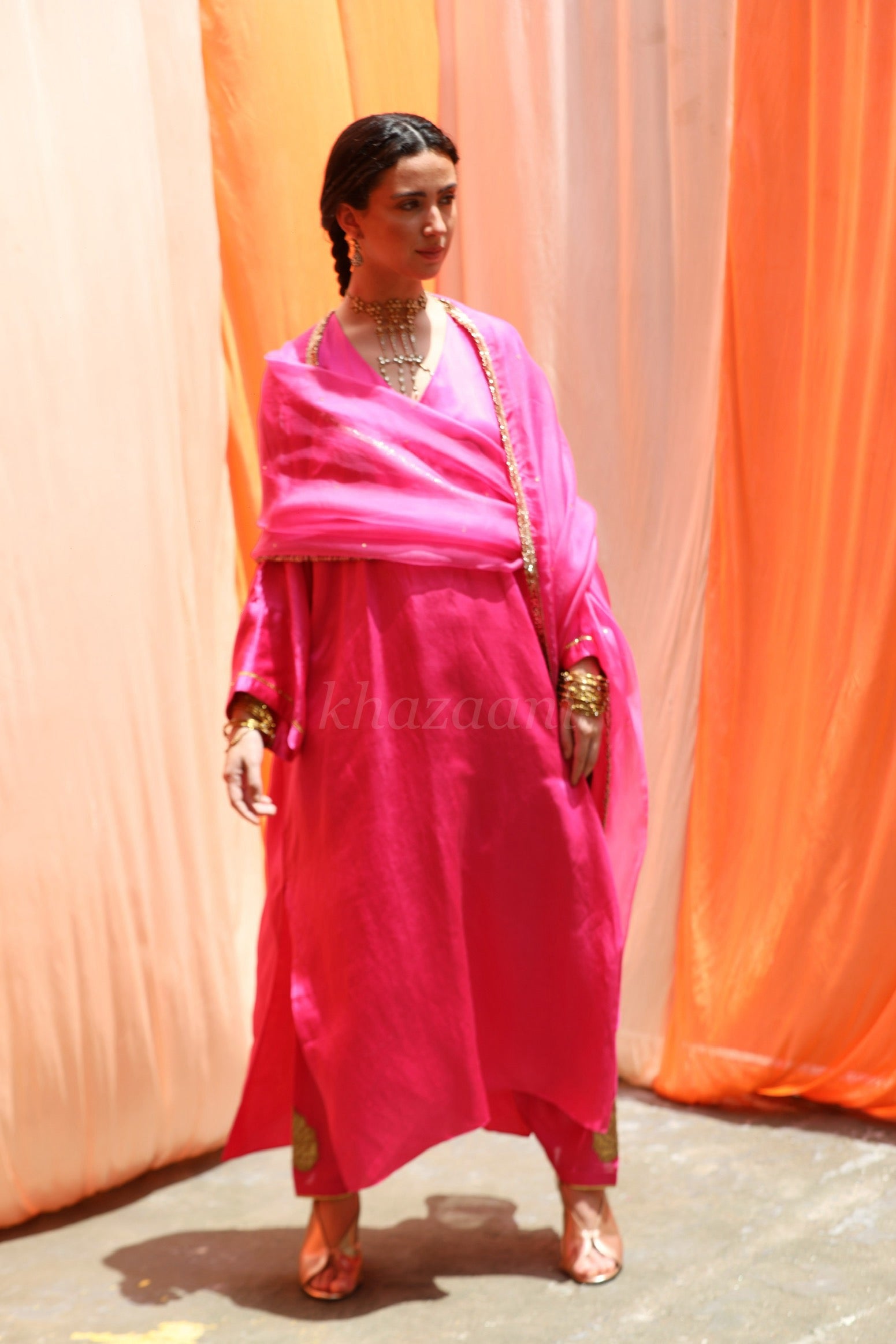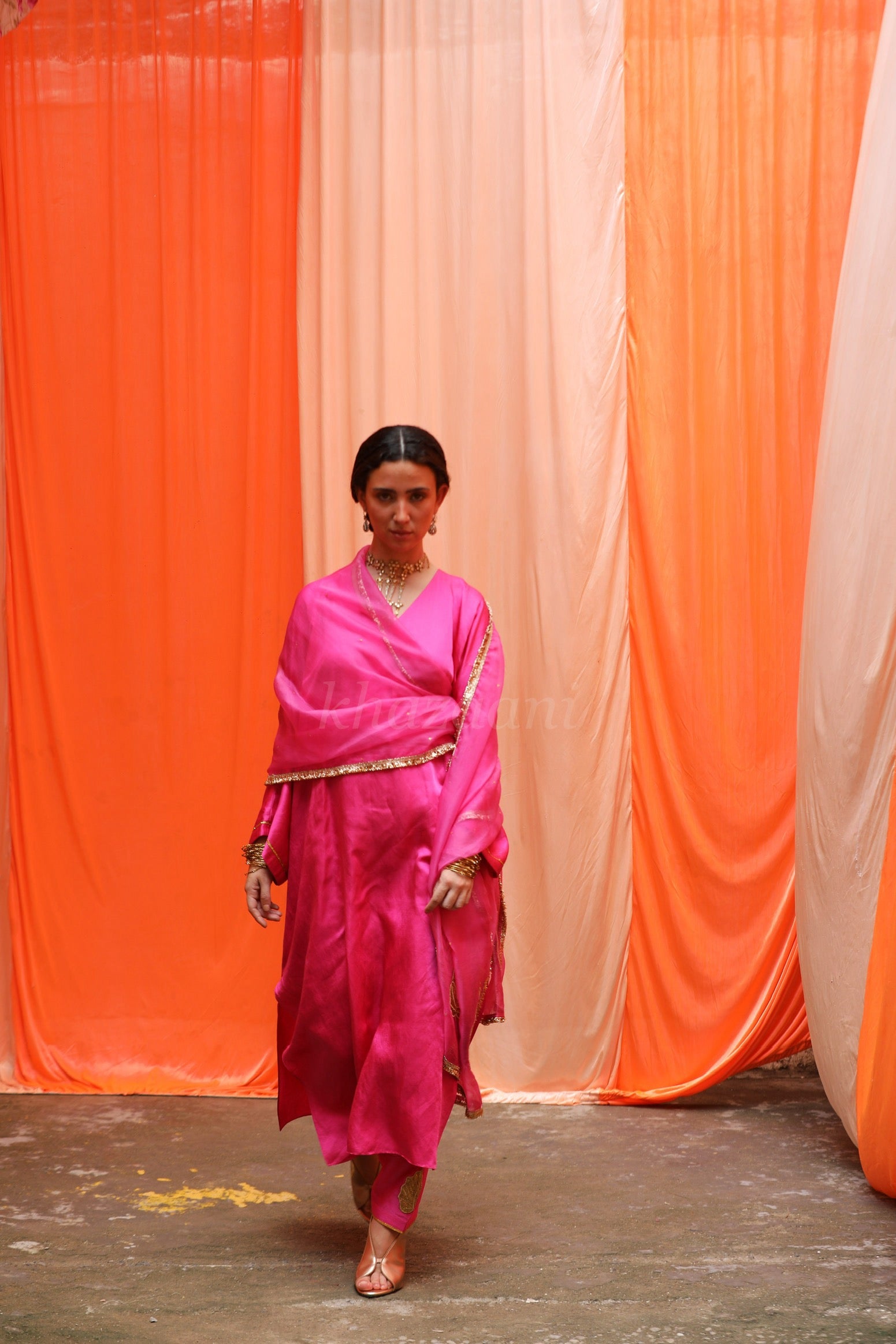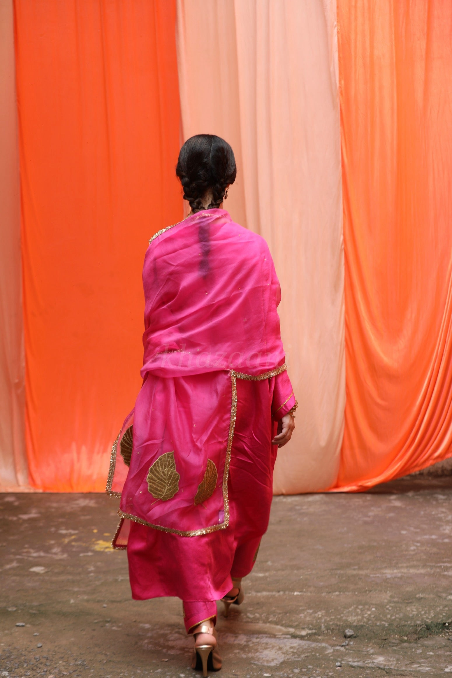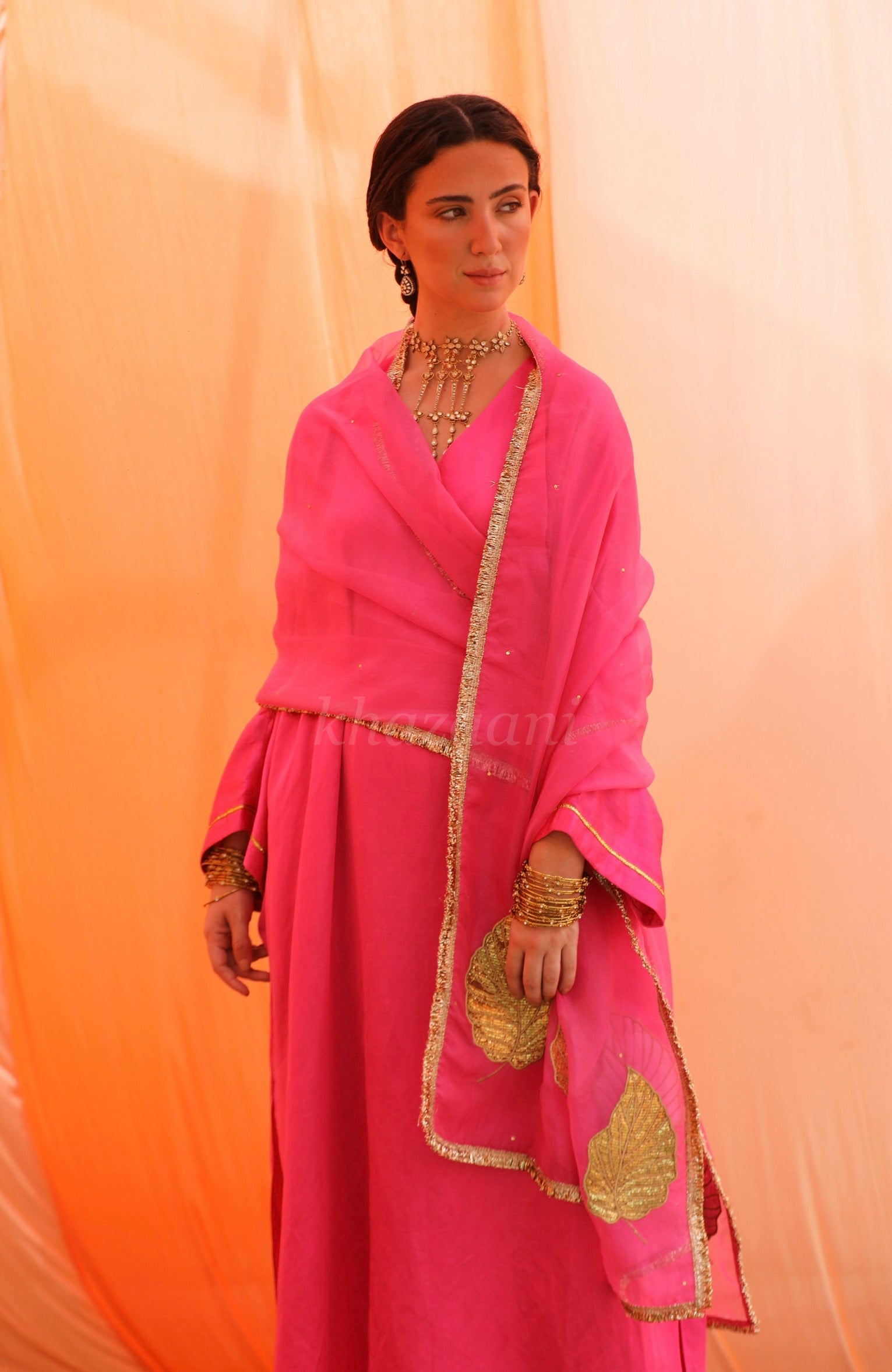 A satin silk kaftan kurta worn with salwar and an organza dupatta; highlighted with signature leaf motif and kiran.